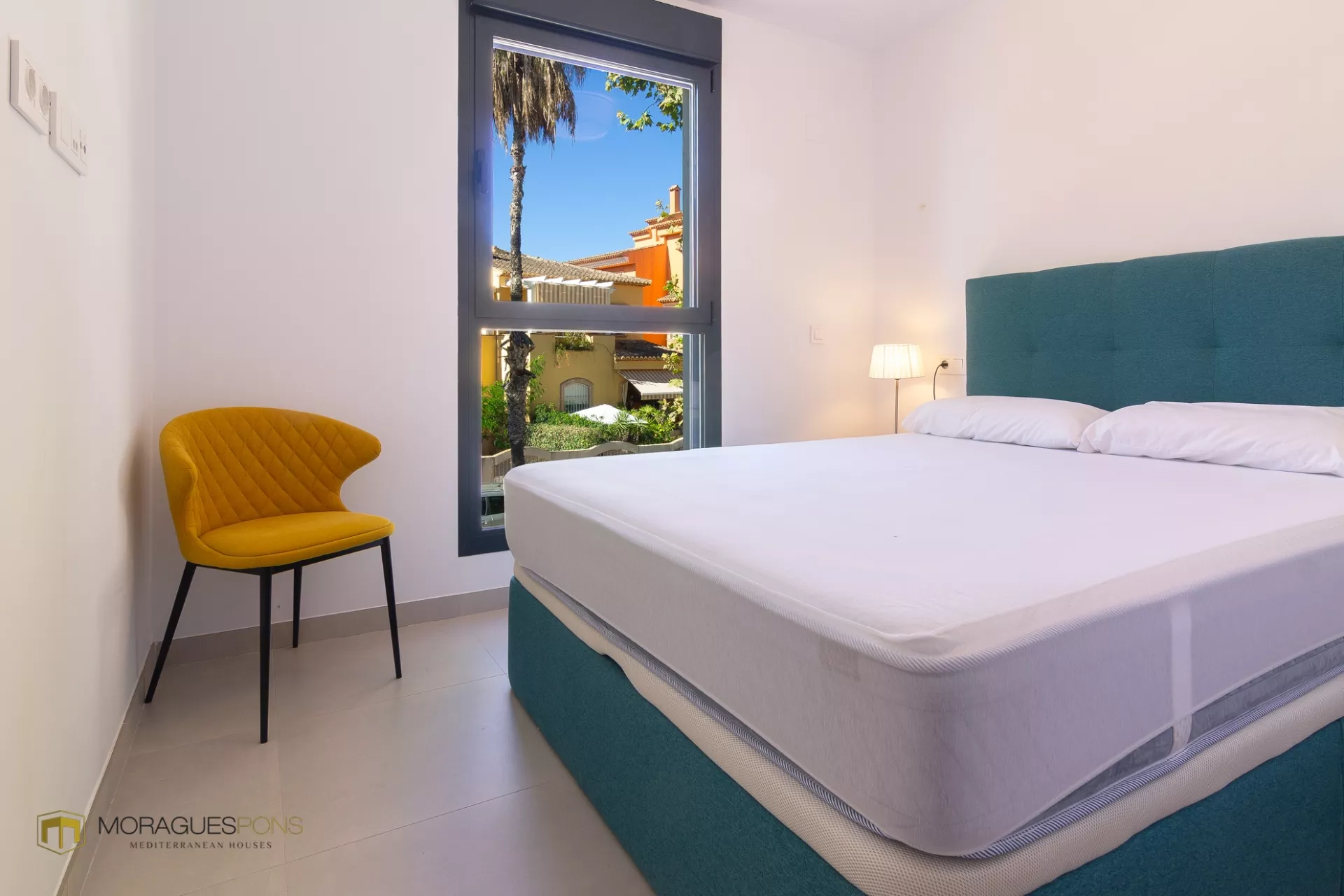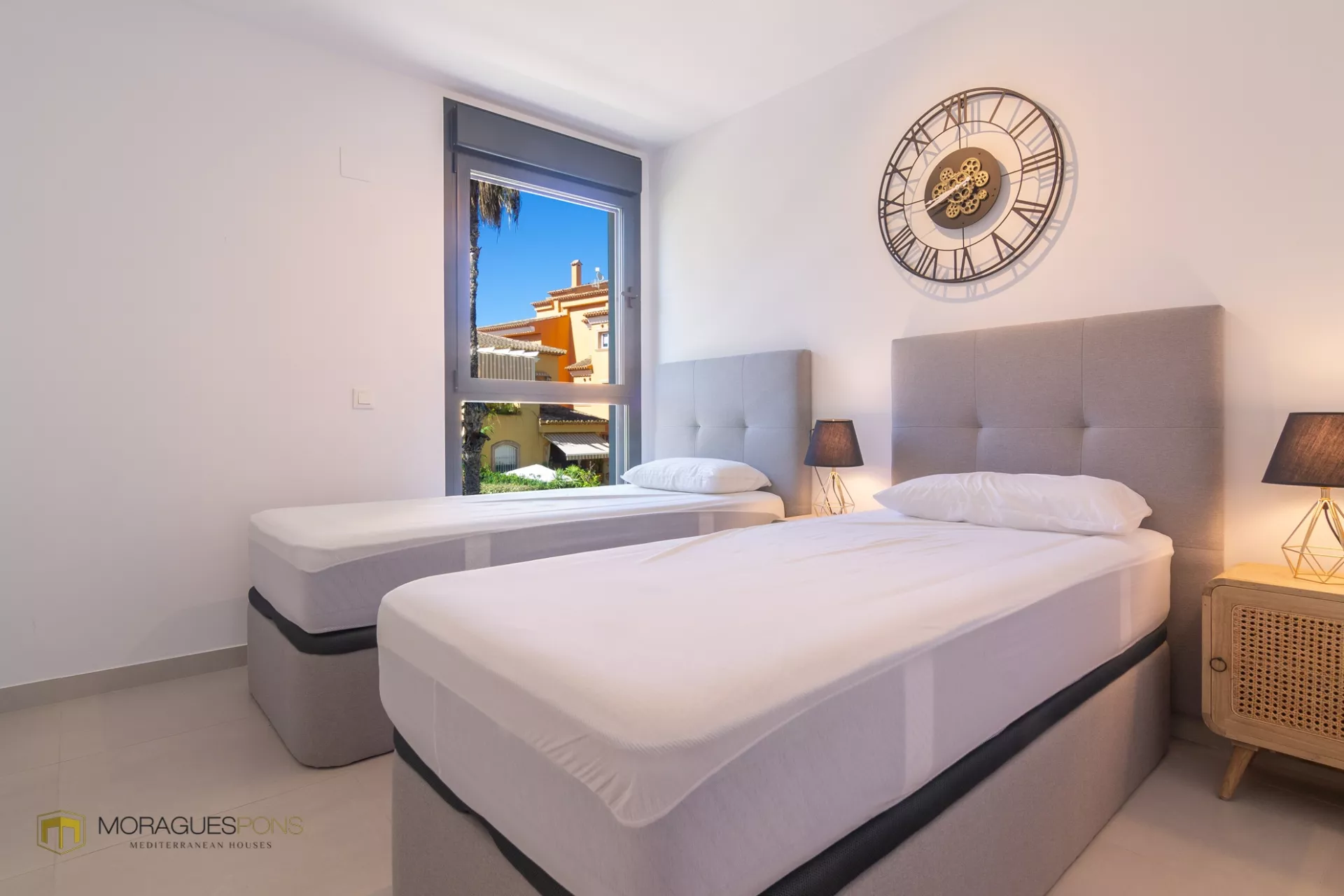 Líneas rectas, blanco y gris, el azul del agua y el verde de la vegetación. Elegante y sencillo. A un paso de la playa y junto al canal. Una espaciosa terraza para inolvidables cenas de verano y una piscina para refrescarse en tardes calurosas