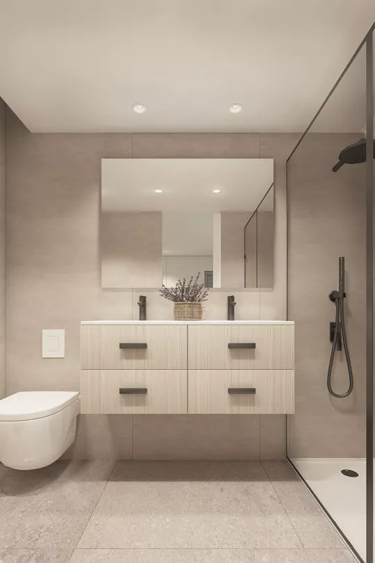 Bäder mit hängenden oder bodenstehenden Toiletten mit integriertem Spülkasten, Waschbecken des Modells ROCA MERIDIAN oder ähnlich.