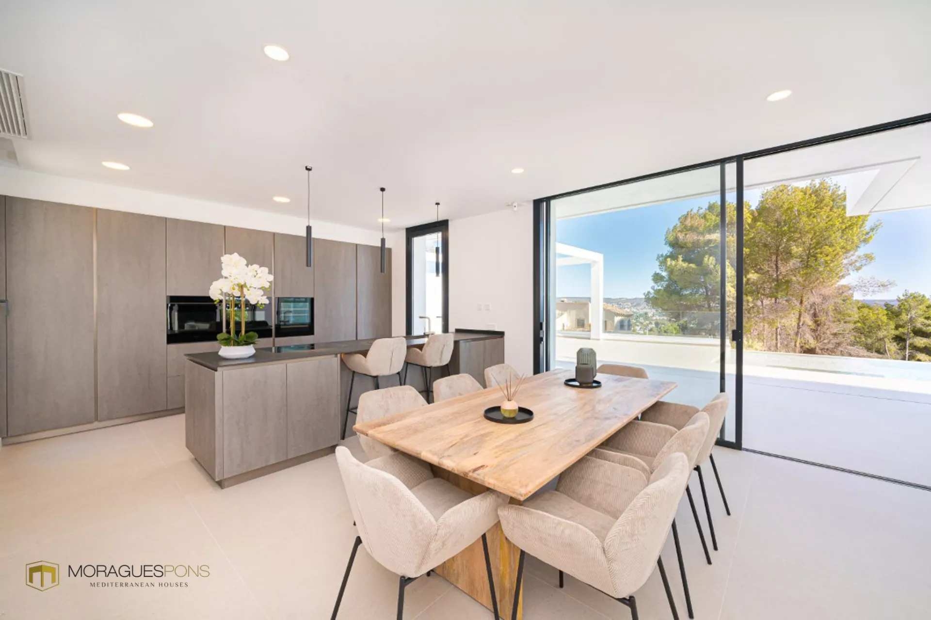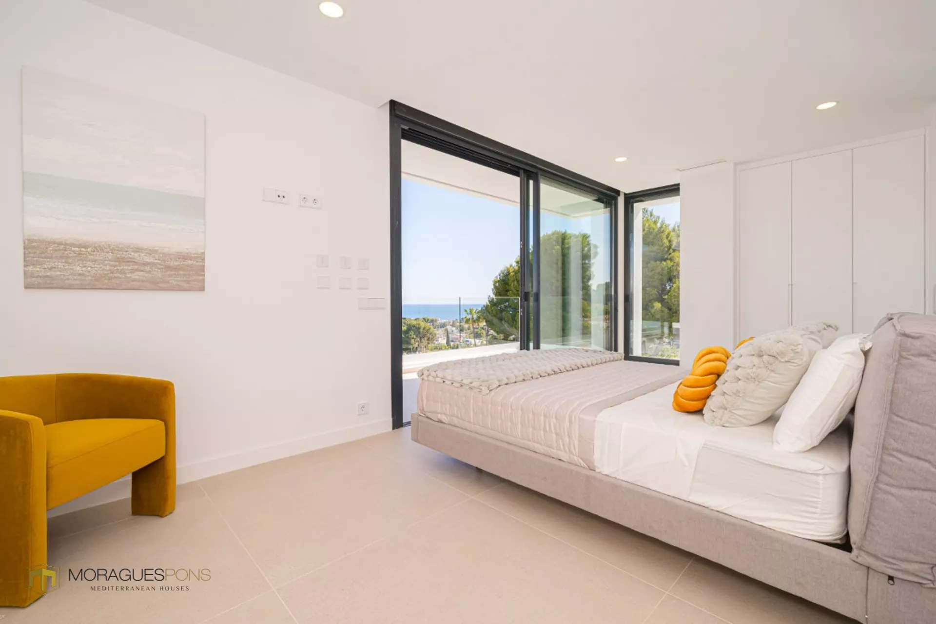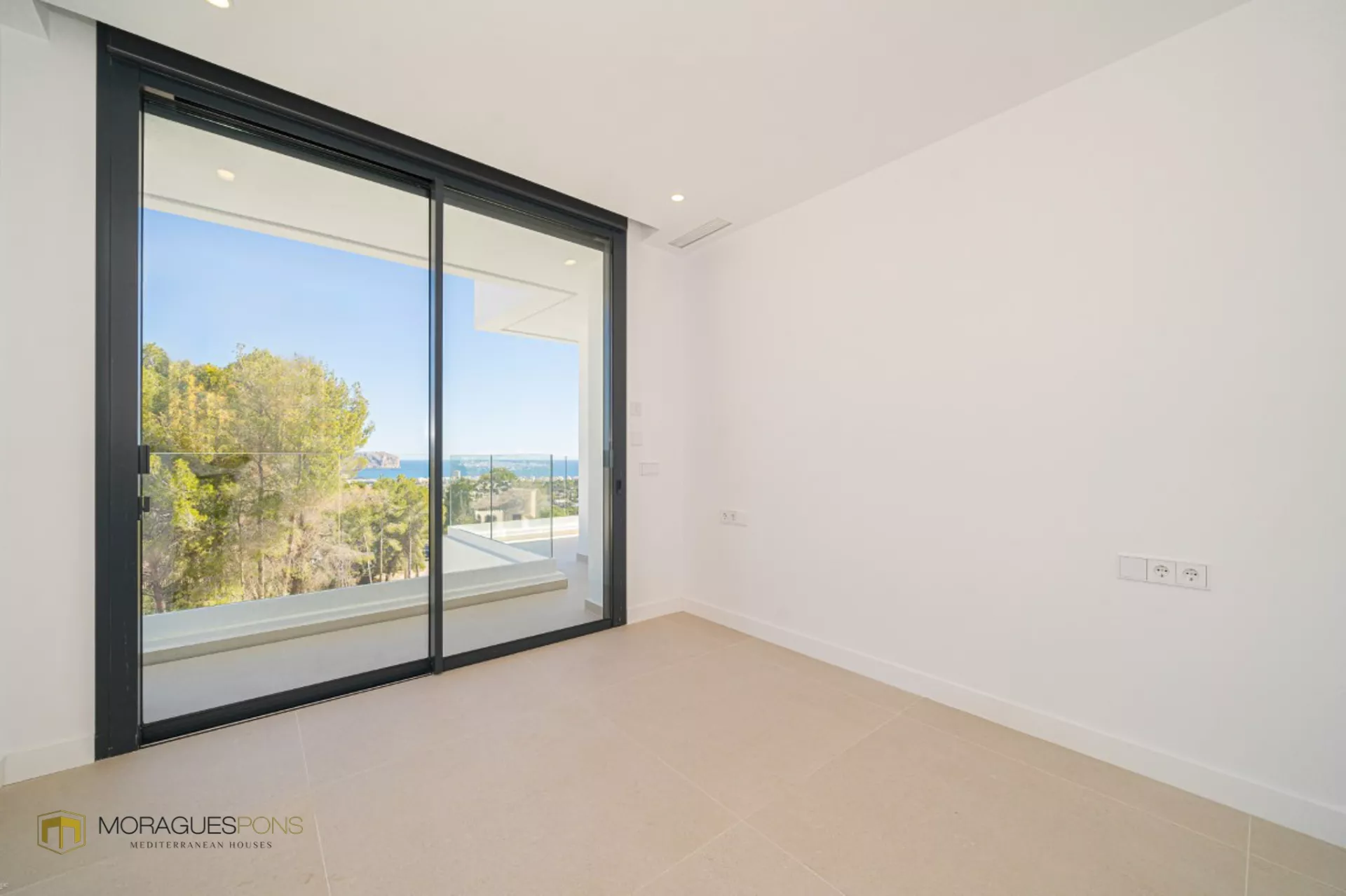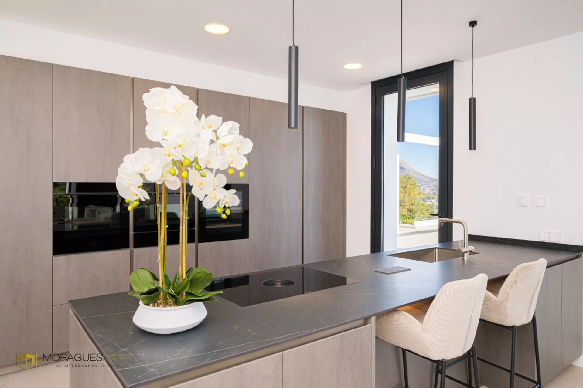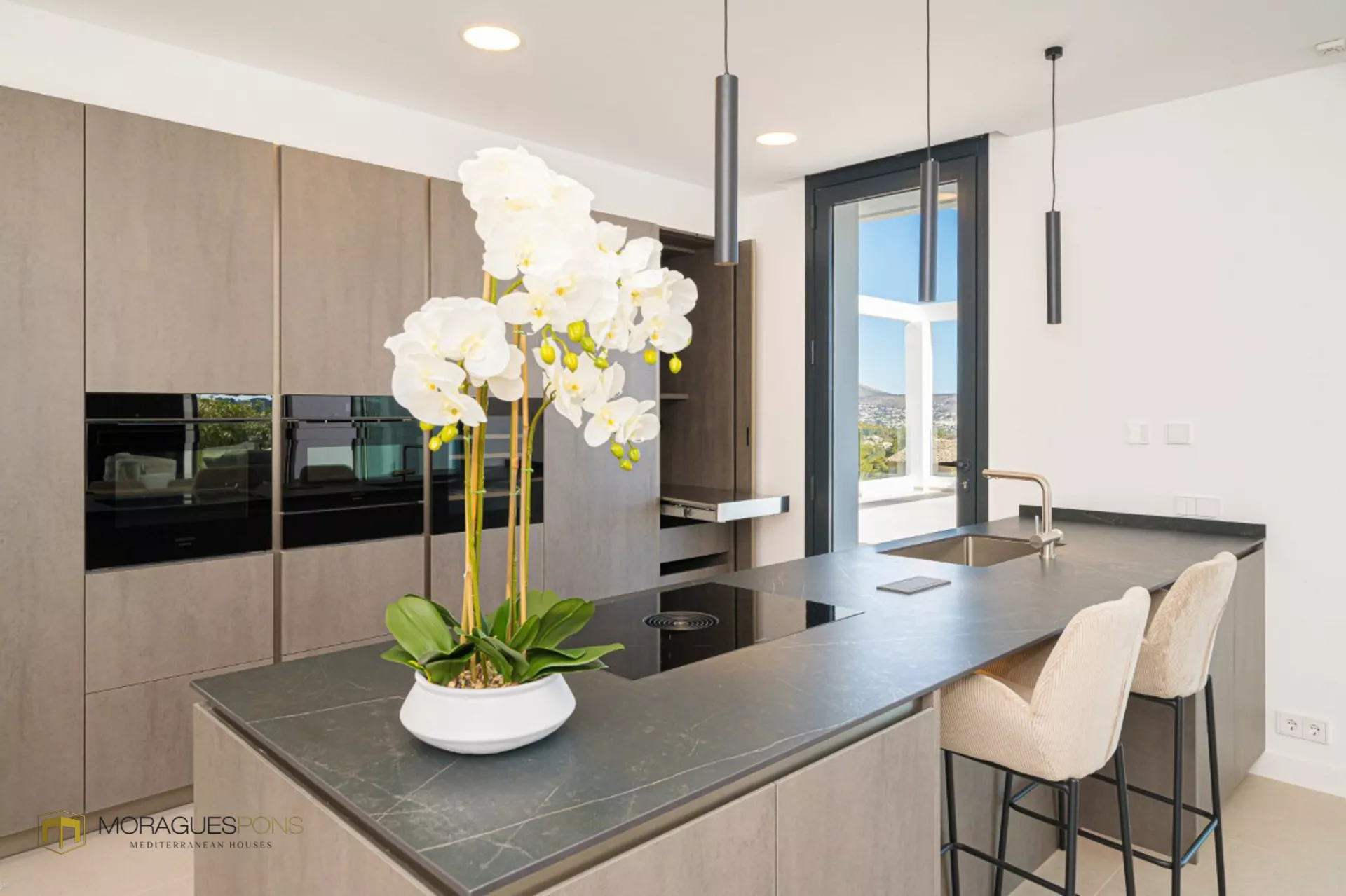 Die Villa erstreckt sich über 3 Etagen, die durch eine interne Treppe und einen Aufzug für 4 Personen verbunden sind. Eine beeindruckende Eingangstür begrüßt Sie in einem geräumigen Wohn-Esszimmer mit einer luxuriösen offenen Küche mit Insel und integrierten Bosch-Geräten. Das Wohnzimmer verfügt über einen großen Einbauschrank für zusätzlichen Stauraum. Neben dem Eingang befindet sich ein elegantes Gäste-WC. Im ersten Stock befindet sich eine geräumige Master-Suite mit eigenem Bad mit Badewanne, Doppelwaschbecken und begehbarer Dusche. Darüber hinaus gibt es zwei weitere Doppelschlafzimmer, jeweils mit eigenem Bad. Alle Schlafzimmer haben Einbauschränke und Zugang zu einem Balkon. Die extra hohen Fenster (2,8 m) bieten aus allen Blickwinkeln einen spektakulären Blick auf das Meer und den Montgó. Alle Türen reichen ebenfalls bis zur Decke. Im Souterrain befindet sich ein sehr geräumiges Schlafzimmer mit Doppelbett und eigenem Bad mit Doppeldusche und englischer Natursteinterrasse. Auf dieser Etage befinden sich auch eine Waschküche, ein Abstellraum, ein Mehrzweckraum, der nach Belieben eingerichtet werden kann (Fitnessraum, Heimkino, Arbeitszimmer usw.), ein Technikraum und eine sehr große Garage von fast 100 m2.