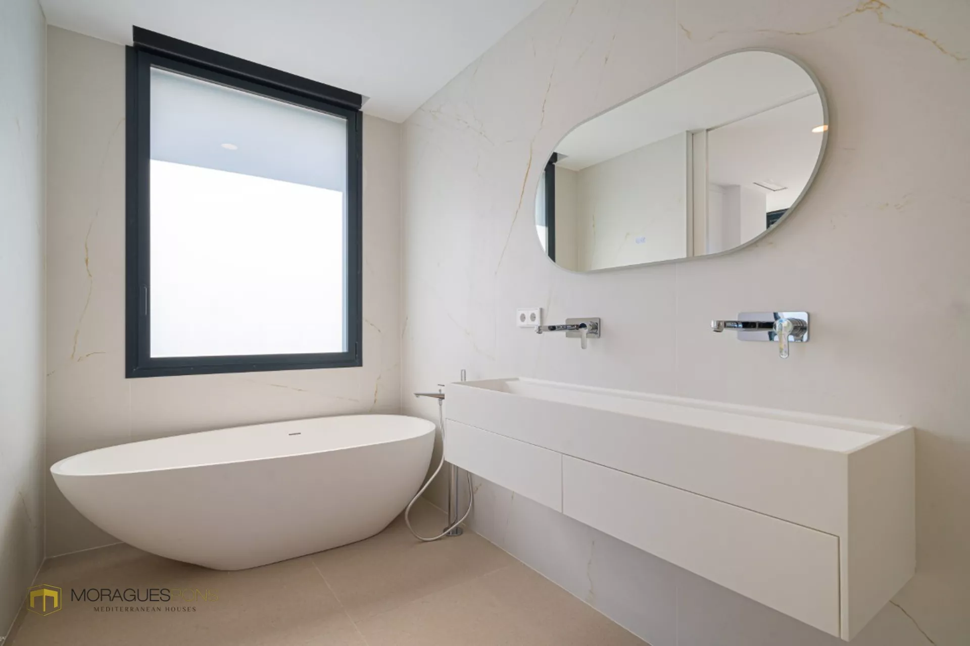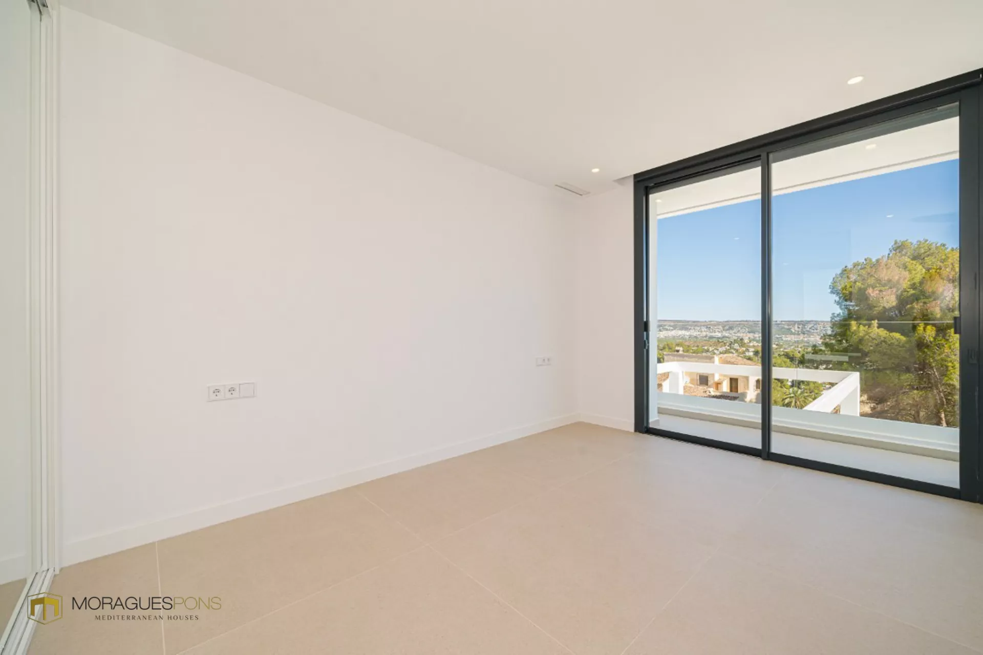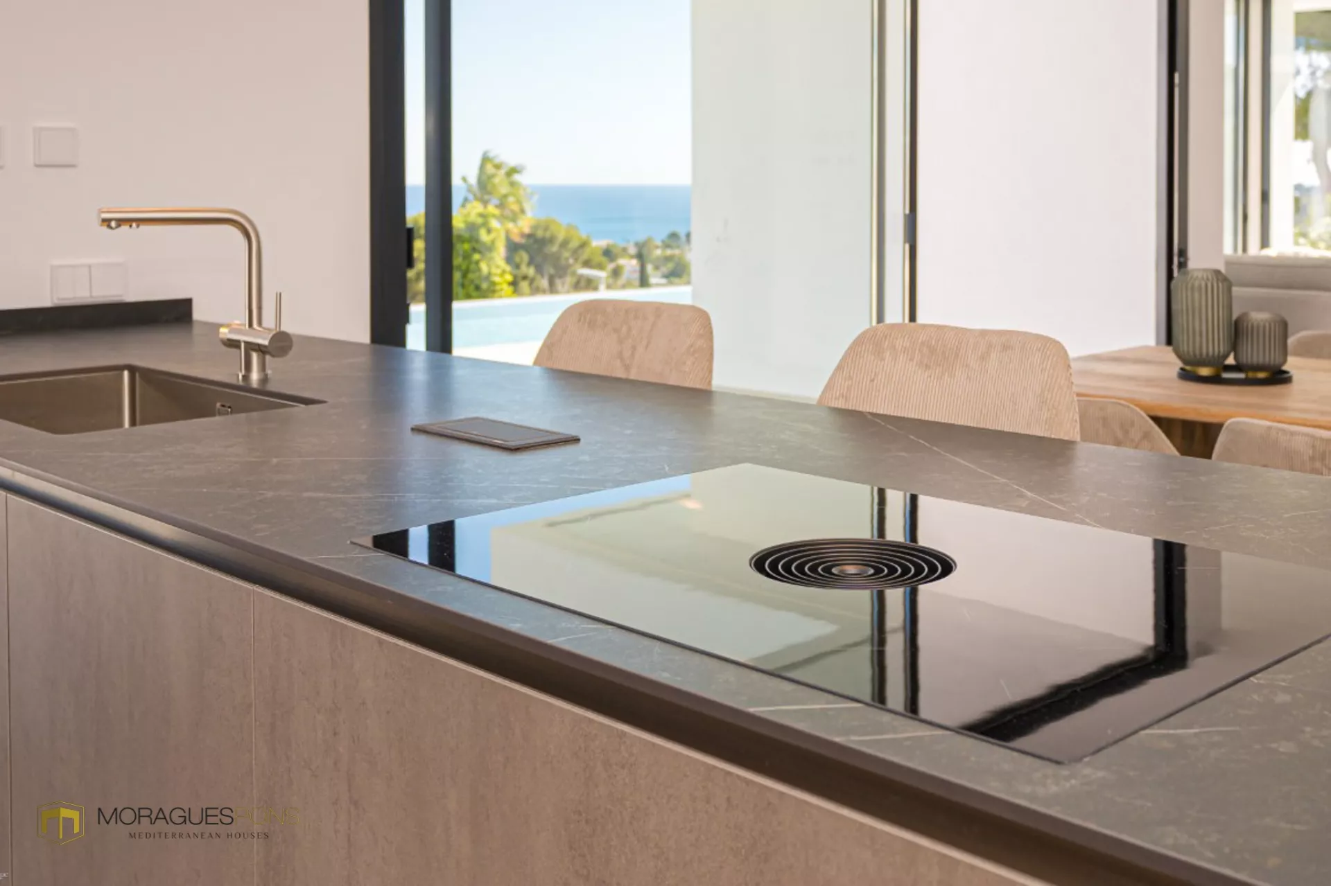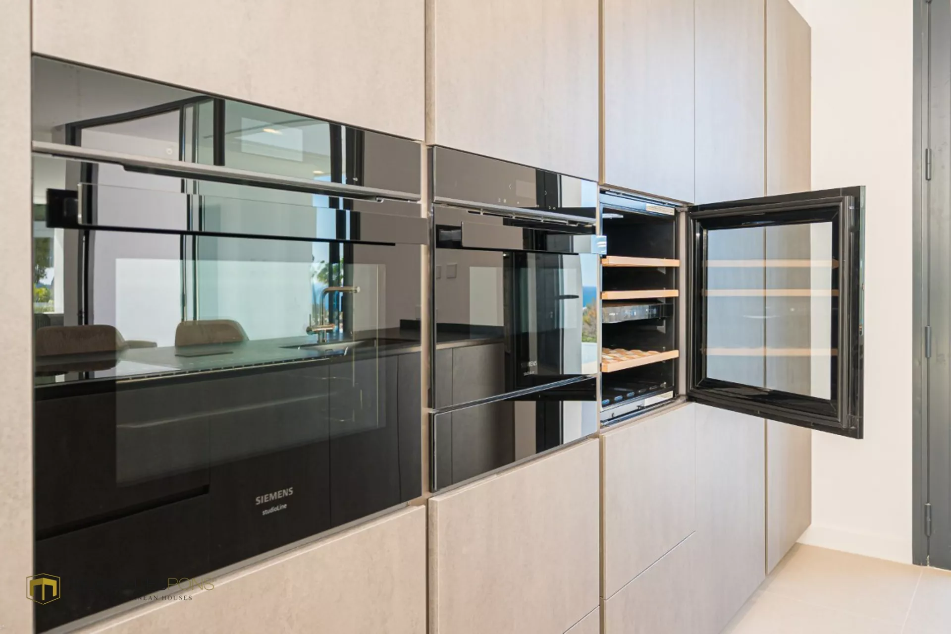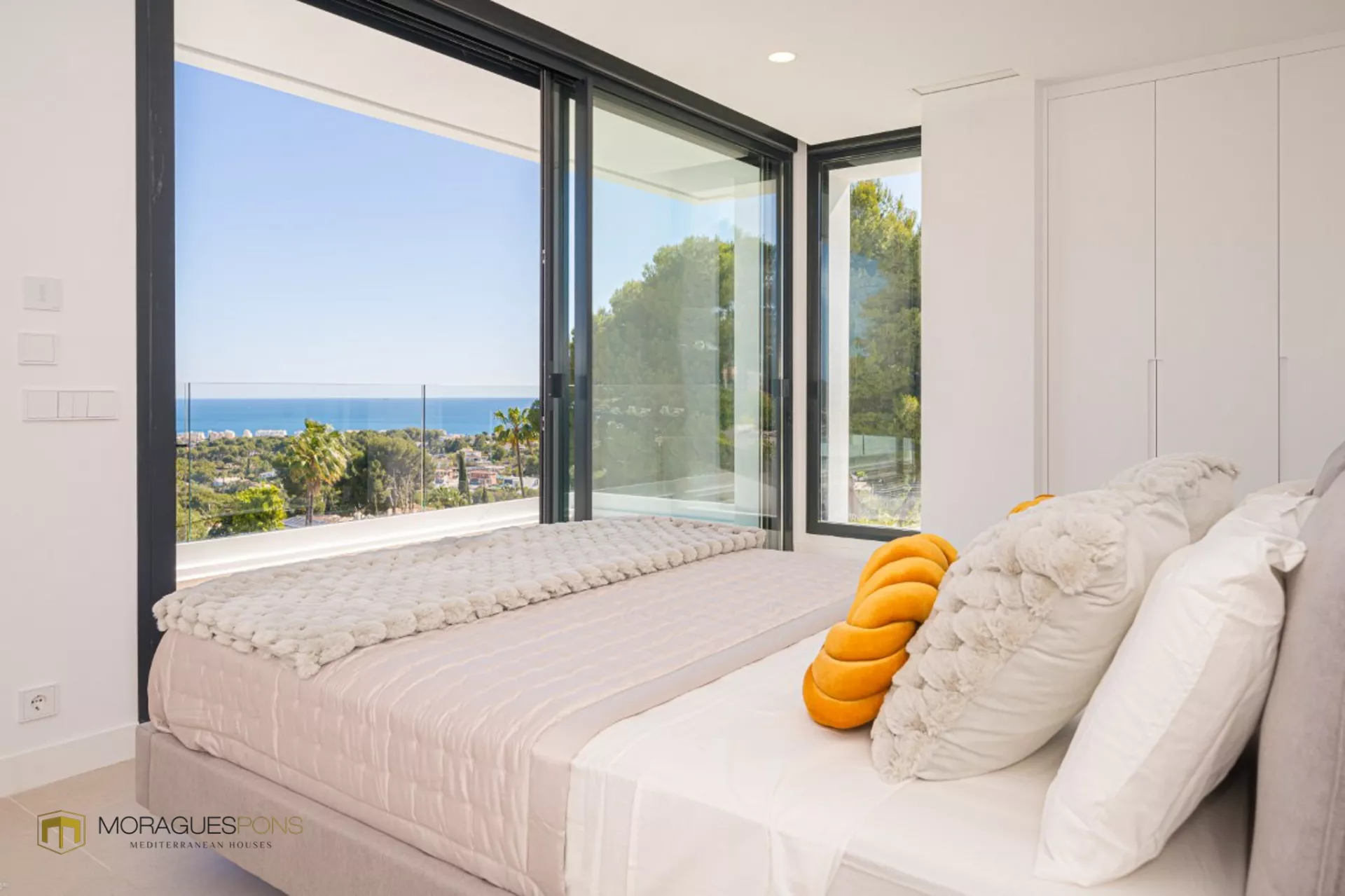 Die Villa erstreckt sich über 3 Etagen, die durch eine interne Treppe und einen Aufzug für 4 Personen verbunden sind. Eine beeindruckende Eingangstür begrüßt Sie in einem geräumigen Wohn-Esszimmer mit einer luxuriösen offenen Küche mit Insel und integrierten Bosch-Geräten. Das Wohnzimmer verfügt über einen großen Einbauschrank für zusätzlichen Stauraum. Neben dem Eingang befindet sich ein elegantes Gäste-WC. Im ersten Stock befindet sich eine geräumige Master-Suite mit eigenem Bad mit Badewanne, Doppelwaschbecken und begehbarer Dusche. Darüber hinaus gibt es zwei weitere Doppelschlafzimmer, jeweils mit eigenem Bad. Alle Schlafzimmer haben Einbauschränke und Zugang zu einem Balkon. Die extra hohen Fenster (2,8 m) bieten aus allen Blickwinkeln einen spektakulären Blick auf das Meer und den Montgó. Alle Türen reichen ebenfalls bis zur Decke. Im Souterrain befindet sich ein sehr geräumiges Schlafzimmer mit Doppelbett und eigenem Bad mit Doppeldusche und englischer Natursteinterrasse. Auf dieser Etage befinden sich auch eine Waschküche, ein Abstellraum, ein Mehrzweckraum, der nach Belieben eingerichtet werden kann (Fitnessraum, Heimkino, Arbeitszimmer usw.), ein Technikraum und eine sehr große Garage von fast 100 m2.