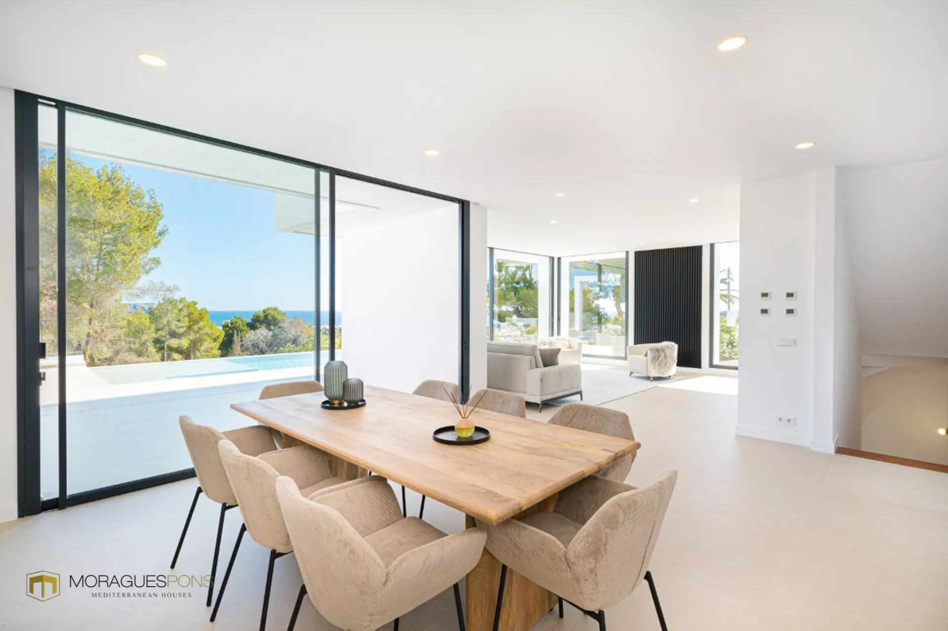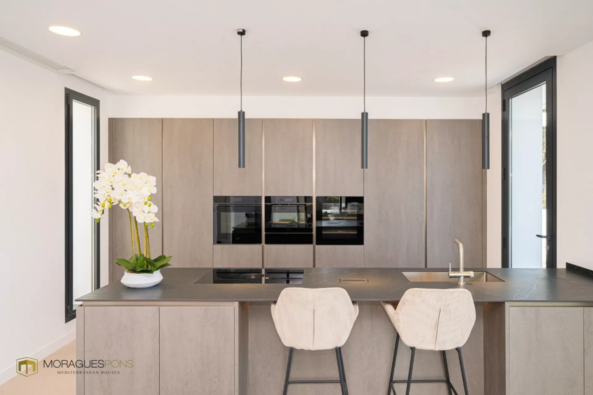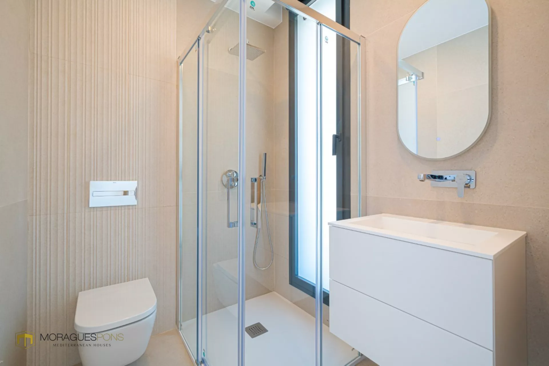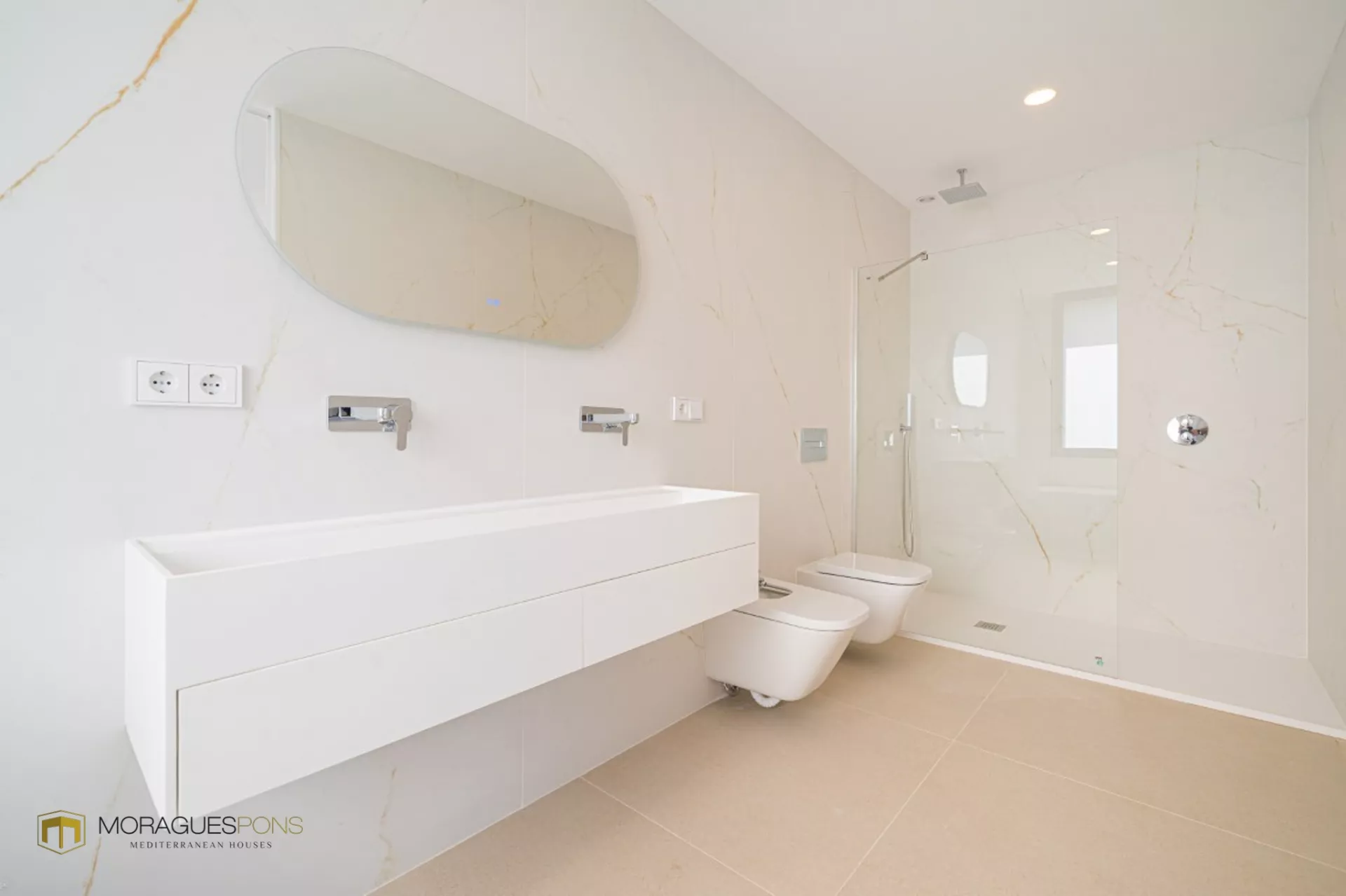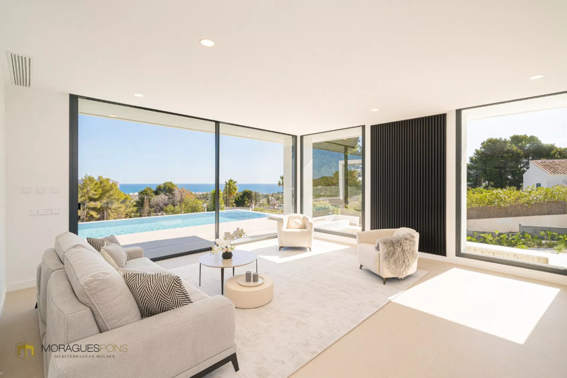 Die Villa erstreckt sich über 3 Etagen, die durch eine interne Treppe und einen Aufzug für 4 Personen verbunden sind. Eine beeindruckende Eingangstür begrüßt Sie in einem geräumigen Wohn-Esszimmer mit einer luxuriösen offenen Küche mit Insel und integrierten Bosch-Geräten. Das Wohnzimmer verfügt über einen großen Einbauschrank für zusätzlichen Stauraum. Neben dem Eingang befindet sich ein elegantes Gäste-WC. Im ersten Stock befindet sich eine geräumige Master-Suite mit eigenem Bad mit Badewanne, Doppelwaschbecken und begehbarer Dusche. Darüber hinaus gibt es zwei weitere Doppelschlafzimmer, jeweils mit eigenem Bad. Alle Schlafzimmer haben Einbauschränke und Zugang zu einem Balkon. Die extra hohen Fenster (2,8 m) bieten aus allen Blickwinkeln einen spektakulären Blick auf das Meer und den Montgó. Alle Türen reichen ebenfalls bis zur Decke. Im Souterrain befindet sich ein sehr geräumiges Schlafzimmer mit Doppelbett und eigenem Bad mit Doppeldusche und englischer Natursteinterrasse. Auf dieser Etage befinden sich auch eine Waschküche, ein Abstellraum, ein Mehrzweckraum, der nach Belieben eingerichtet werden kann (Fitnessraum, Heimkino, Arbeitszimmer usw.), ein Technikraum und eine sehr große Garage von fast 100 m2.