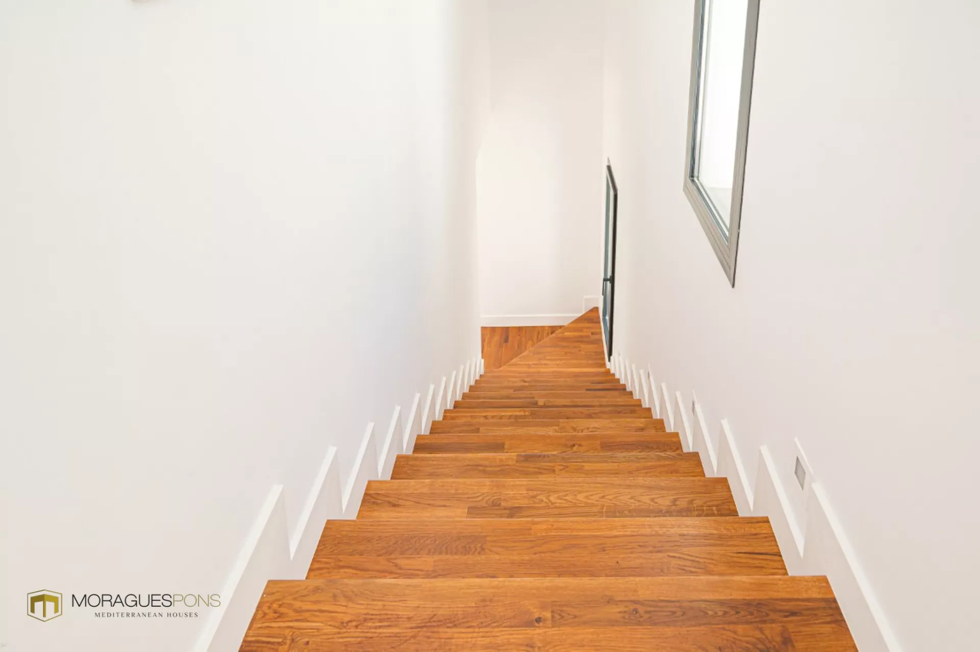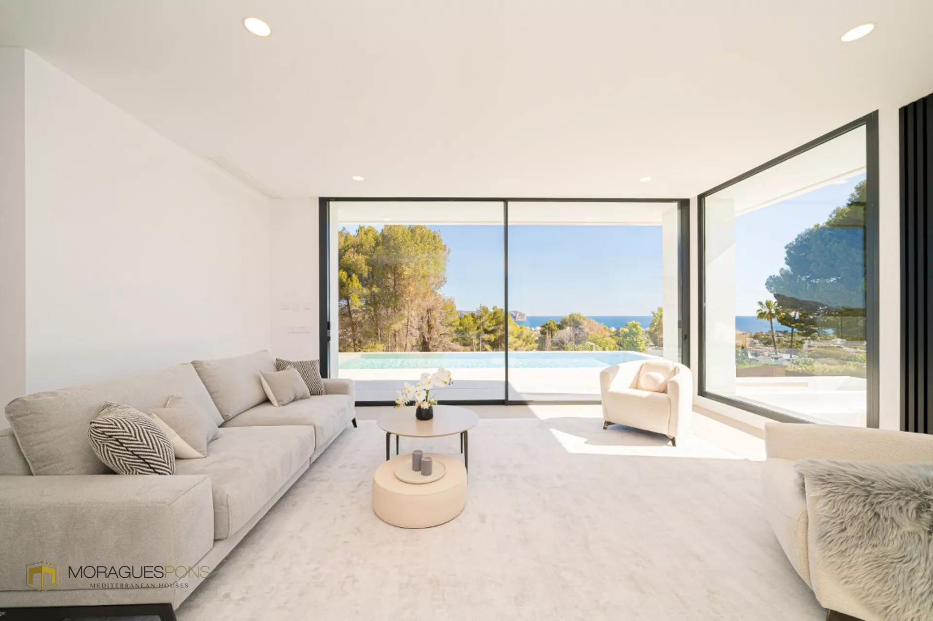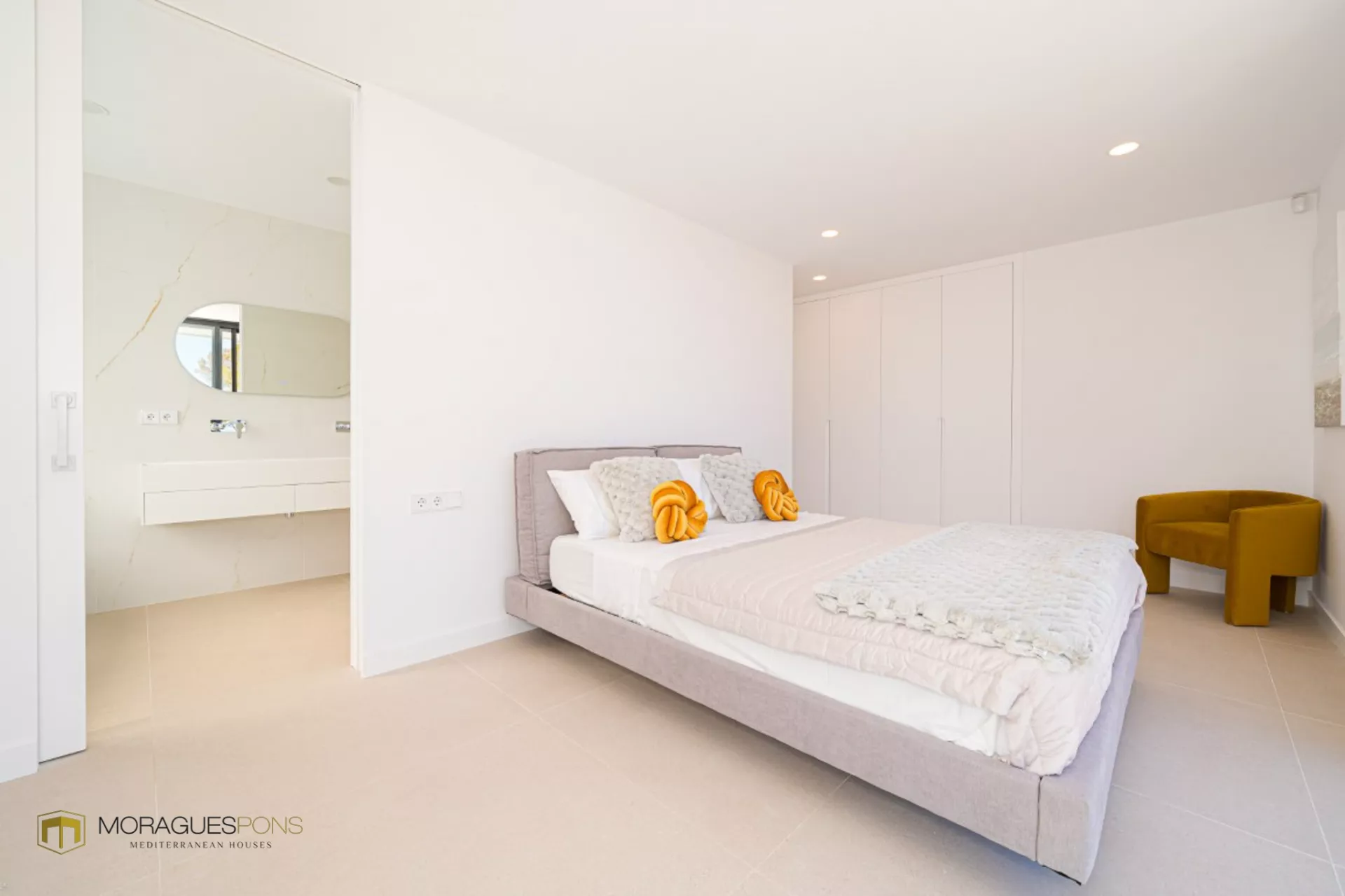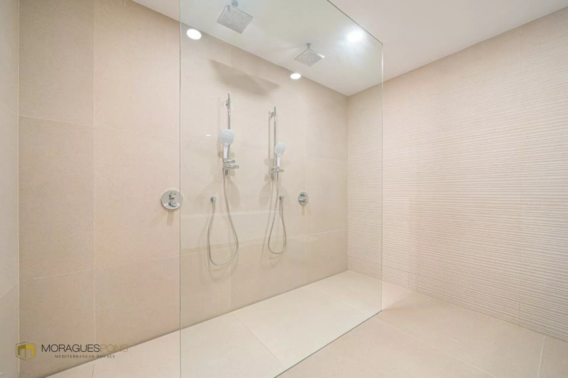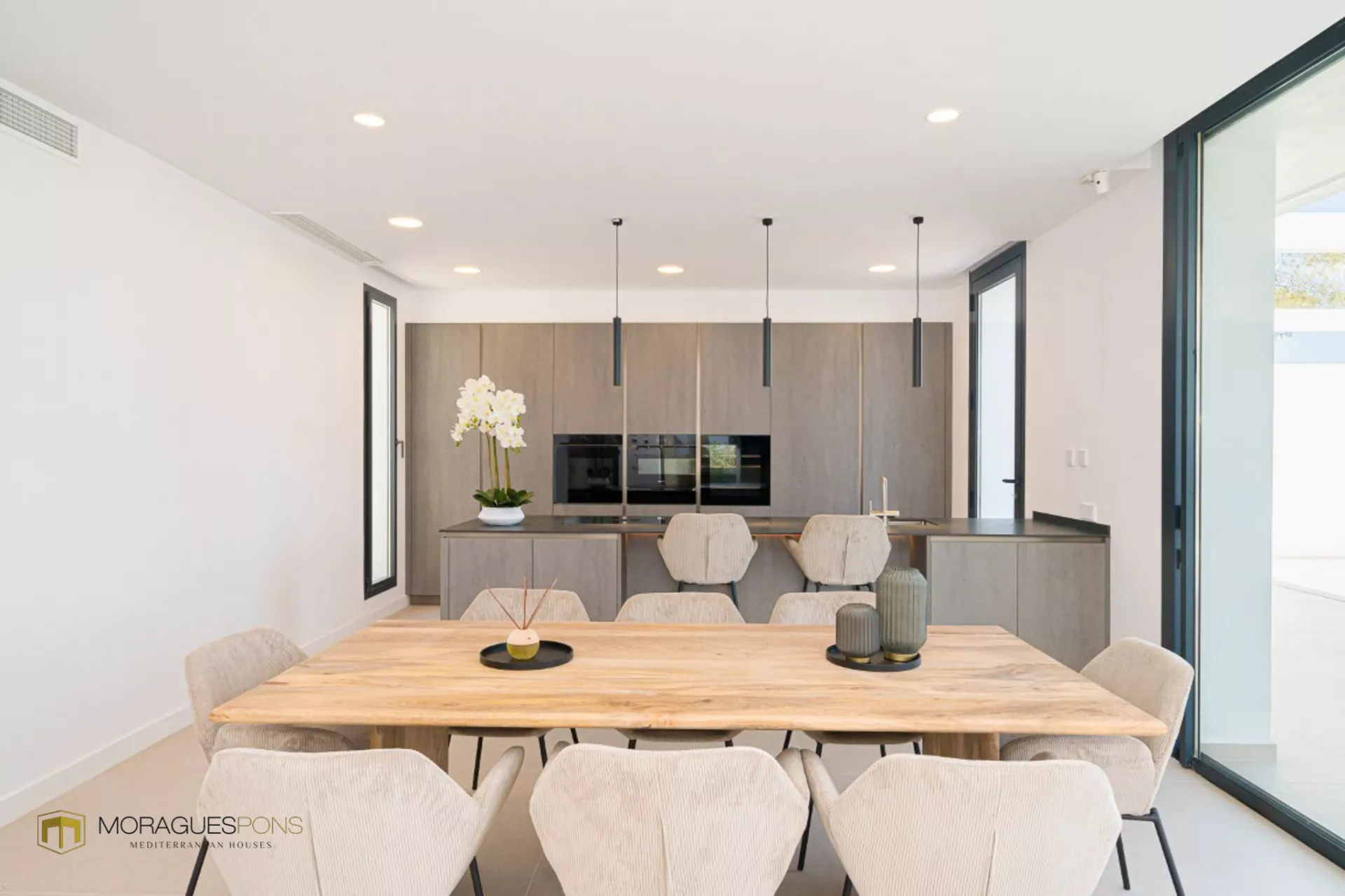 Die Villa erstreckt sich über 3 Etagen, die durch eine interne Treppe und einen Aufzug für 4 Personen verbunden sind. Eine beeindruckende Eingangstür begrüßt Sie in einem geräumigen Wohn-Esszimmer mit einer luxuriösen offenen Küche mit Insel und integrierten Bosch-Geräten. Das Wohnzimmer verfügt über einen großen Einbauschrank für zusätzlichen Stauraum. Neben dem Eingang befindet sich ein elegantes Gäste-WC. Im ersten Stock befindet sich eine geräumige Master-Suite mit eigenem Bad mit Badewanne, Doppelwaschbecken und begehbarer Dusche. Darüber hinaus gibt es zwei weitere Doppelschlafzimmer, jeweils mit eigenem Bad. Alle Schlafzimmer haben Einbauschränke und Zugang zu einem Balkon. Die extra hohen Fenster (2,8 m) bieten aus allen Blickwinkeln einen spektakulären Blick auf das Meer und den Montgó. Alle Türen reichen ebenfalls bis zur Decke. Im Souterrain befindet sich ein sehr geräumiges Schlafzimmer mit Doppelbett und eigenem Bad mit Doppeldusche und englischer Natursteinterrasse. Auf dieser Etage befinden sich auch eine Waschküche, ein Abstellraum, ein Mehrzweckraum, der nach Belieben eingerichtet werden kann (Fitnessraum, Heimkino, Arbeitszimmer usw.), ein Technikraum und eine sehr große Garage von fast 100 m2.