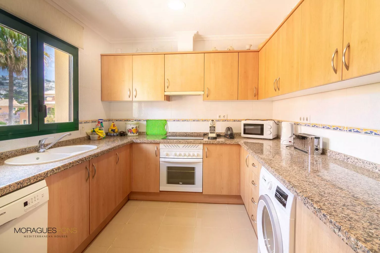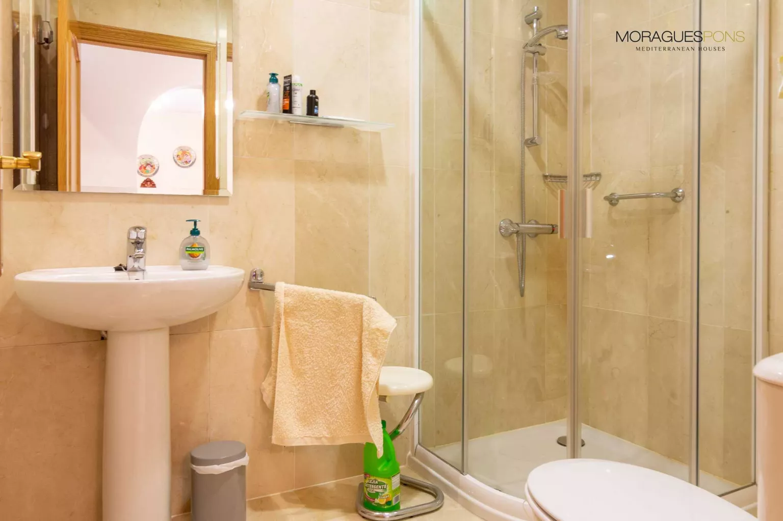 Im Hauptgeschoss befinden sich neben der Terrasse, dem Wohnzimmer, der Küche und der Eingangshalle ein Schlafzimmer und ein Badezimmer. Im Obergeschoss befinden sich zwei große Schlafzimmer mit einer offenen Terrasse mit herrlichem Blick und ein weiteres Badezimmer.