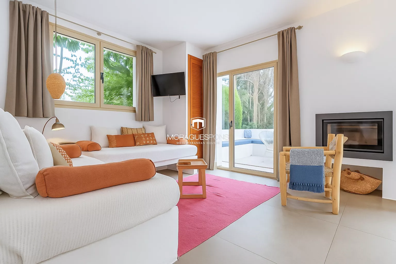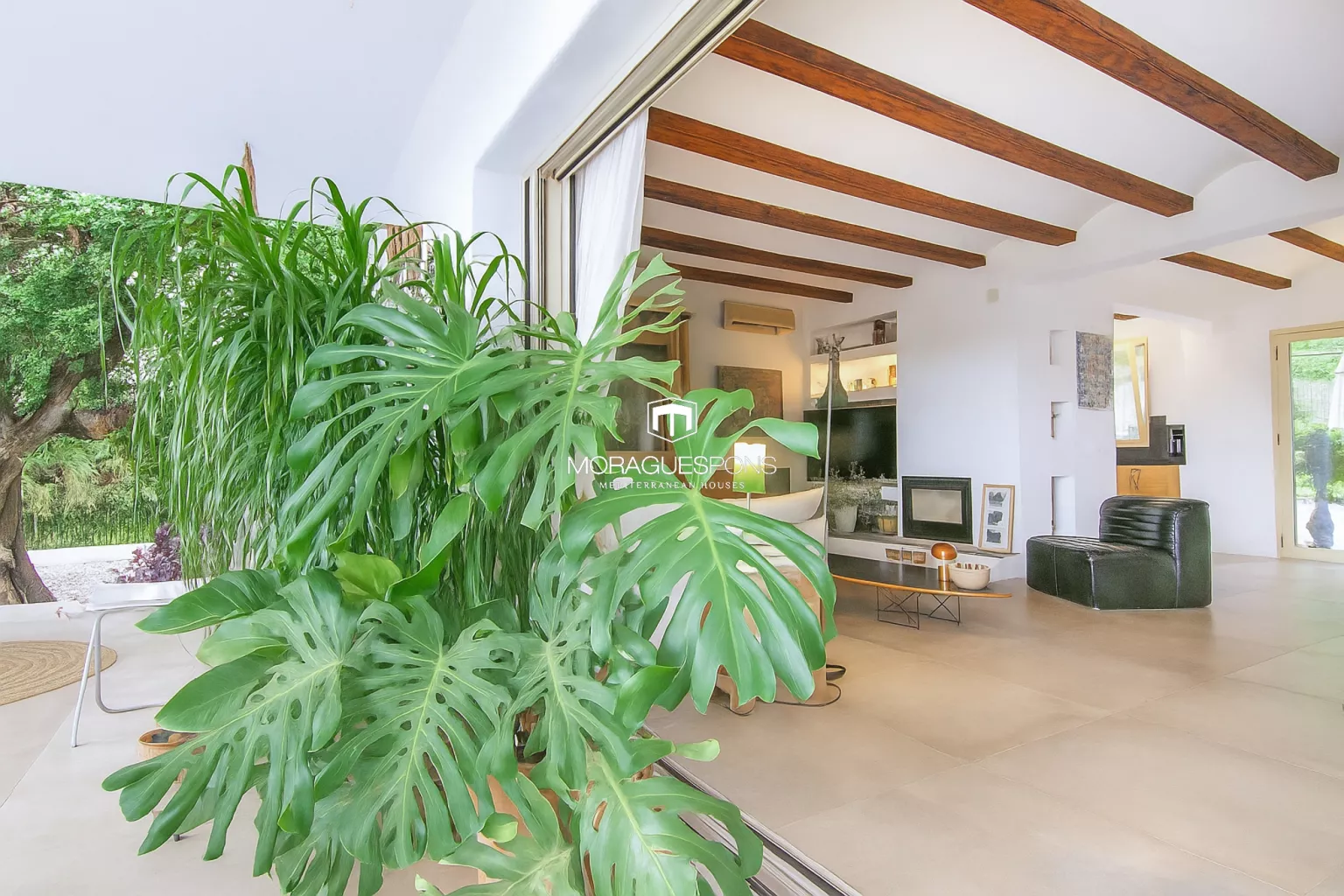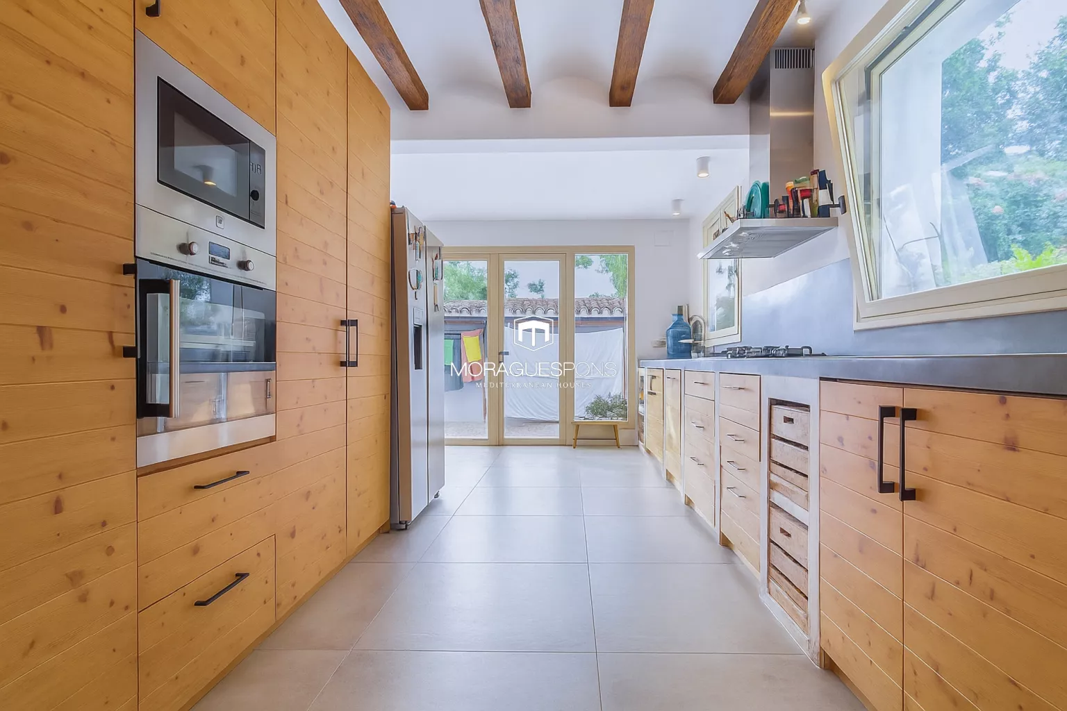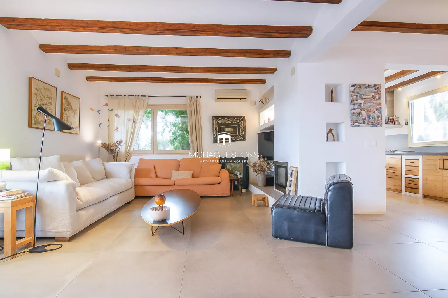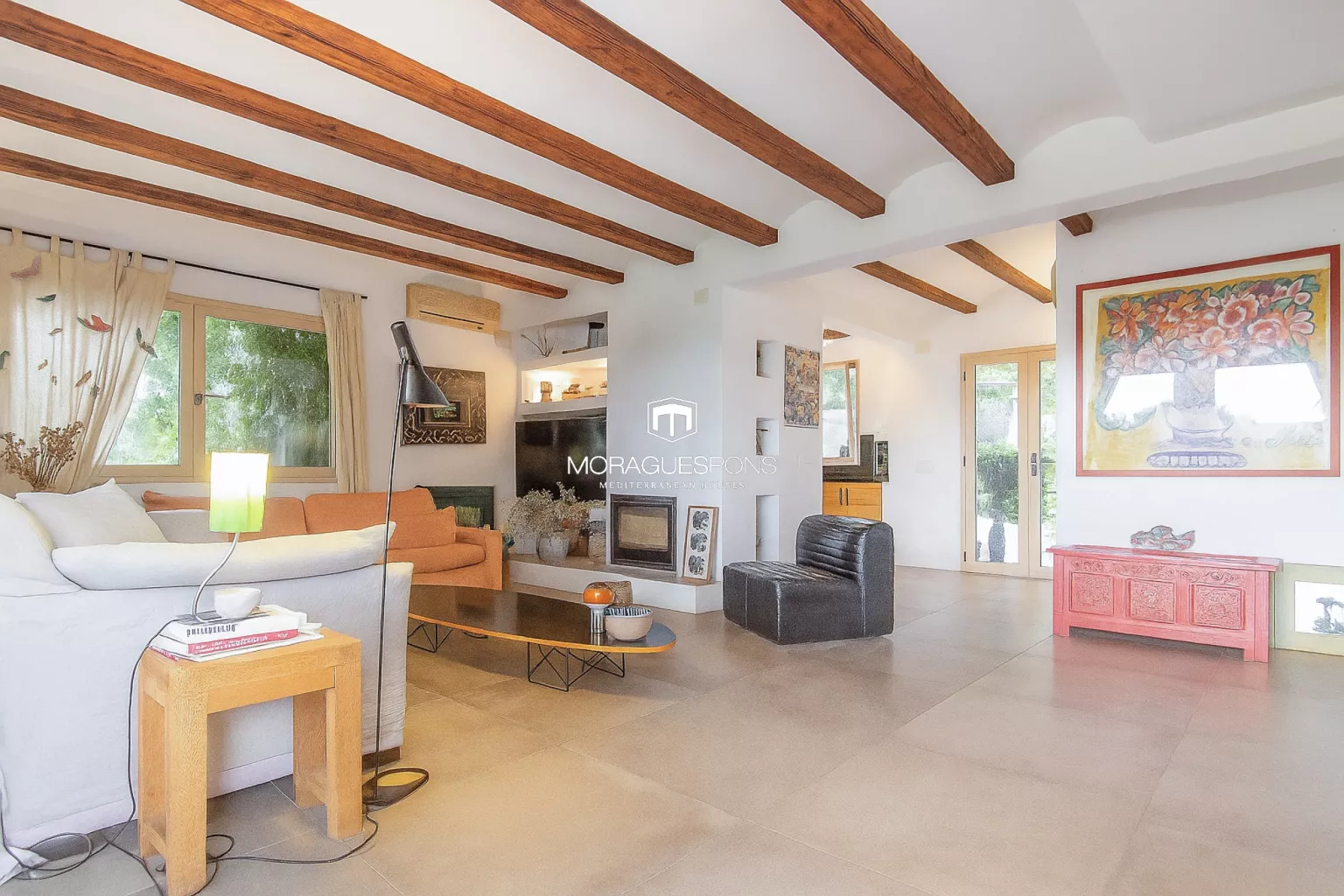Das Haupthaus, ebenerdig und ca. 200 m² groß, kombiniert natürliche Materialien, Holzbalken und große Fenster, die Innen- und Außenbereich verbinden. Das geräumige Wohnzimmer mit Kamin und direktem Zugang zur überdachten Terrasse lädt zu langen Sommerabenden mit Blick in den Garten ein. Die Küche ist funktional, handwerklich gestaltet und verbindet mediterrane Wärme mit modernem Stil.