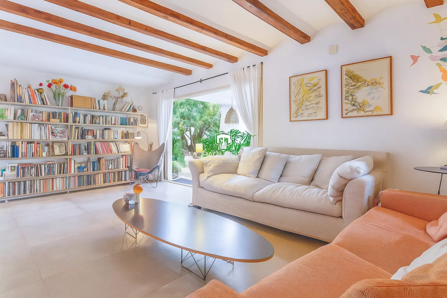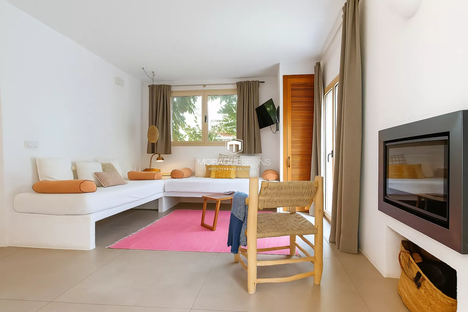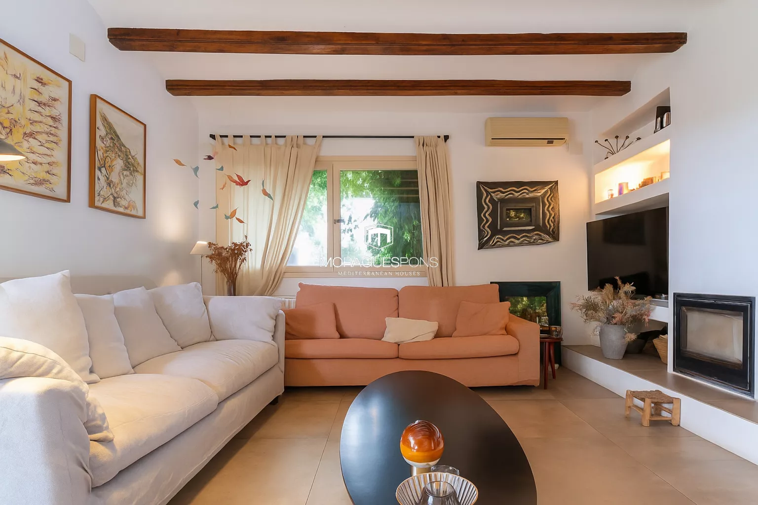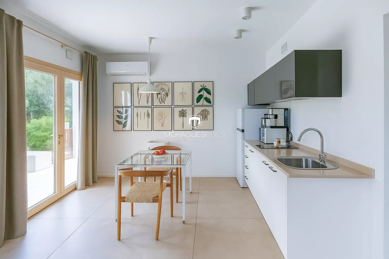 Das Haupthaus, ebenerdig und ca. 200 m² groß, kombiniert natürliche Materialien, Holzbalken und große Fenster, die Innen- und Außenbereich verbinden. Das geräumige Wohnzimmer mit Kamin und direktem Zugang zur überdachten Terrasse lädt zu langen Sommerabenden mit Blick in den Garten ein. Die Küche ist funktional, handwerklich gestaltet und verbindet mediterrane Wärme mit modernem Stil.