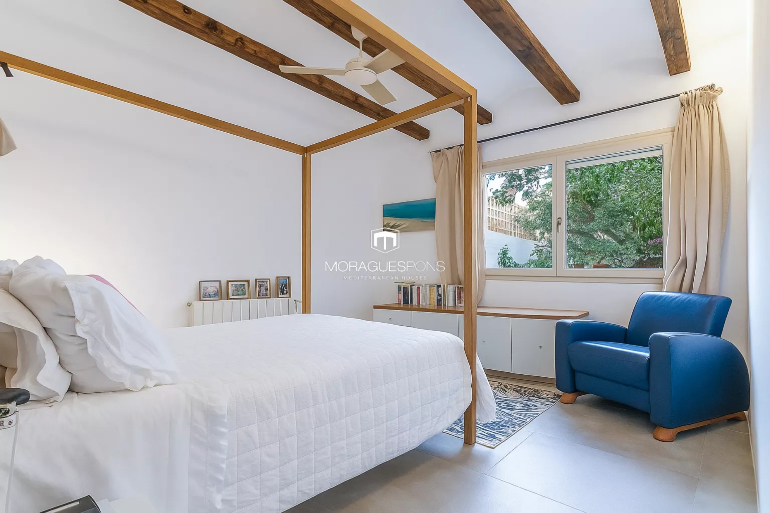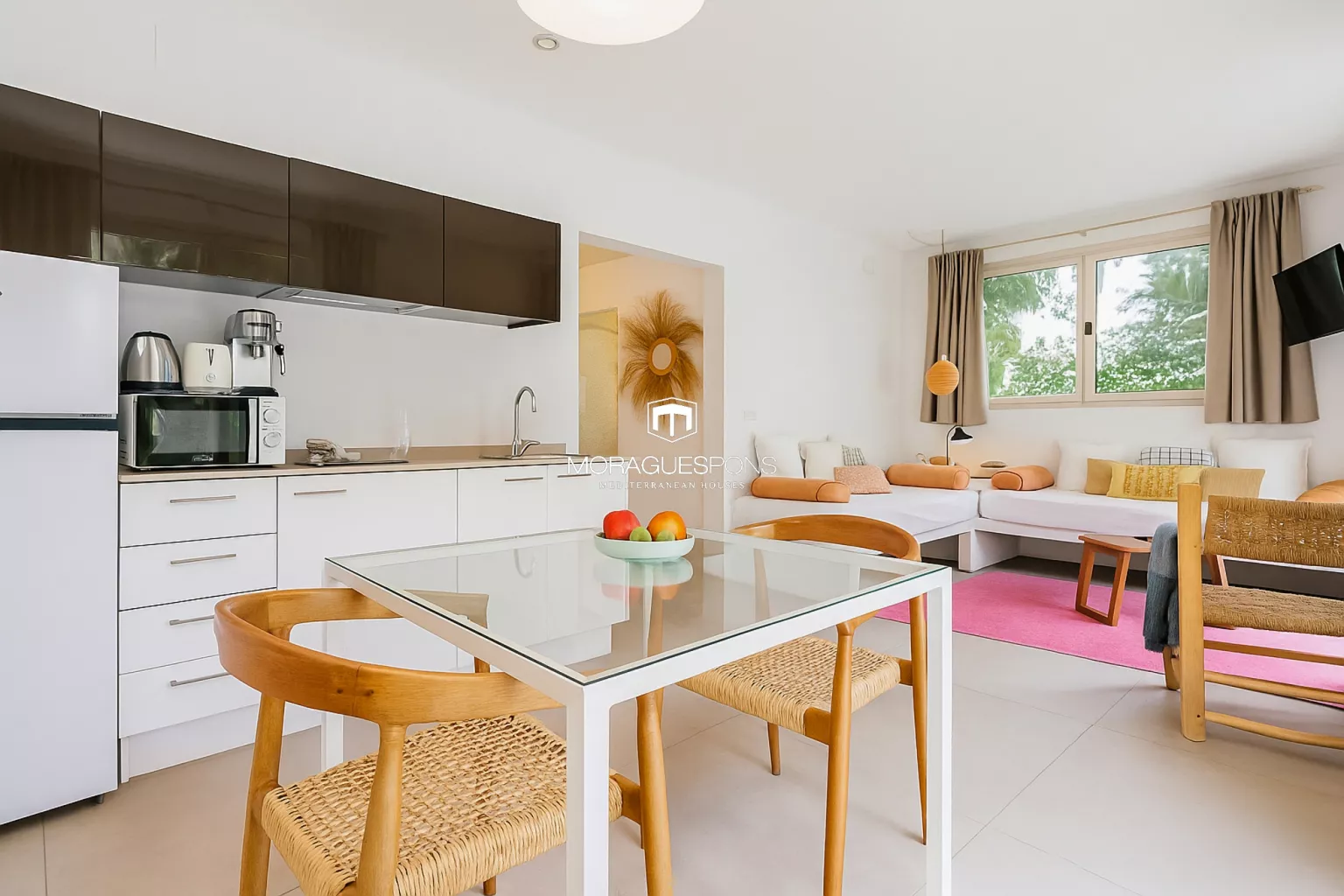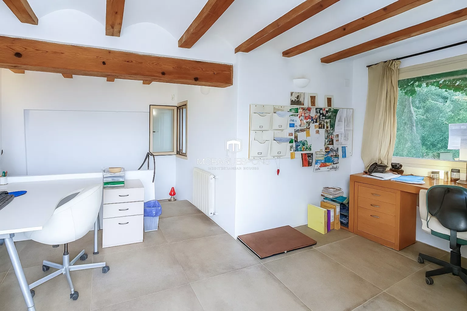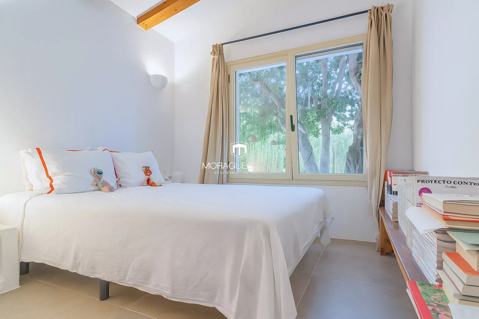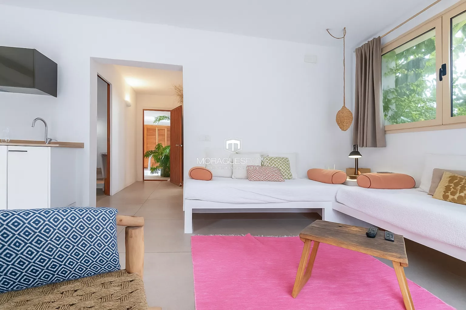 Das Haupthaus, ebenerdig und ca. 200 m² groß, kombiniert natürliche Materialien, Holzbalken und große Fenster, die Innen- und Außenbereich verbinden. Das geräumige Wohnzimmer mit Kamin und direktem Zugang zur überdachten Terrasse lädt zu langen Sommerabenden mit Blick in den Garten ein. Die Küche ist funktional, handwerklich gestaltet und verbindet mediterrane Wärme mit modernem Stil.