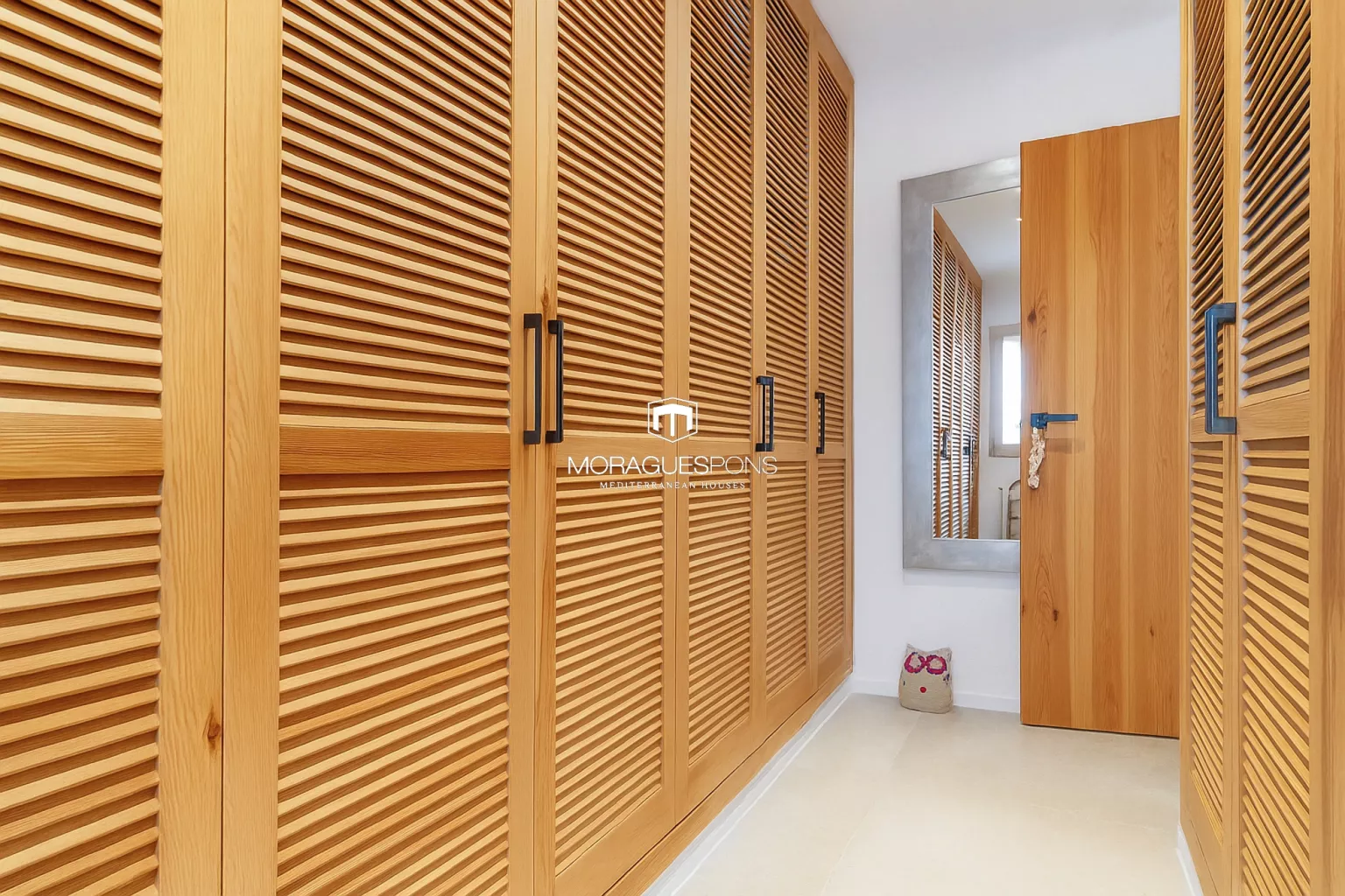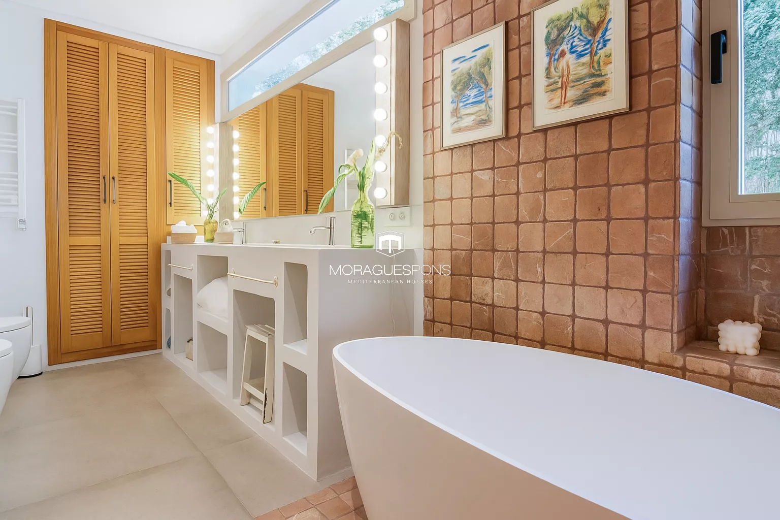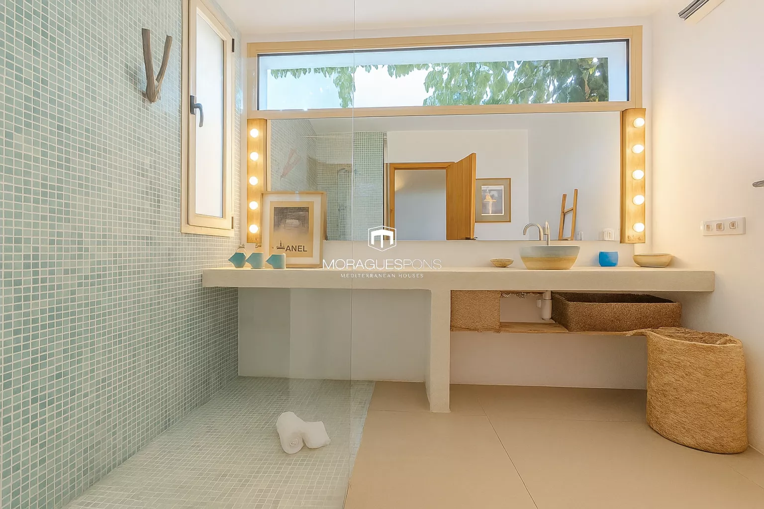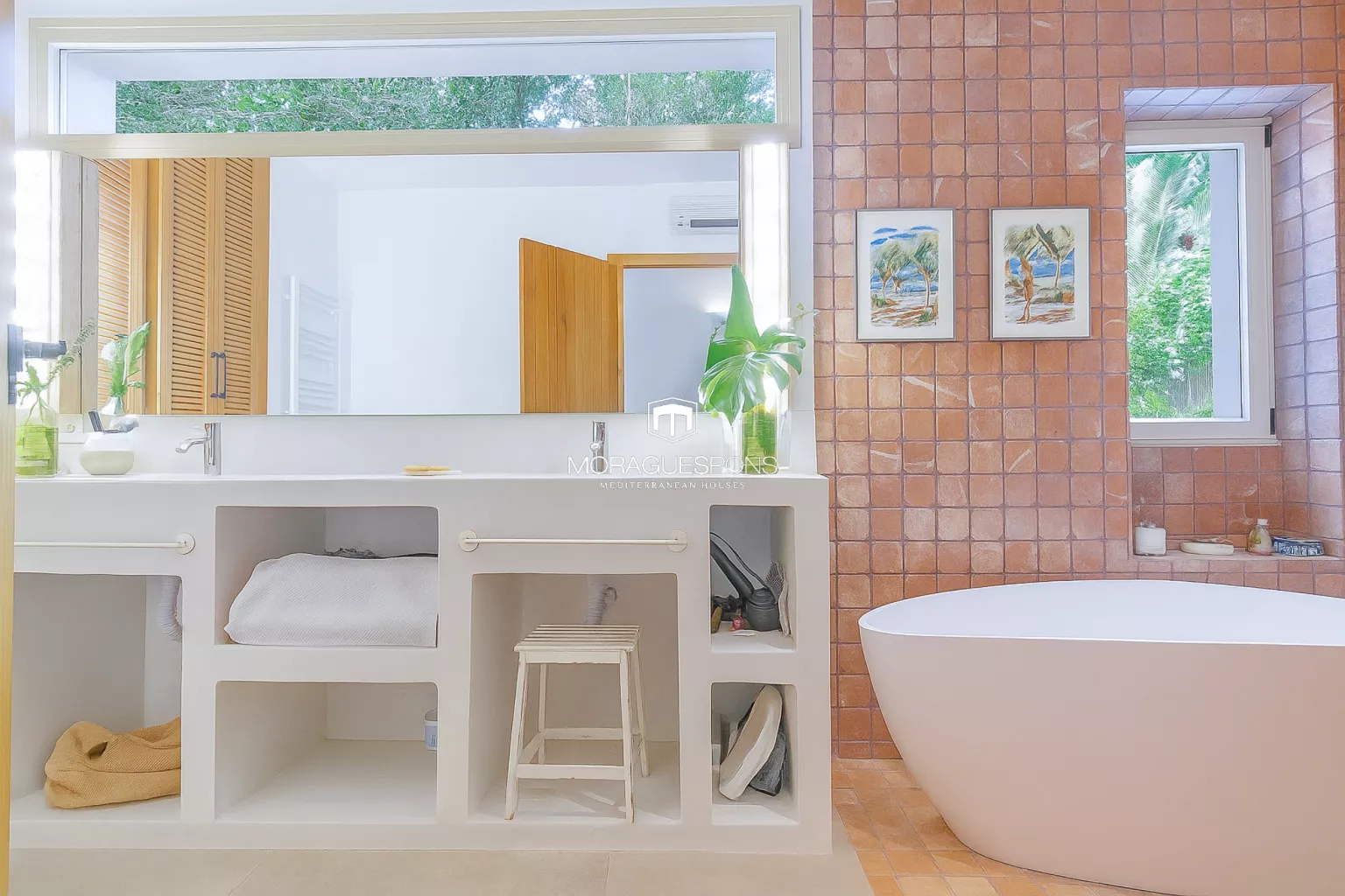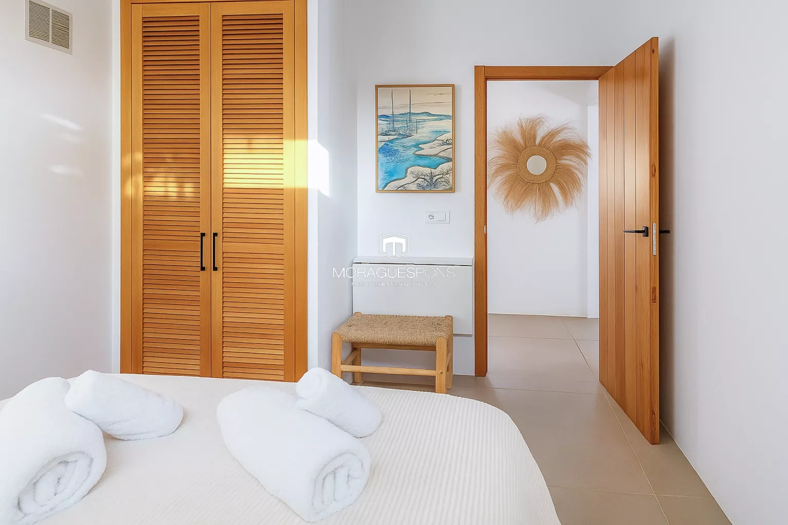 Das Haupthaus, ebenerdig und ca. 200 m² groß, kombiniert natürliche Materialien, Holzbalken und große Fenster, die Innen- und Außenbereich verbinden. Das geräumige Wohnzimmer mit Kamin und direktem Zugang zur überdachten Terrasse lädt zu langen Sommerabenden mit Blick in den Garten ein. Die Küche ist funktional, handwerklich gestaltet und verbindet mediterrane Wärme mit modernem Stil.