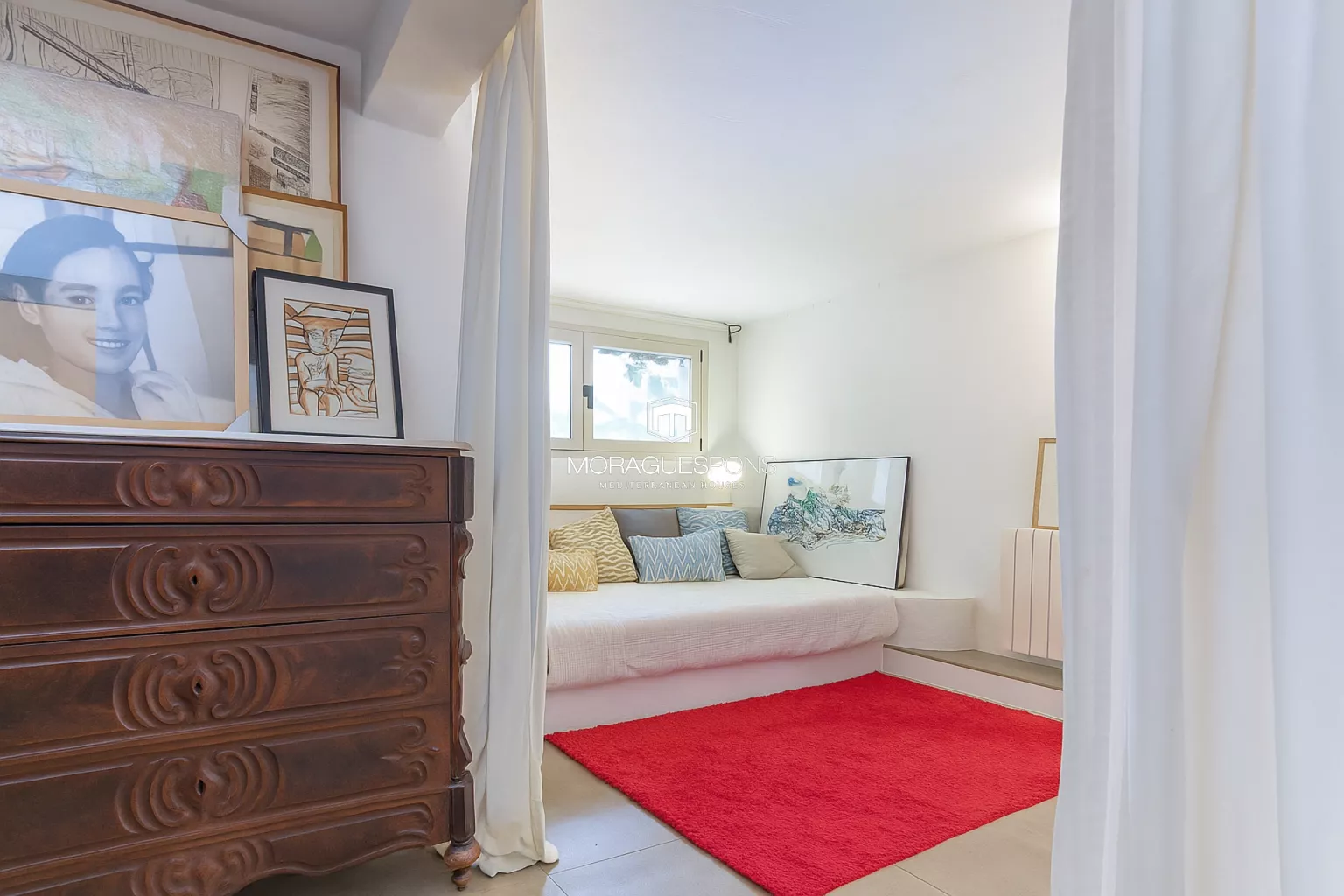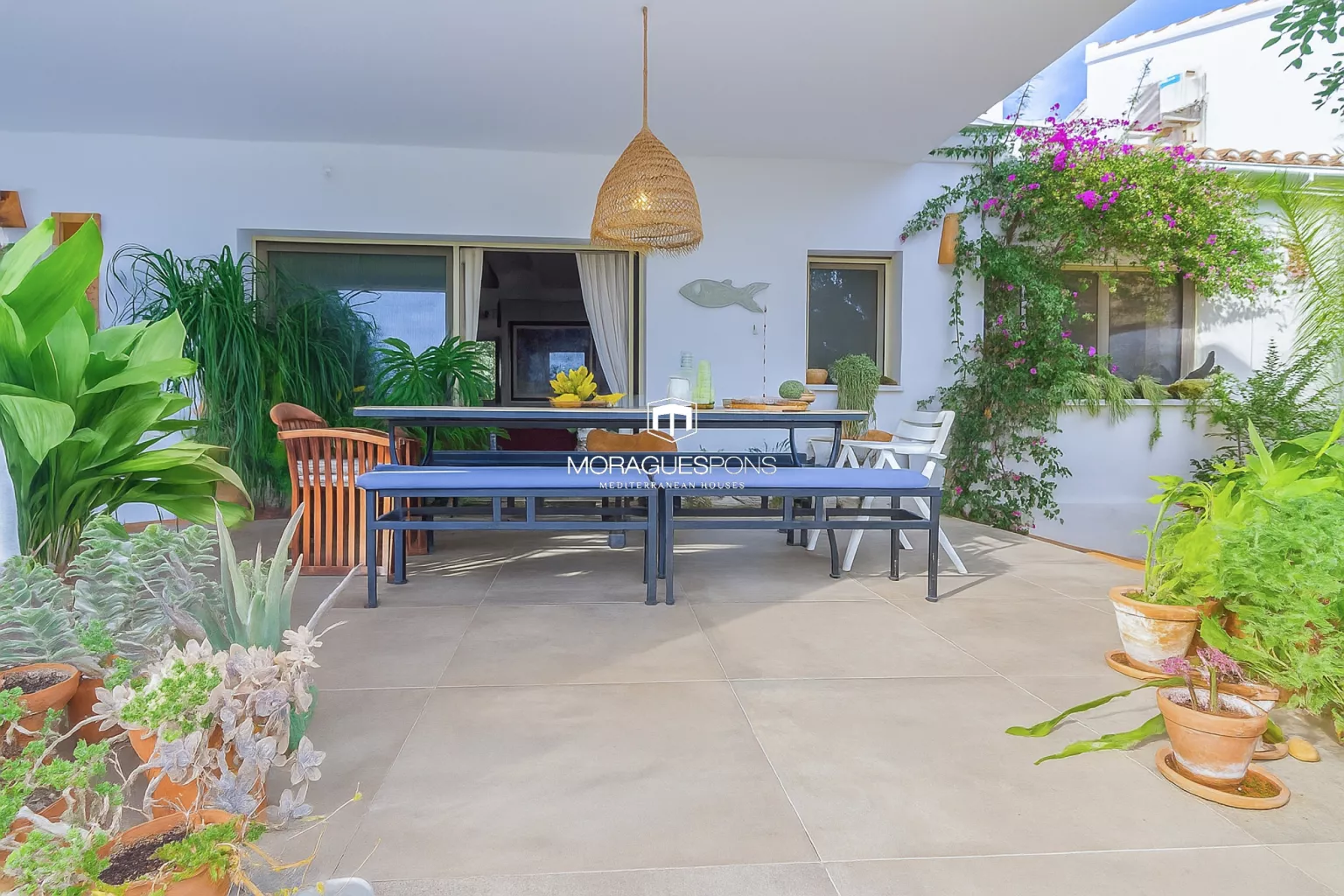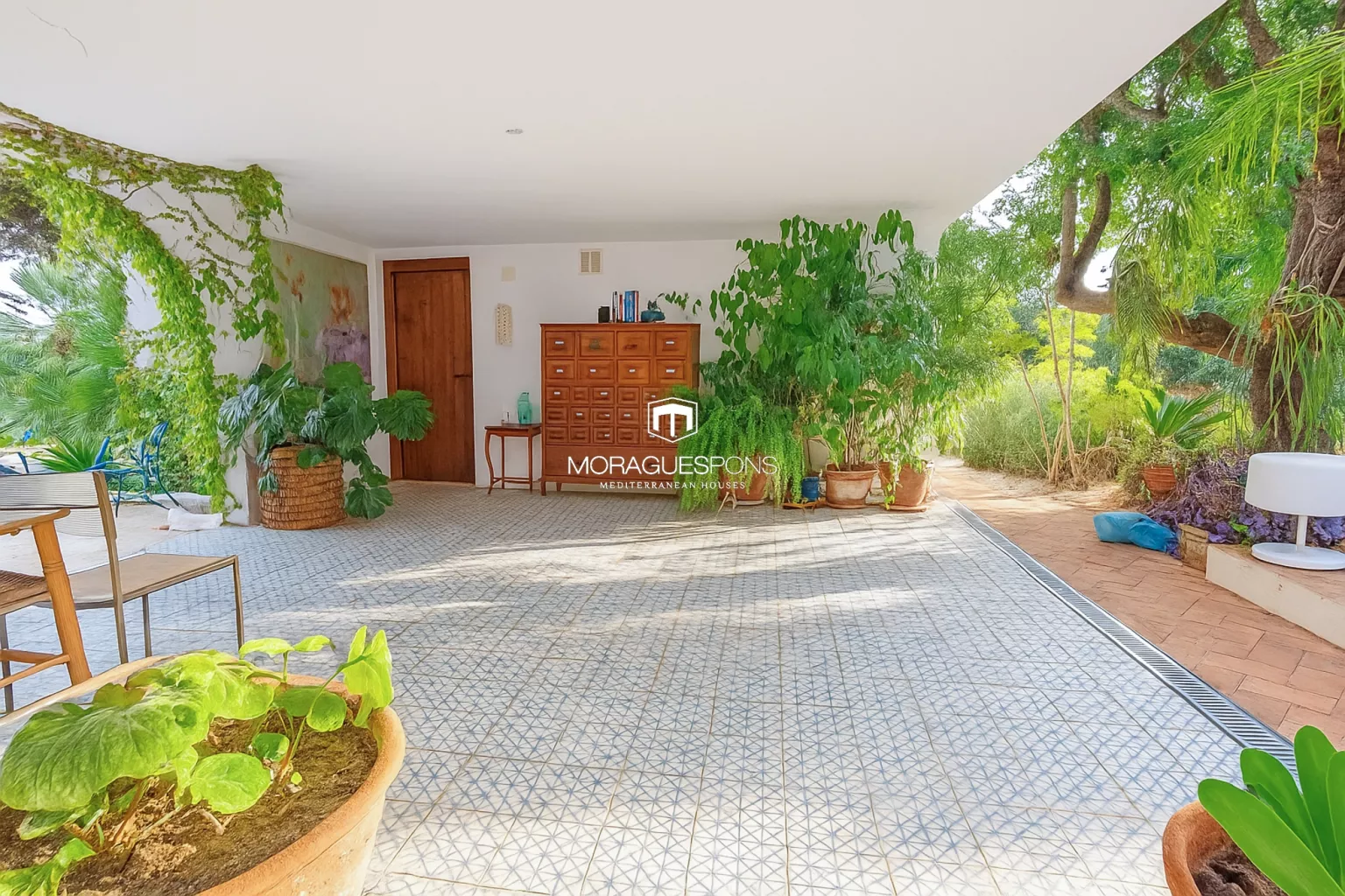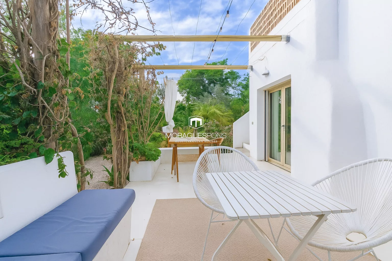 Durch eine charmante, von Bougainvilleen umrankte Veranda gelangt man zum Gästehaus – einem unabhängigen, aber visuell verbundenen Bereich. Es verfügt über ein Doppelschlafzimmer, Badezimmer, Küche, Wohnzimmer mit Kamin und eigene Terrasse. Ideal für Familie, Freunde oder als nachweislich rentable Vermietungsmöglichkeit.