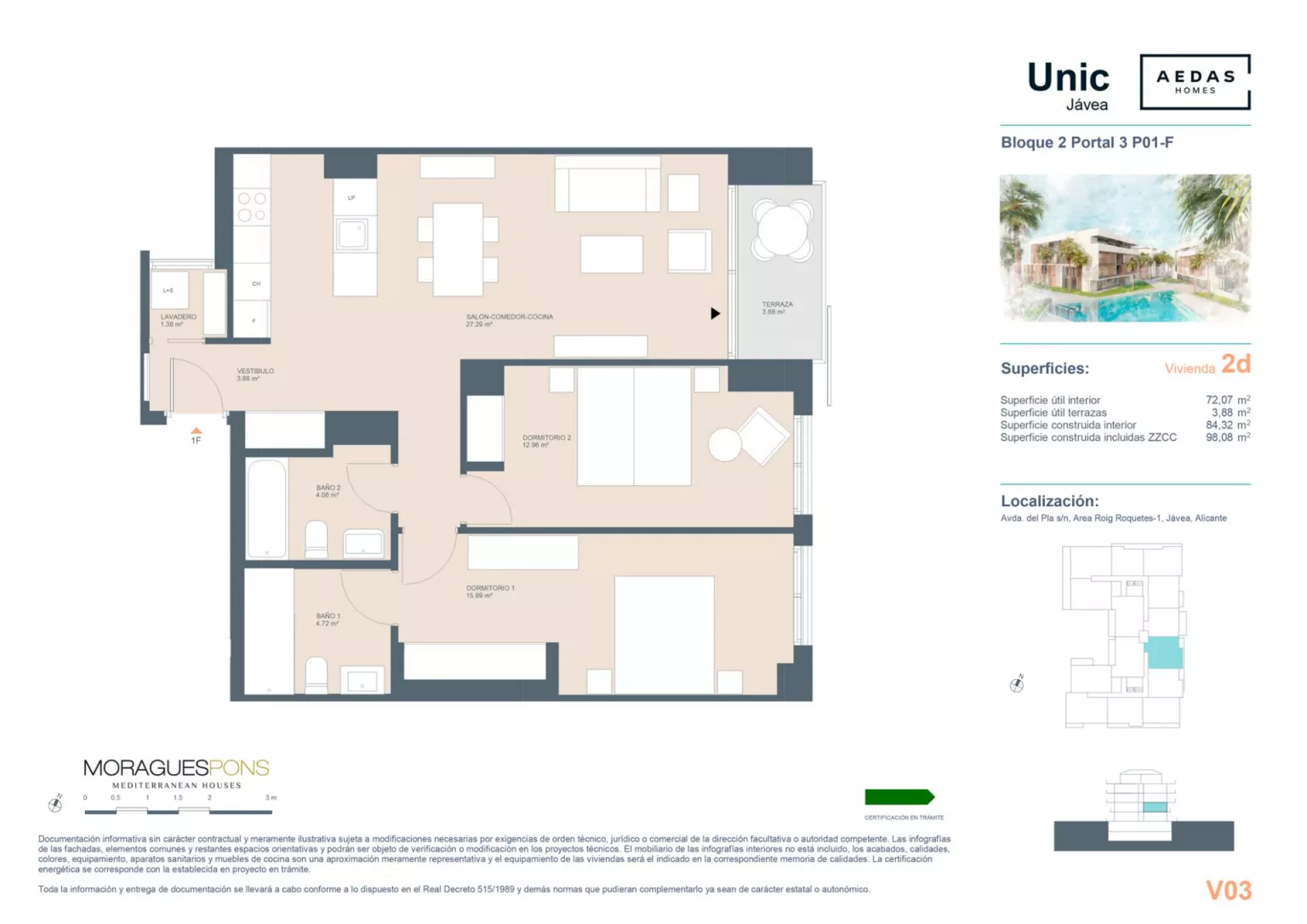 UNIC Javea besteht aus 58 Wohnungen mit 2, 3 und 4 Schlafzimmern, die sich im Erdgeschoss befinden und einen Garten haben. Es umfasst Penthäuser und Maisonette-Wohnungen mit großen Terrassen. Darüber hinaus werden alle Wohnungen über Parkplätze und Abstellräume verfügen. Die Wohnanlage wird über ein Schwimmbad und einen Sozialclub verfügen.