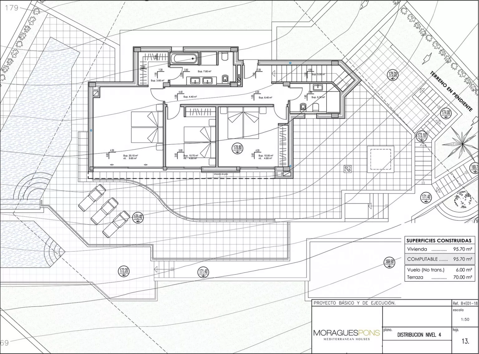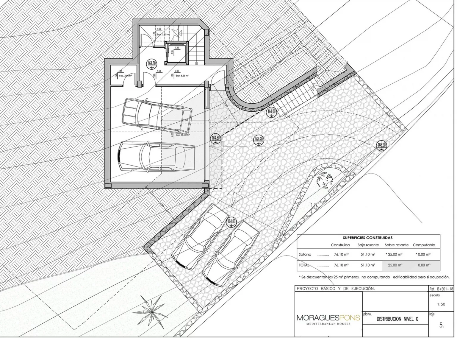Going up with the elevator, you reach the ground floor of the main house with a large living room, an open plan kitchen and a bedroom with an en-suite bathroom and a guest toilet. Furthermore, on the upper floor there are 3 more bedrooms and bathrooms.