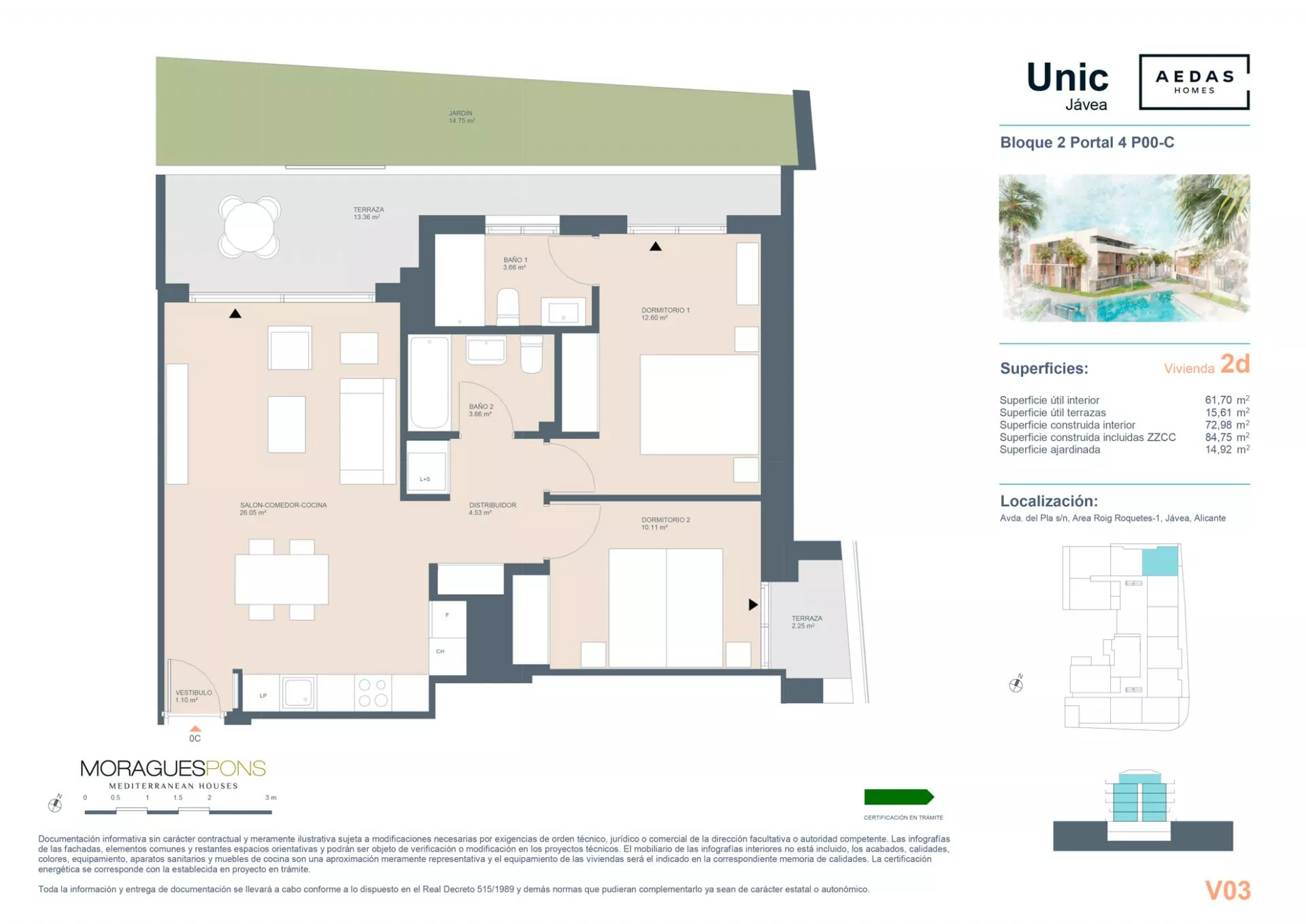 UNIC Javea, se compone de 58 viviendas de 2, 3 y 4 dormitorios distribuidas en planta baja con jardín. Incluye viviendas áticos, y duplex con grandes terrazas. Además, todas las viviendas dispondrán de plaza de garaje y trastero. El conjunto residencial contará con piscina y club social.