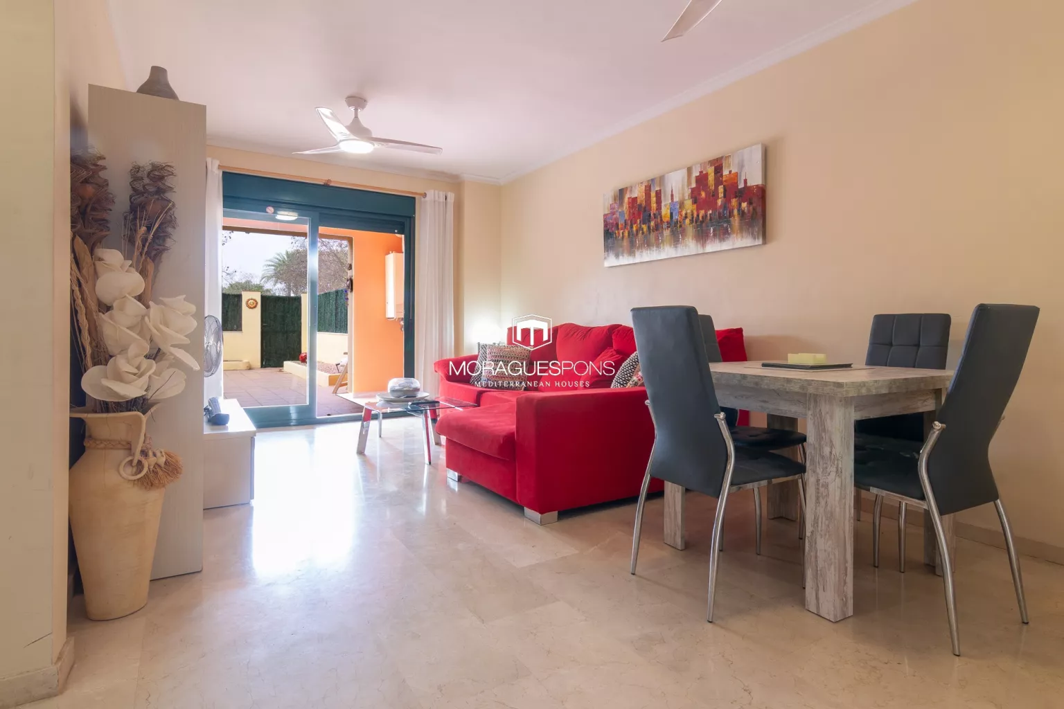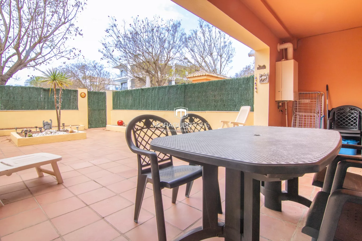 This ground-floor apartment, facing south, offers sunshine all day and boasts a spacious private terrace—partially covered and partially open-air—allowing you to choose between shade or sun as you prefer.