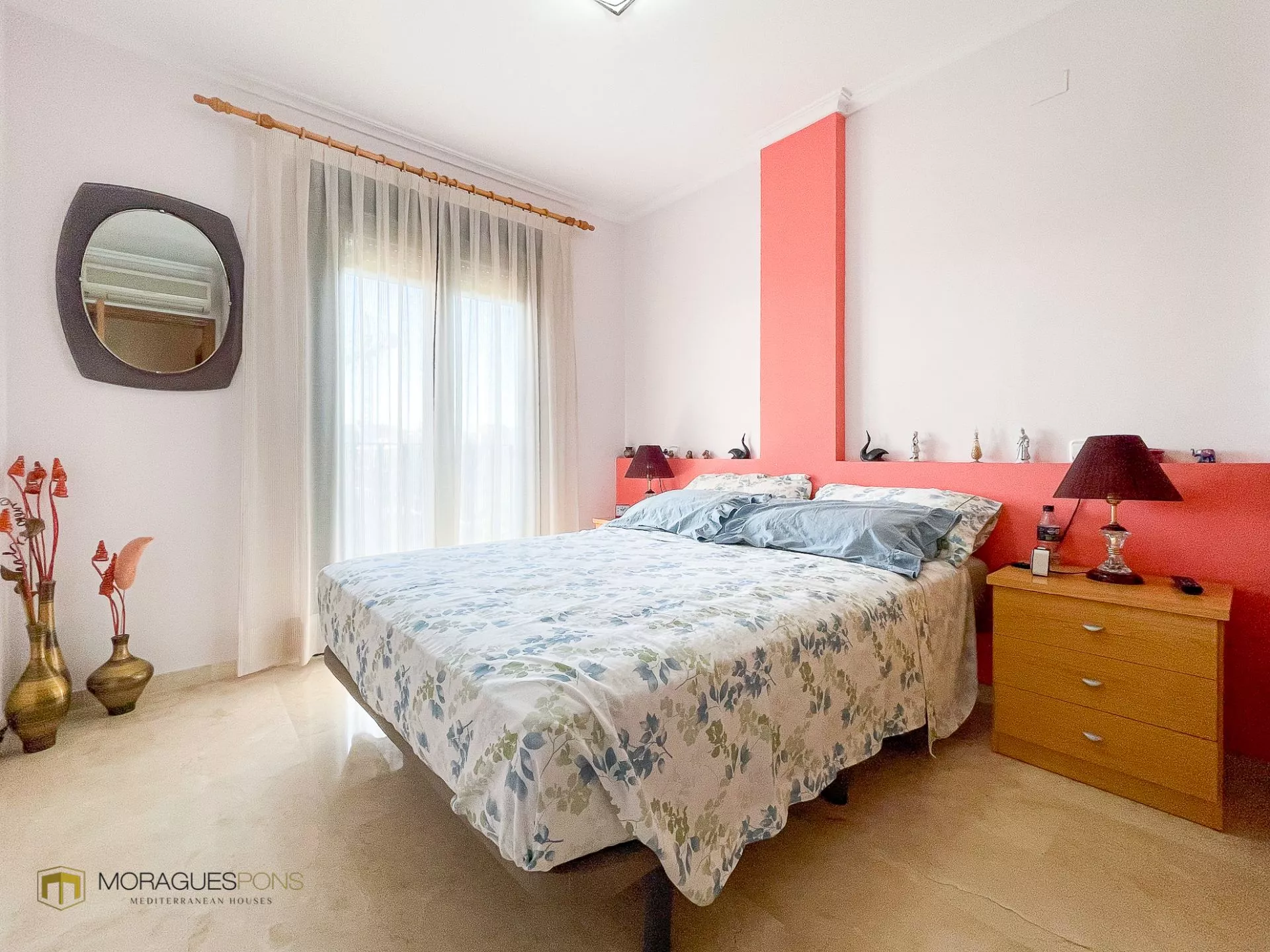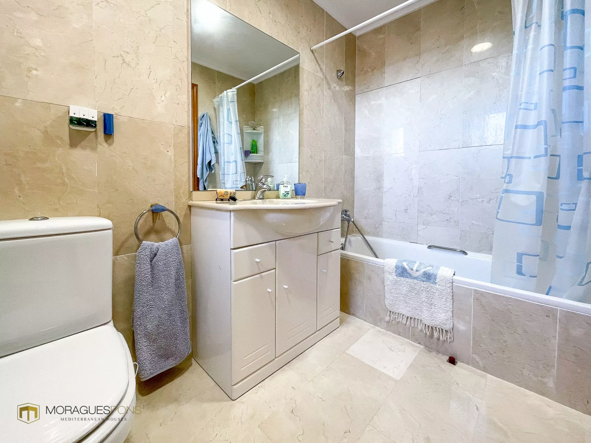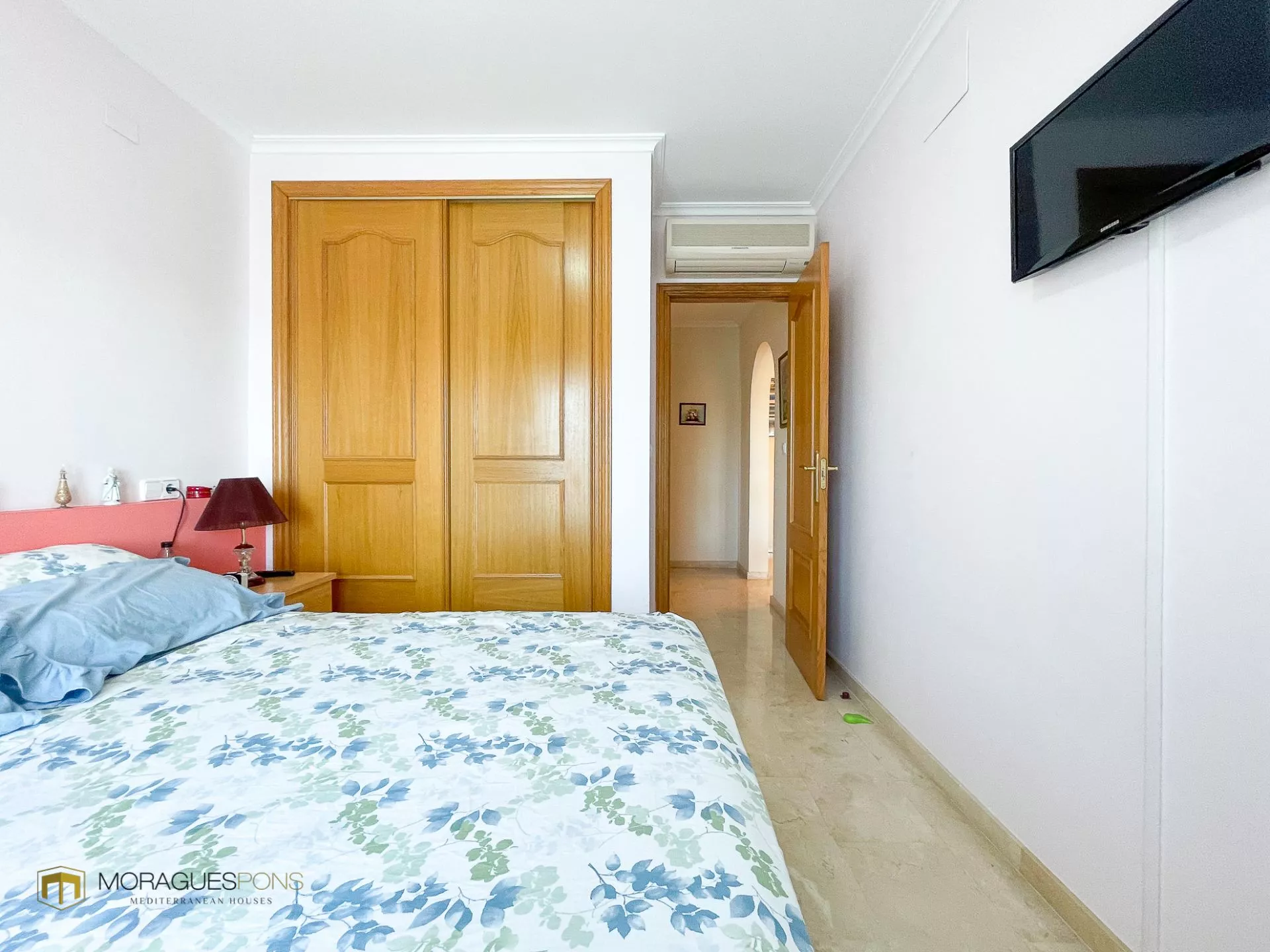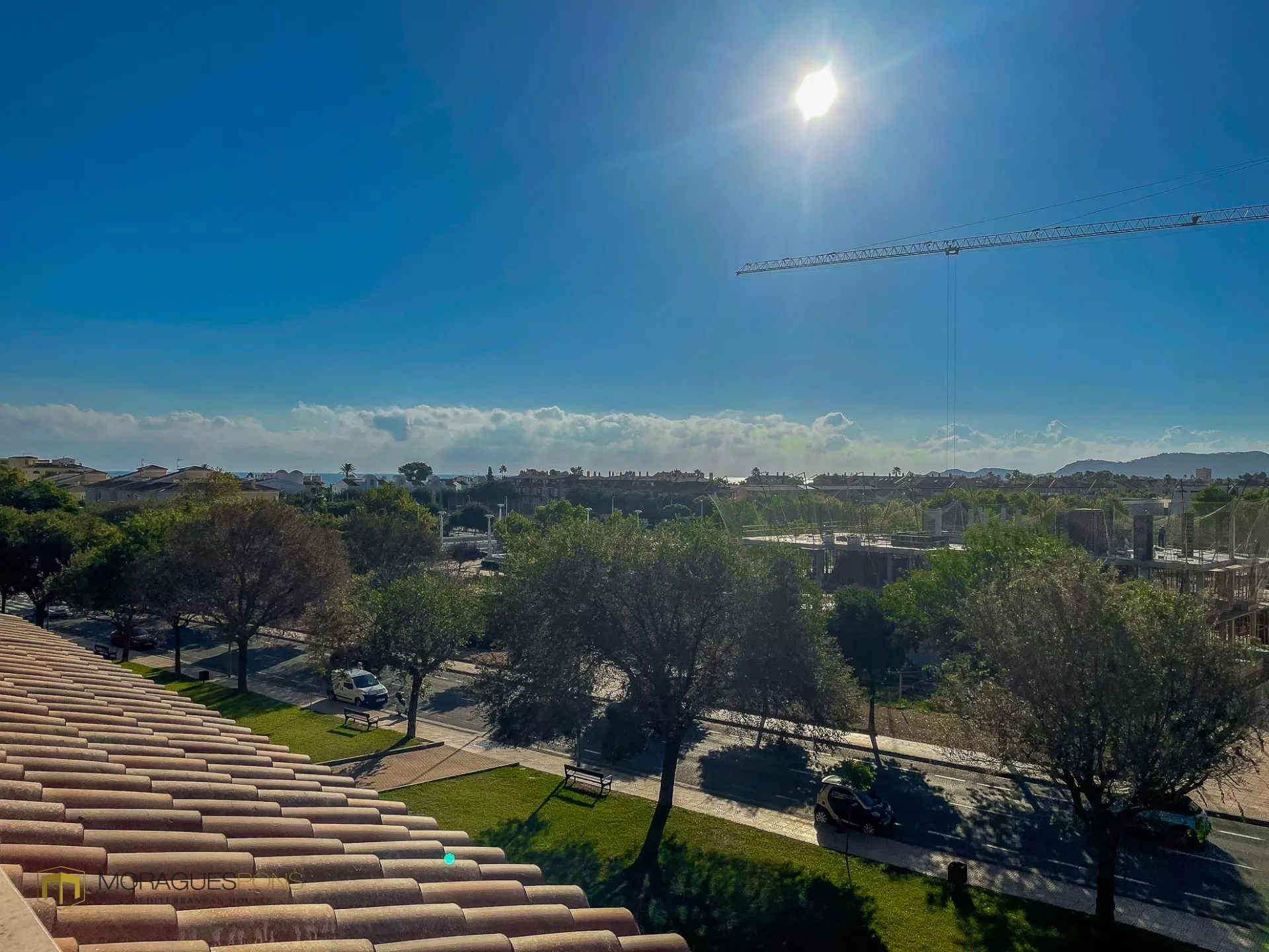 Two-bedroom, two-bathroom penthouse flat in a residential area just a few minutes' walk from the beach. It has underfloor heating, split air conditioning in all rooms. One of the bedrooms is on the main floor of the property and the other with its bathroom and dressing room on the top floor which also has a private terrace for this room. Large kitchen with pantry with access from the entrance hall. All facing south, west and north, as it is a property located in the corner of the block.