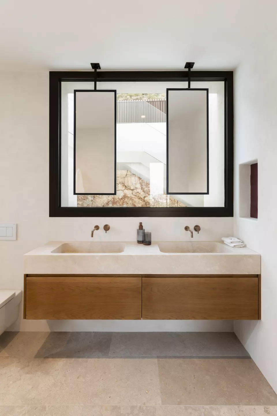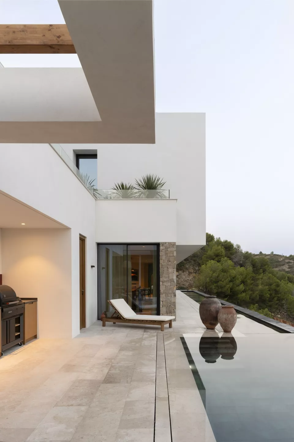 En el corazón de la vivienda, un patio interior excavado en la montaña actúa como un refugio íntimo. Afuera, una piscina infinita con canal de nado de más de 20 metros se funde con el horizonte. Y, para los momentos de desconexión total, un baño exterior de inspiración balinesa bajo el cielo de Jávea.