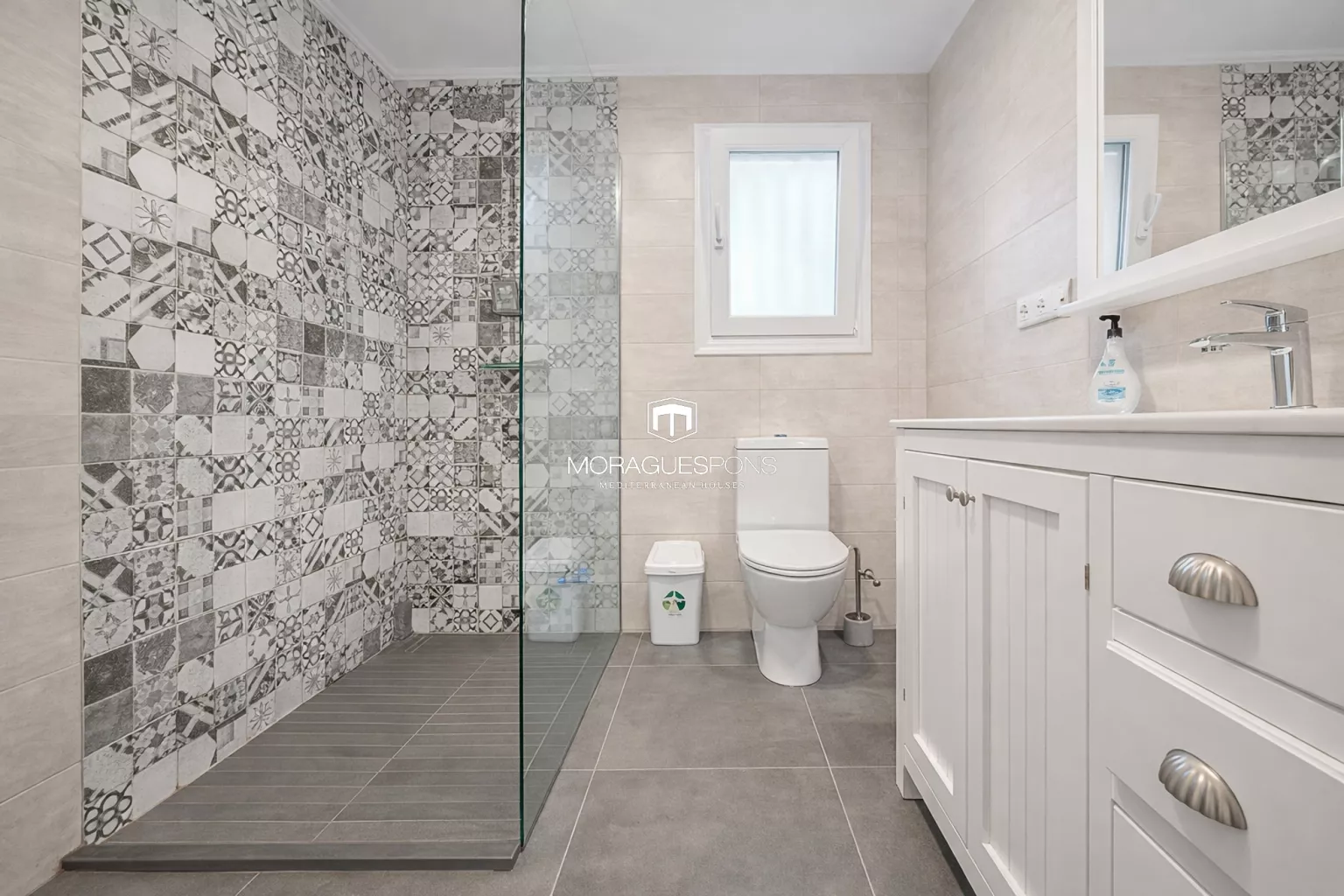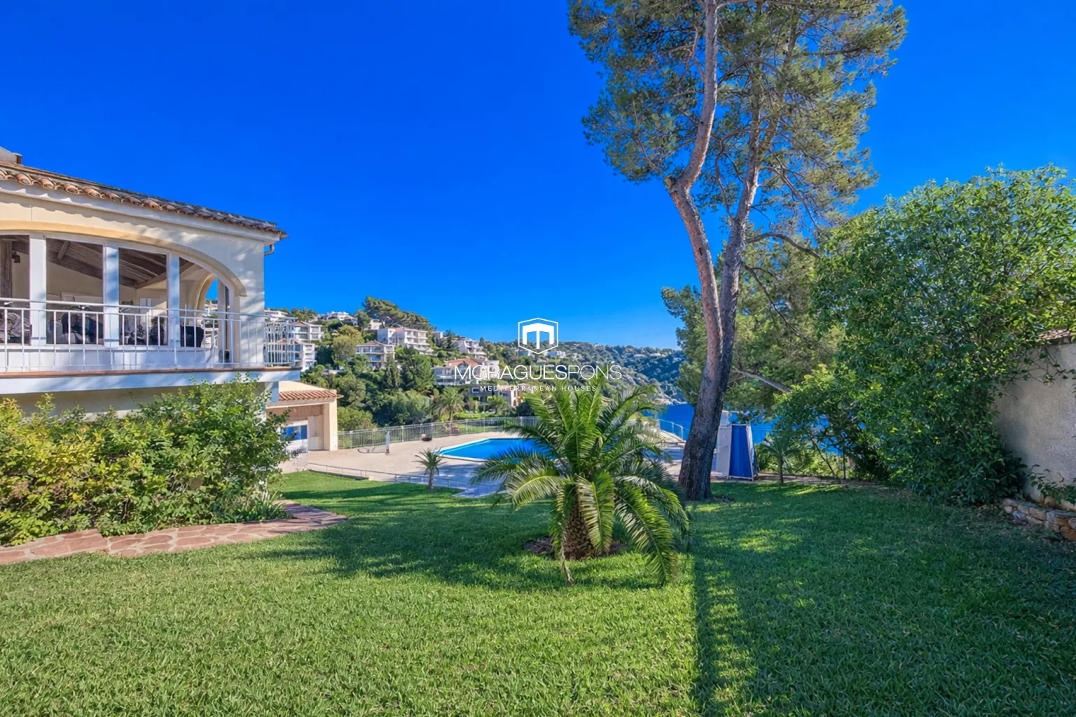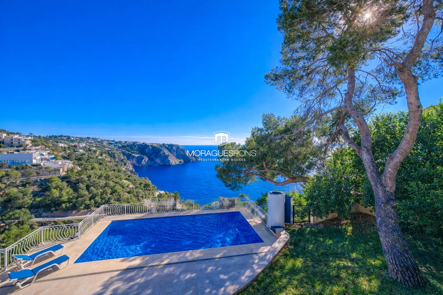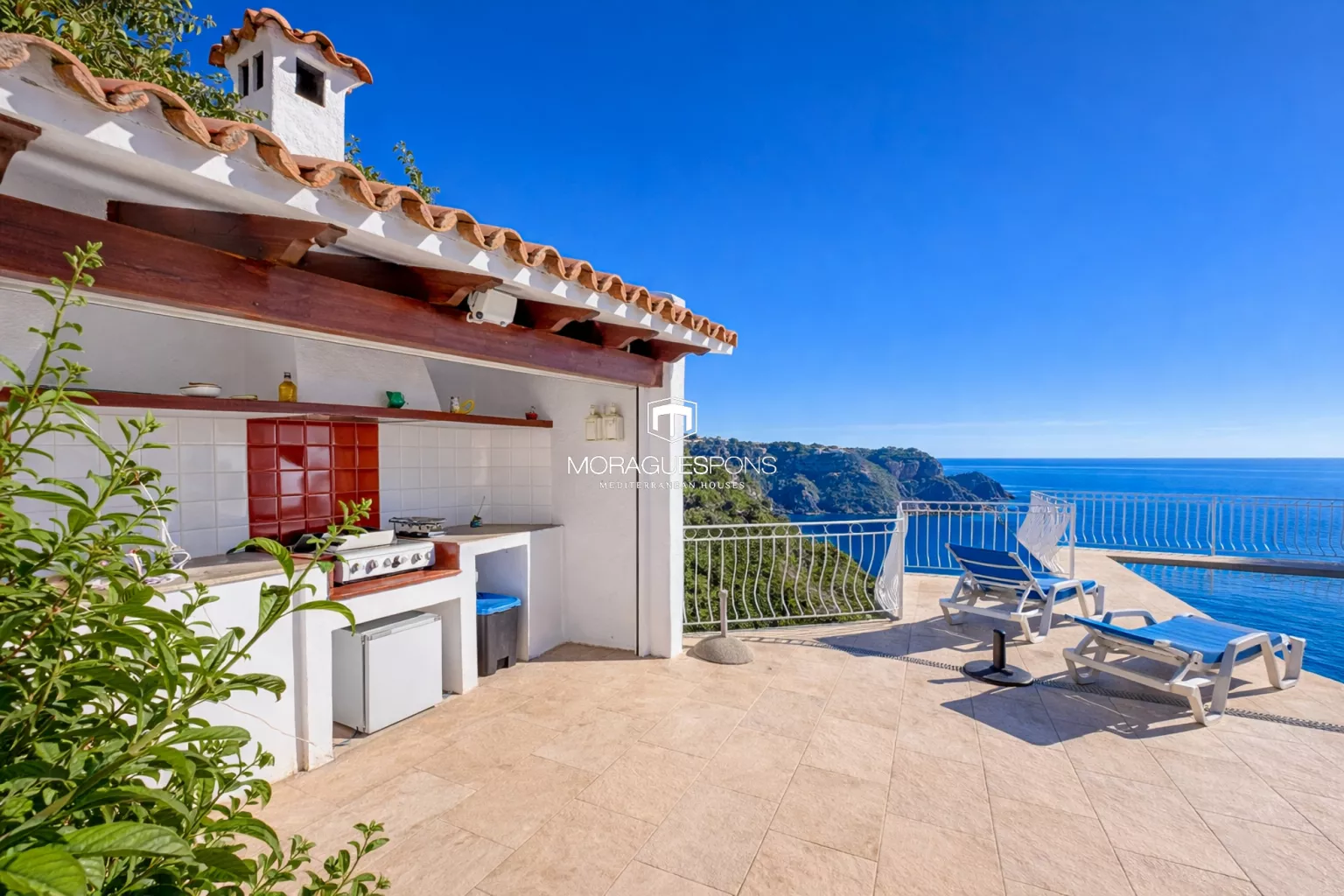 Next to the pool is a covered barbecue area, perfectly positioned for outdoor dining, family gatherings and entertaining, always with the Mediterranean as a backdrop. The garden, outdoor shower and multiple seating areas complete this inviting exterior.
