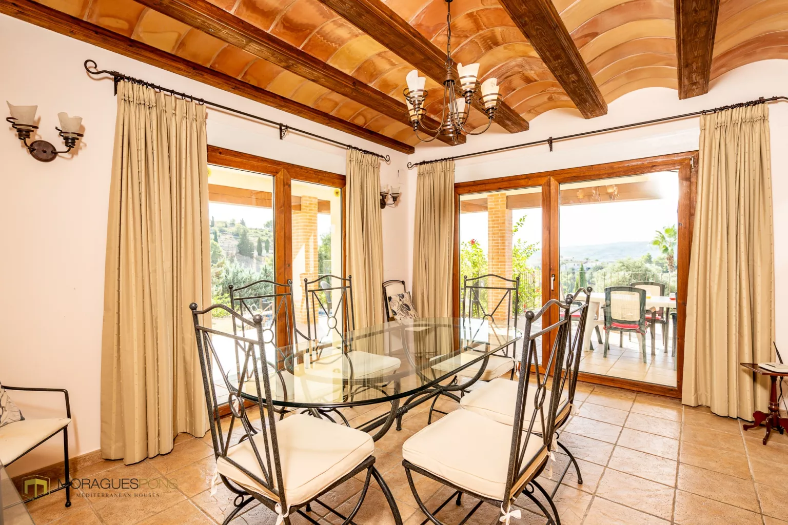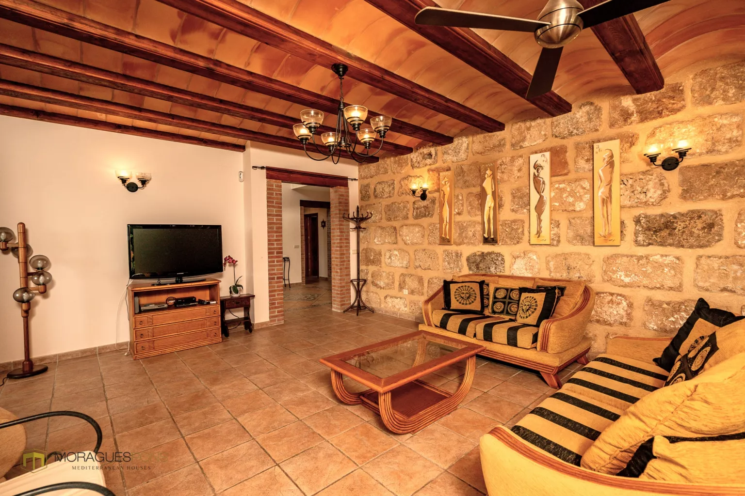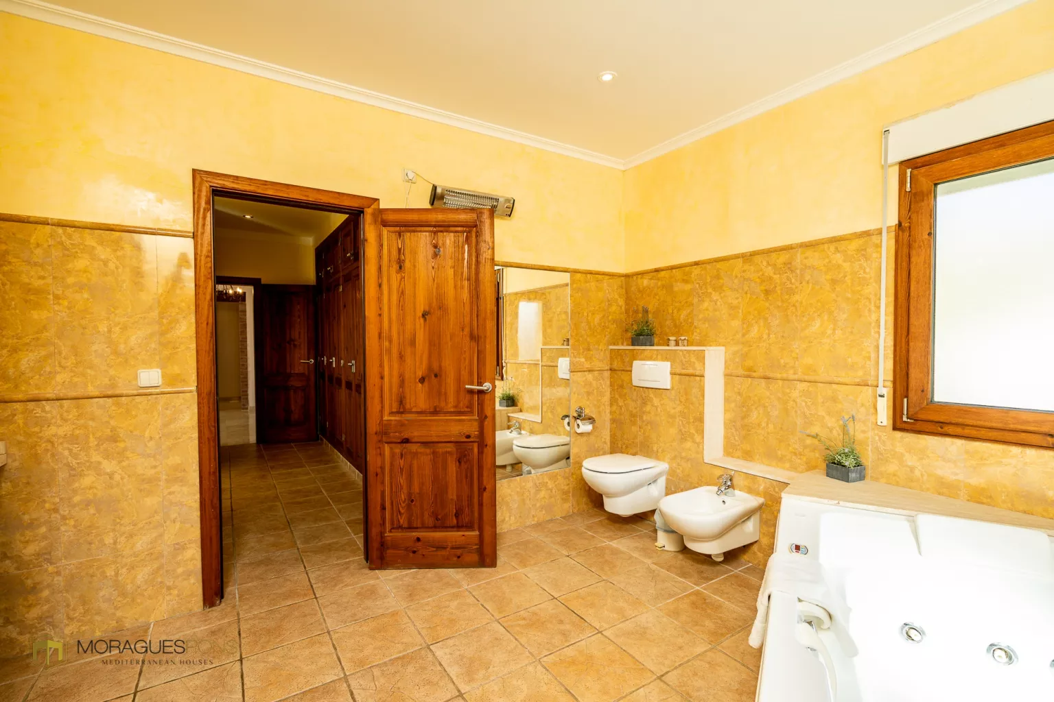The property sits on a plot of 1514m2 with a build size of 332m2 plus 110m2 naya. From the fabulous rustic wooden front door you enter the entrance hall with high ceilings and marble staircase. The hallway leads to the living and dining room and also to the kitchen with separate utility room. The living room is large and spacious with a cosy fireplace. The dining room leads to the kitchen and access to a large covered naya and terrace overlooking the pool and garden. The kitchen with separate utility room is spacious and has access to a small terrace. On the main floor there are two good sized bedrooms with fitted wardrobes, a bathroom and a guest toilet.