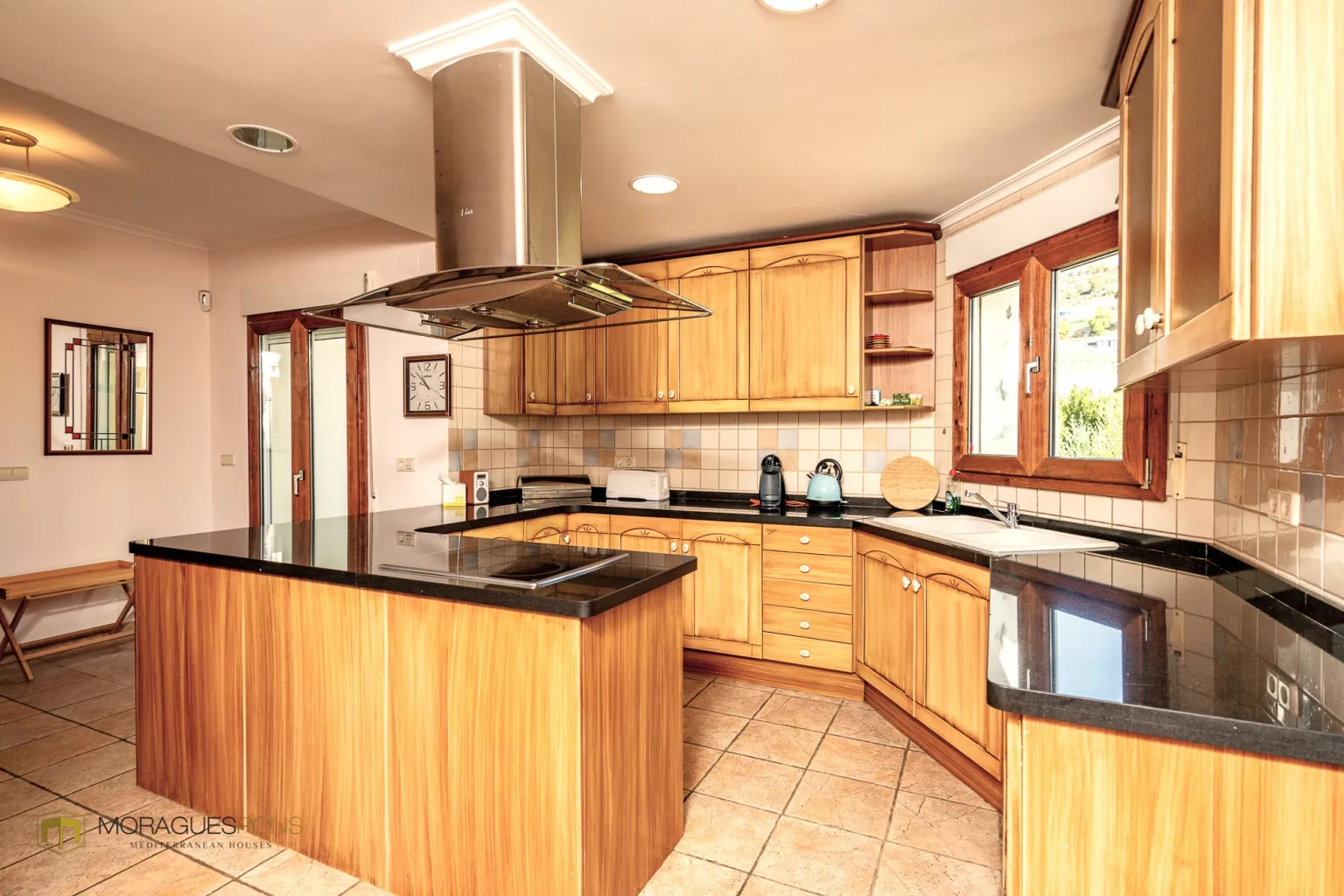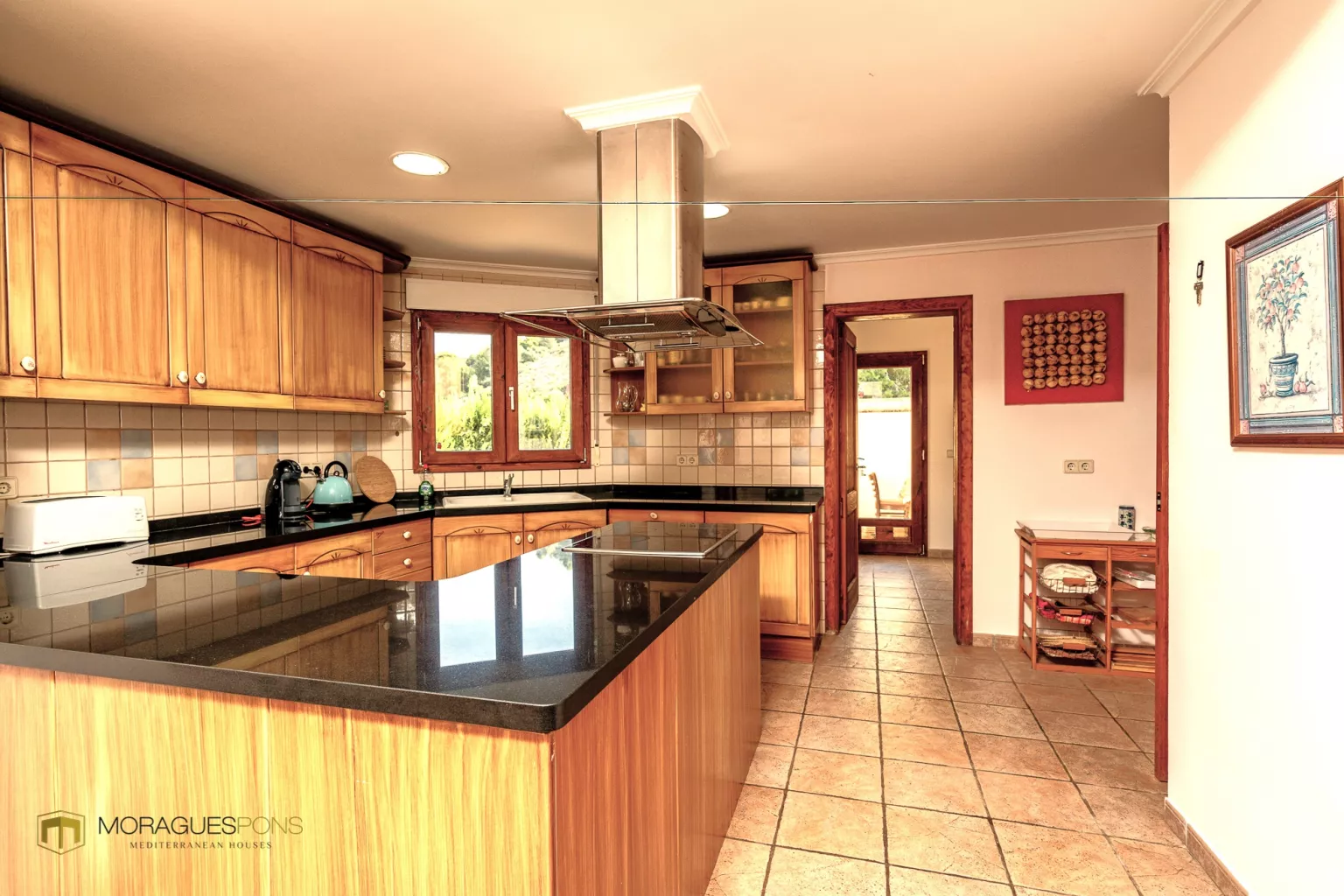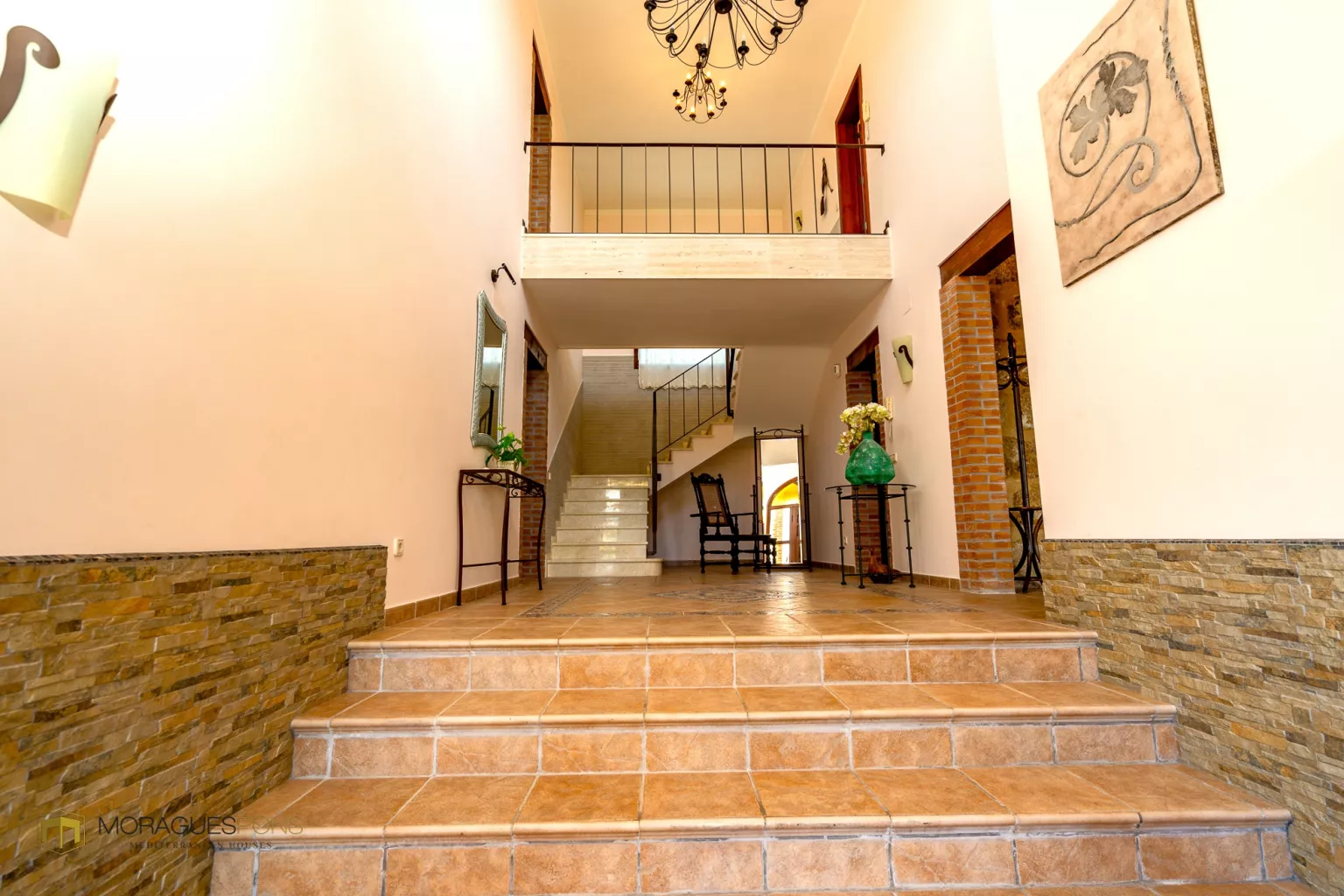 The property sits on a plot of 1514m2 with a build size of 332m2 plus 110m2 naya. From the fabulous rustic wooden front door you enter the entrance hall with high ceilings and marble staircase. The hallway leads to the living and dining room and also to the kitchen with separate utility room. The living room is large and spacious with a cosy fireplace. The dining room leads to the kitchen and access to a large covered naya and terrace overlooking the pool and garden. The kitchen with separate utility room is spacious and has access to a small terrace. On the main floor there are two good sized bedrooms with fitted wardrobes, a bathroom and a guest toilet.