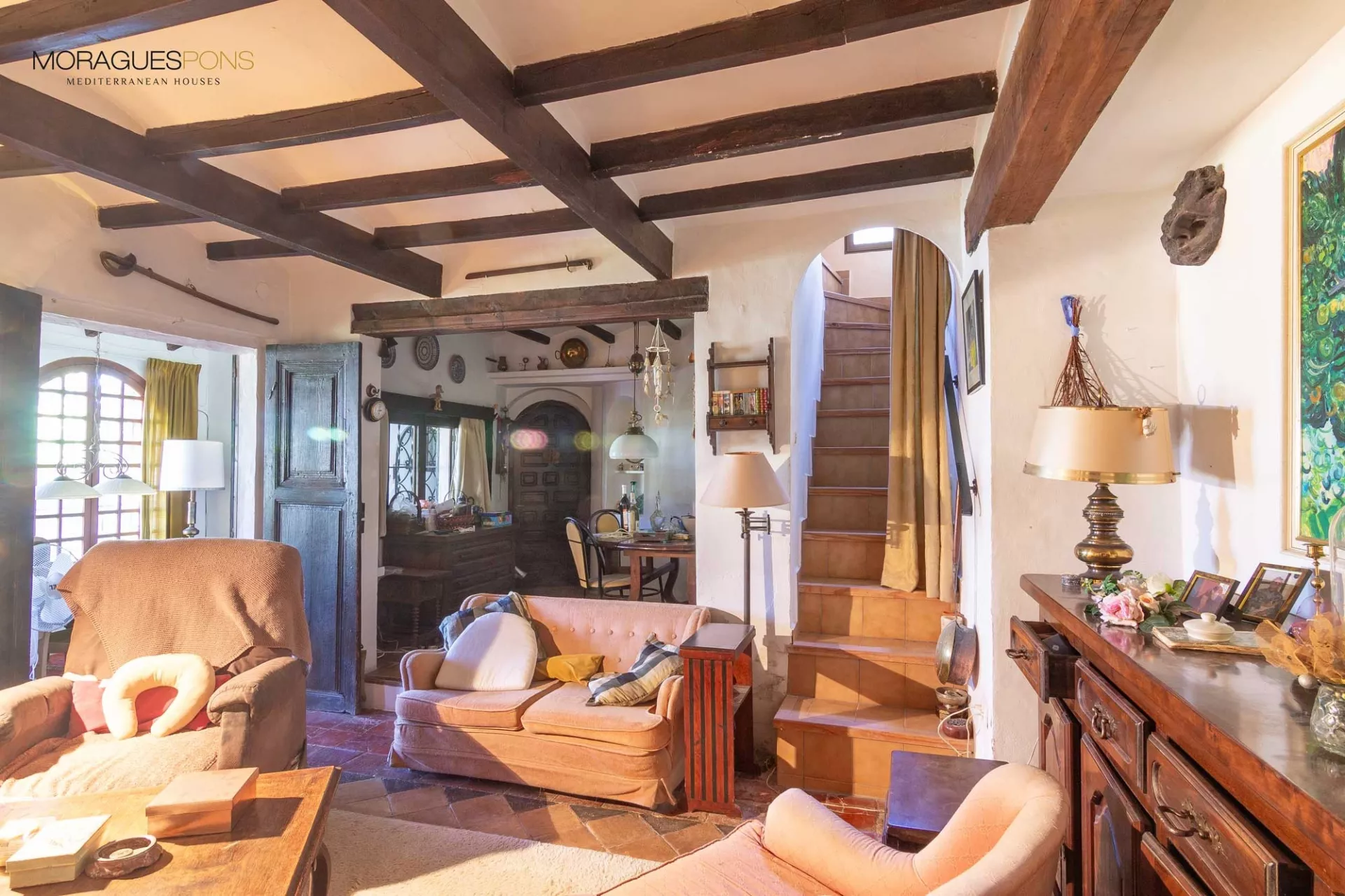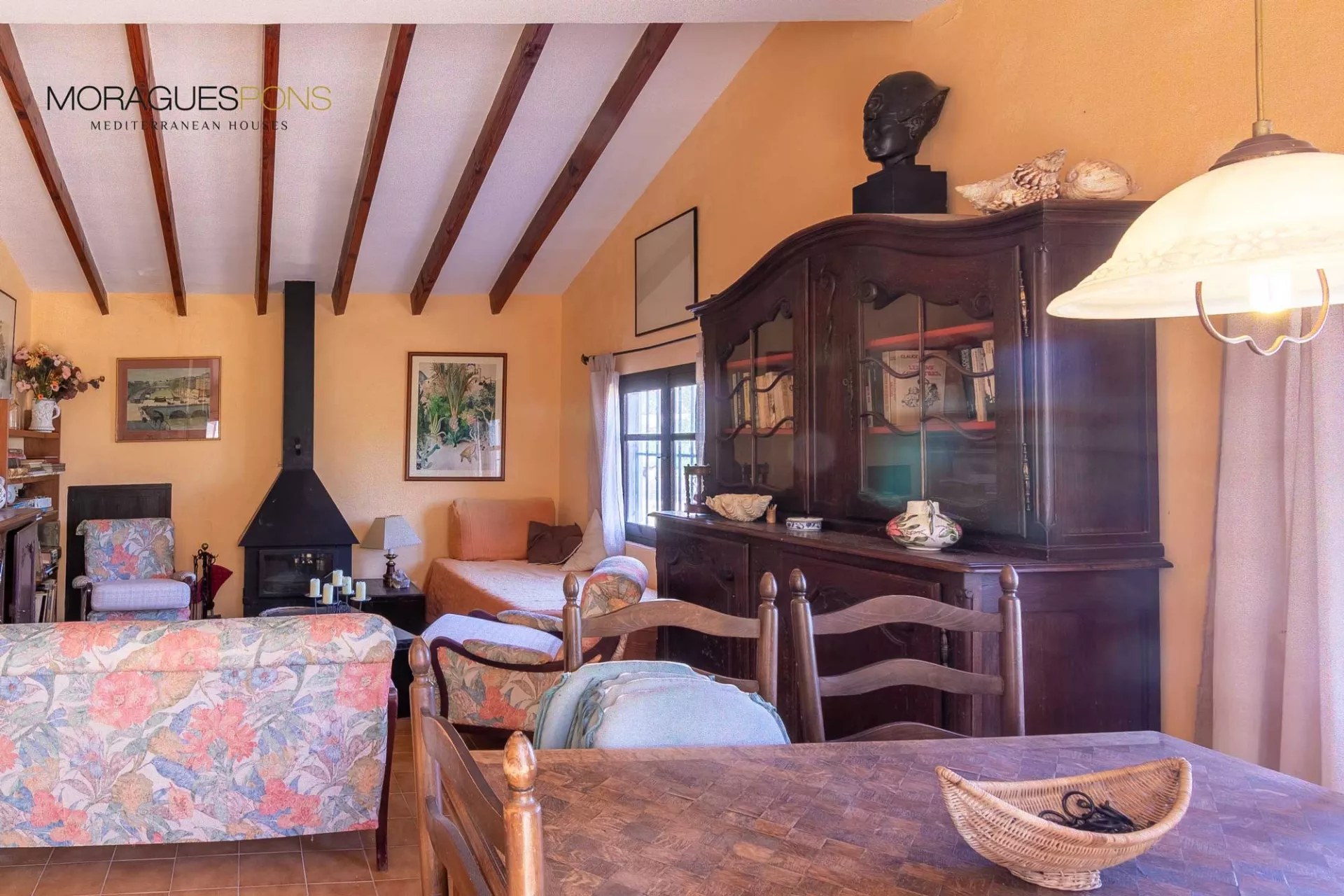 Chez MORAGUESPONS, nous aimons avoir ce type de propriétés à vendre. Des propriétés avec des détails qui leur donnent du caractère, qui montrent l'authenticité de la tradition architecturale de Jávea ; poutres en bois, pierres brutes, sols en terre cuite, etc...
