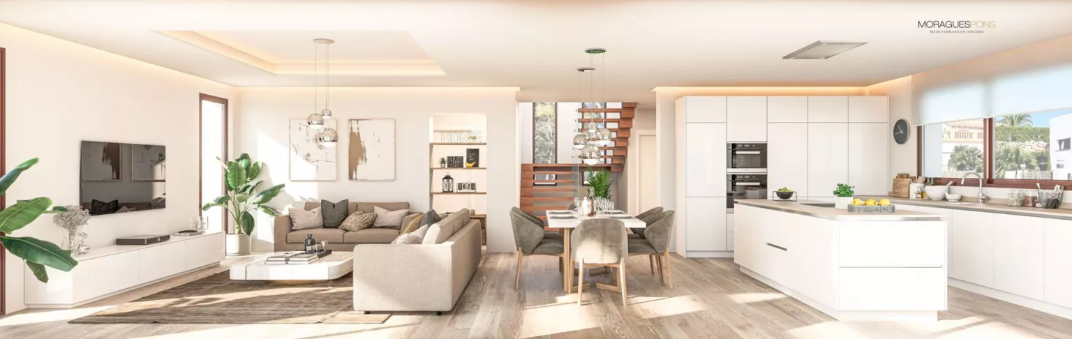 Une maison conçue pour être votre résidence habituelle ou pour venir en vacances. Avec des pièces communes spacieuses, avec la cuisine intégrée dans le salon et ouverte à son tour sur le jardin et la piscine, imaginez pouvoir tout faire communiquer en été.