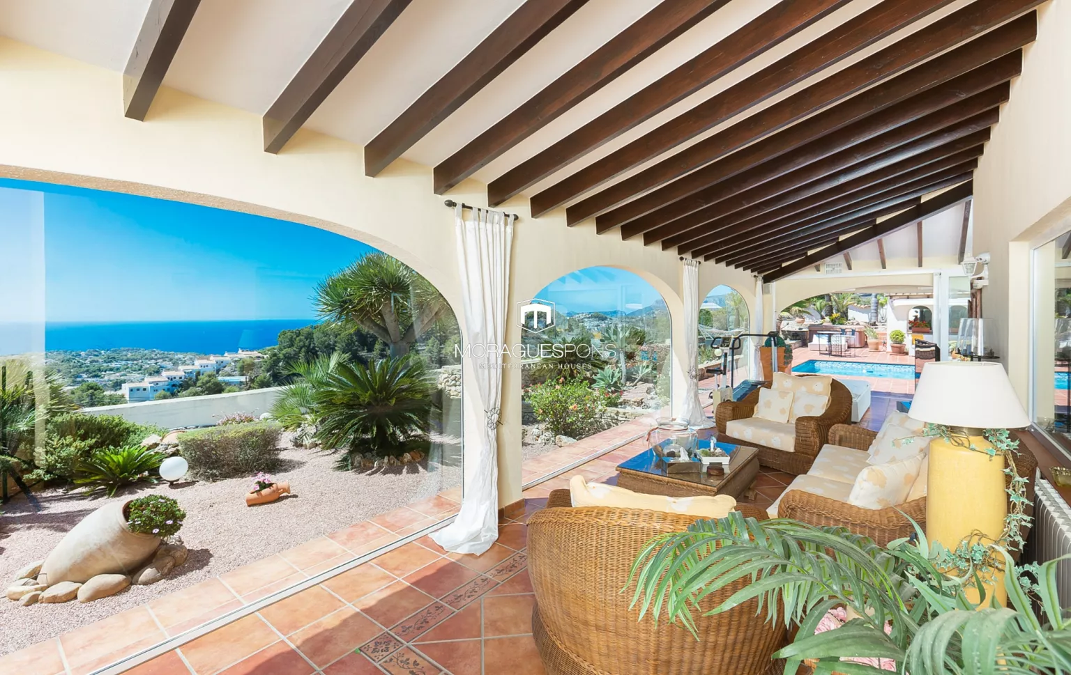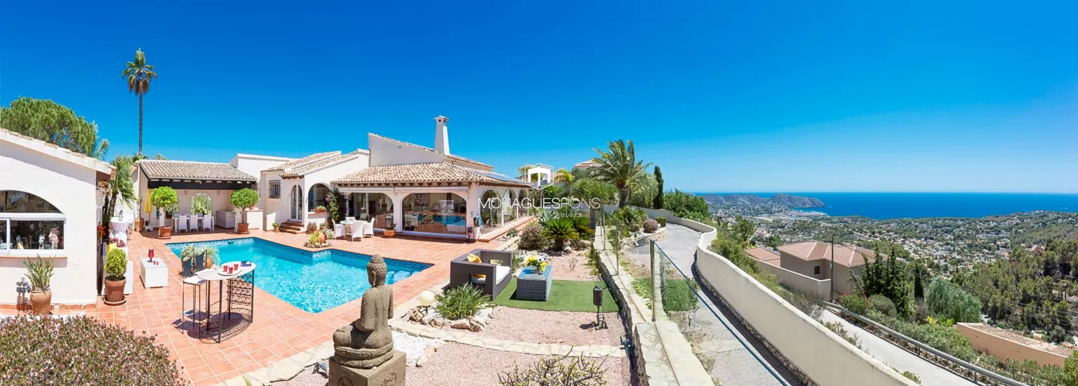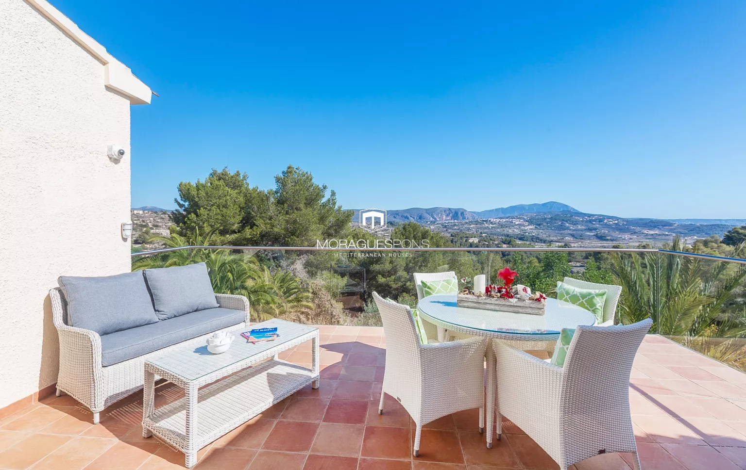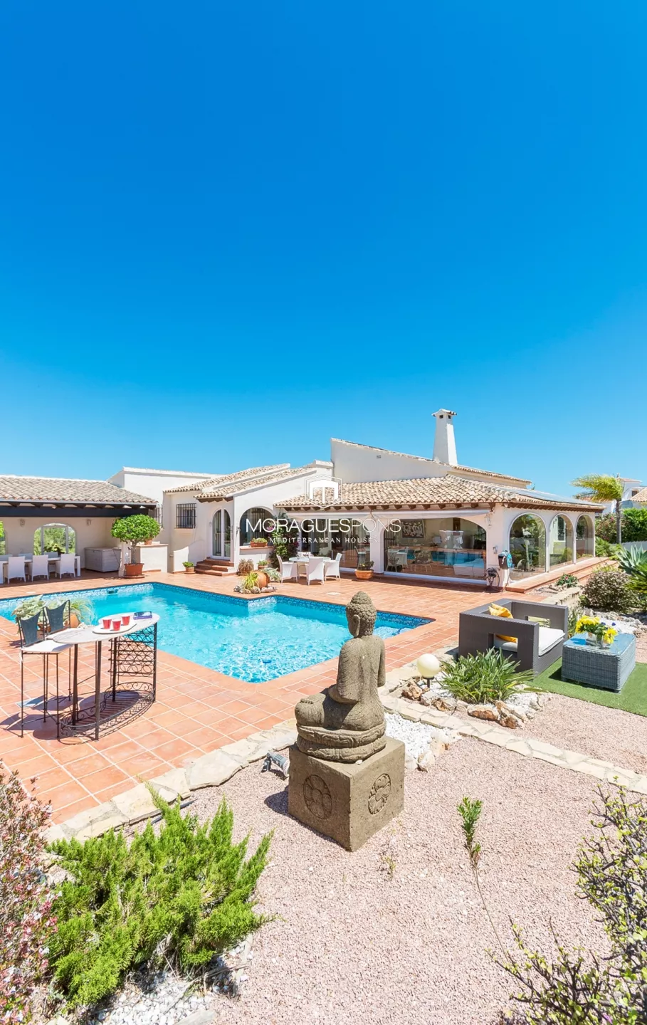 La villa comprend plusieurs chambres pour les invités, chacune conçue avec style et confort, ainsi que différents espaces pensés pour la détente, reflétant le mode de vie paisible de Moraira. À l’extérieur, la terrasse principale avec bar et cuisine d’été devient le cœur de la maison — idéale pour les repas en famille, les déjeuners en plein air ou simplement profiter de longues après-midis ensoleillées.