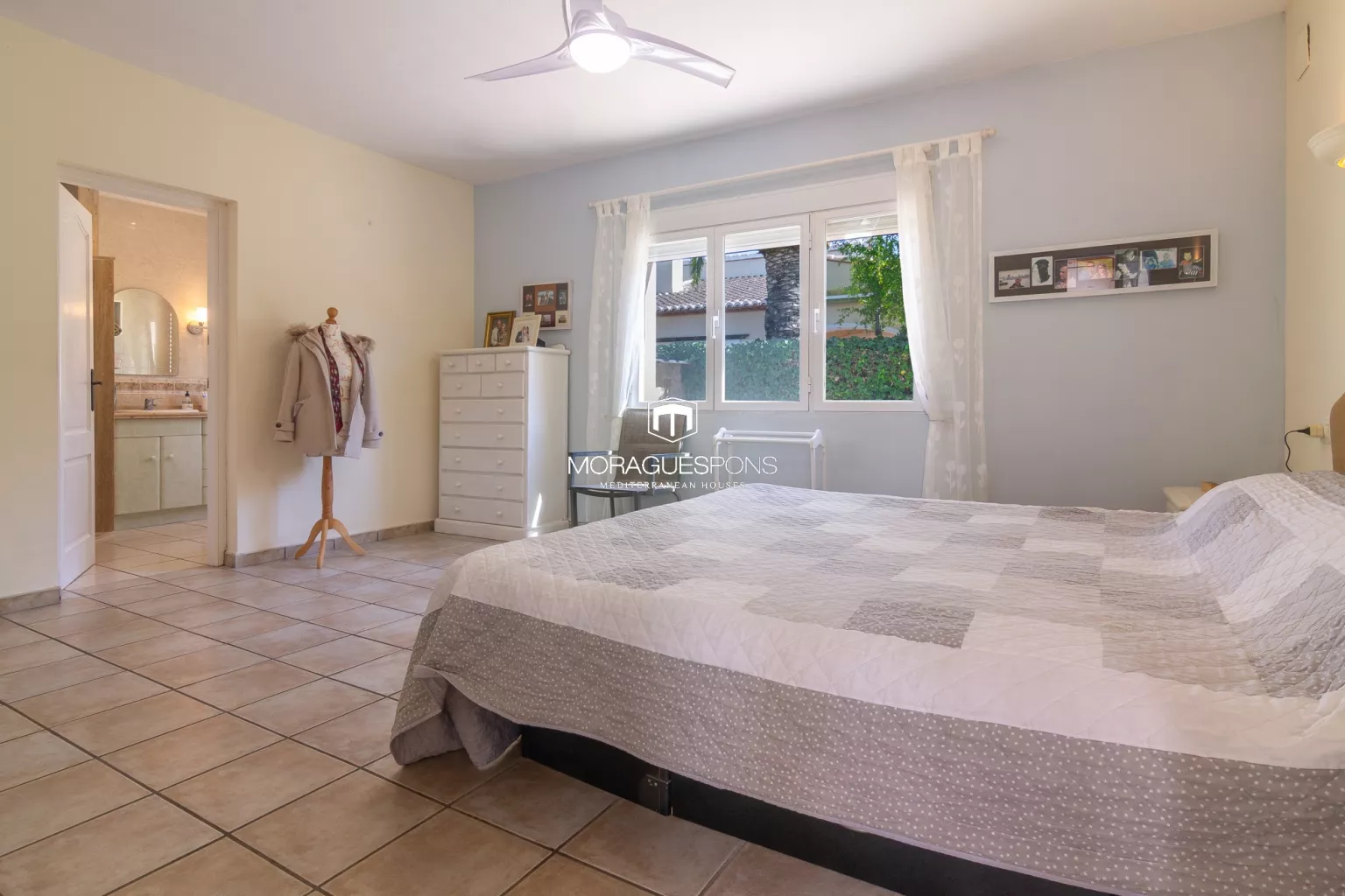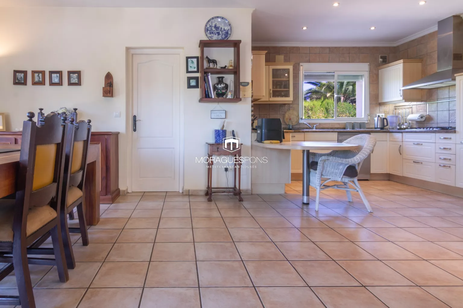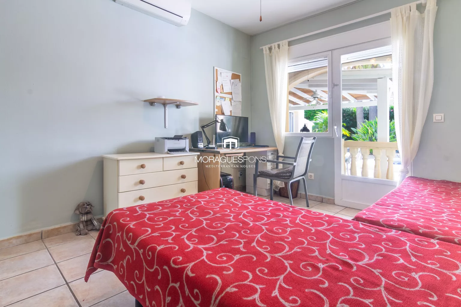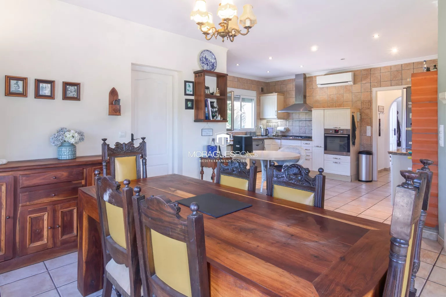 Un jardin méditerranéen mature entoure la villa, avec en son centre une grande piscine privée. La cuisine d’été couverte et équipée invite à partager de longs repas, tandis qu’une salle de bains extérieure avec douche complète la zone piscine. La parcelle entièrement clôturée comprend également un parking privé spacieux, un carport et un espace de rangement.