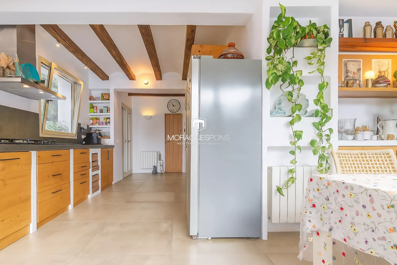 La maison principale, de plain-pied et d’environ 200 m², associe matériaux naturels, poutres apparentes et grandes baies vitrées qui relient l’intérieur à l’extérieur. Le salon spacieux, avec cheminée et accès direct à la terrasse couverte, invite à de longues soirées d’été face au jardin. La cuisine, à la fois fonctionnelle et chaleureuse, conserve son âme méditerranéenne avec une touche contemporaine.