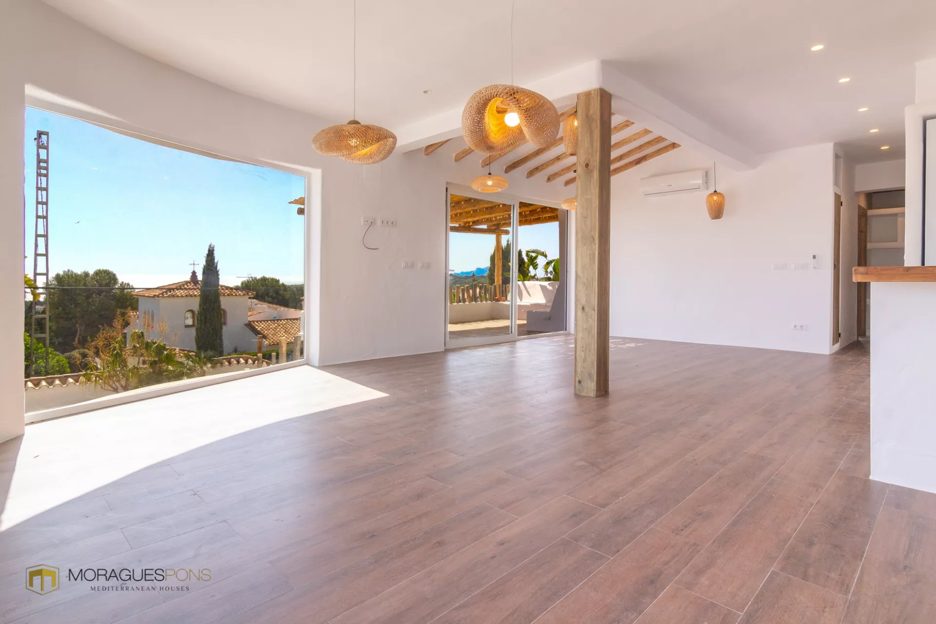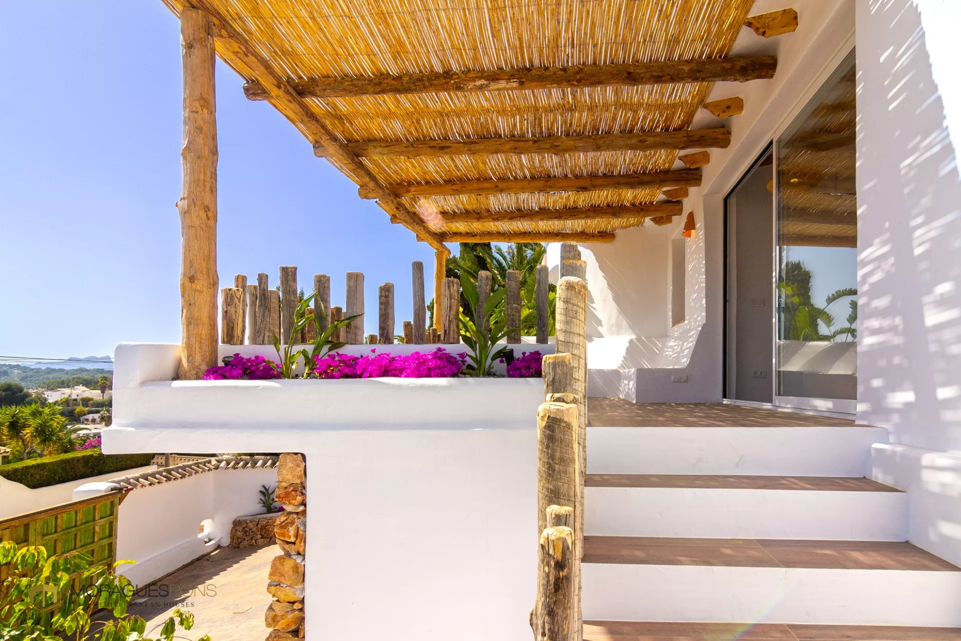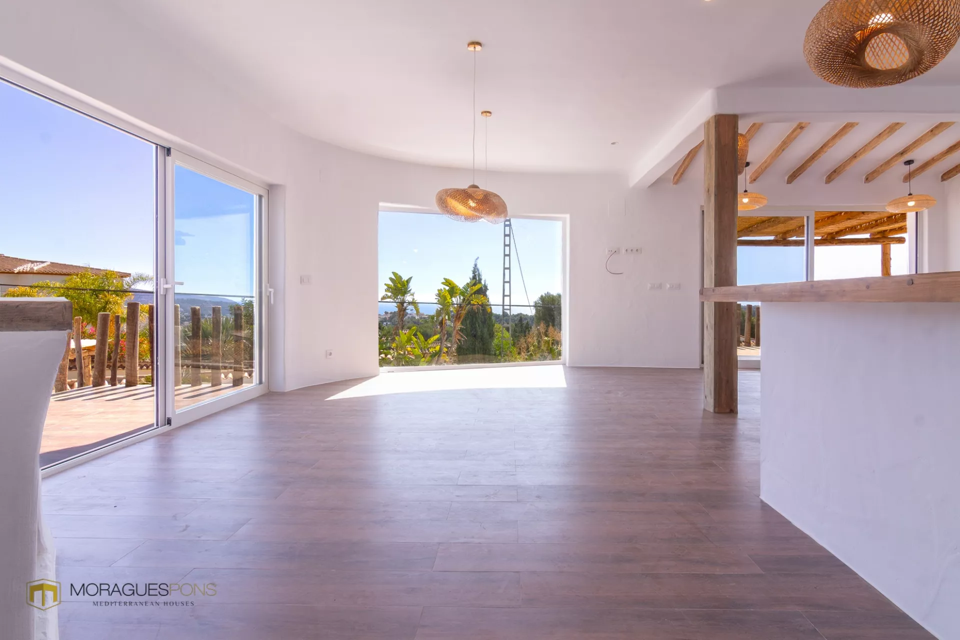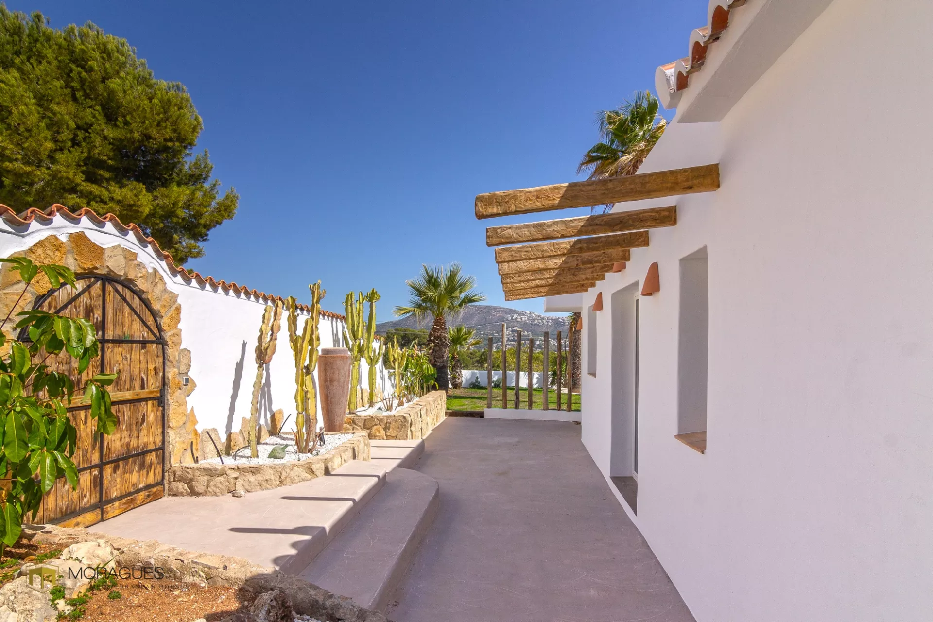 Plongez dans le charme méditerranéen de cette spectaculaire villa de style Ibiza à Moraira. Bénéficiant d'une vue imprenable sur la mer et récemment rénovée, cette propriété allie la tranquillité de la côte au luxe moderne. Le jardin luxuriant de bougainvilliers entoure la maison, où vous pourrez profiter d'une piscine étincelante, de pergolas en bois et en roseaux, d'un barbecue pour les soirées d'été, de pelouses luxuriantes et de nombreux espaces pour s'asseoir.