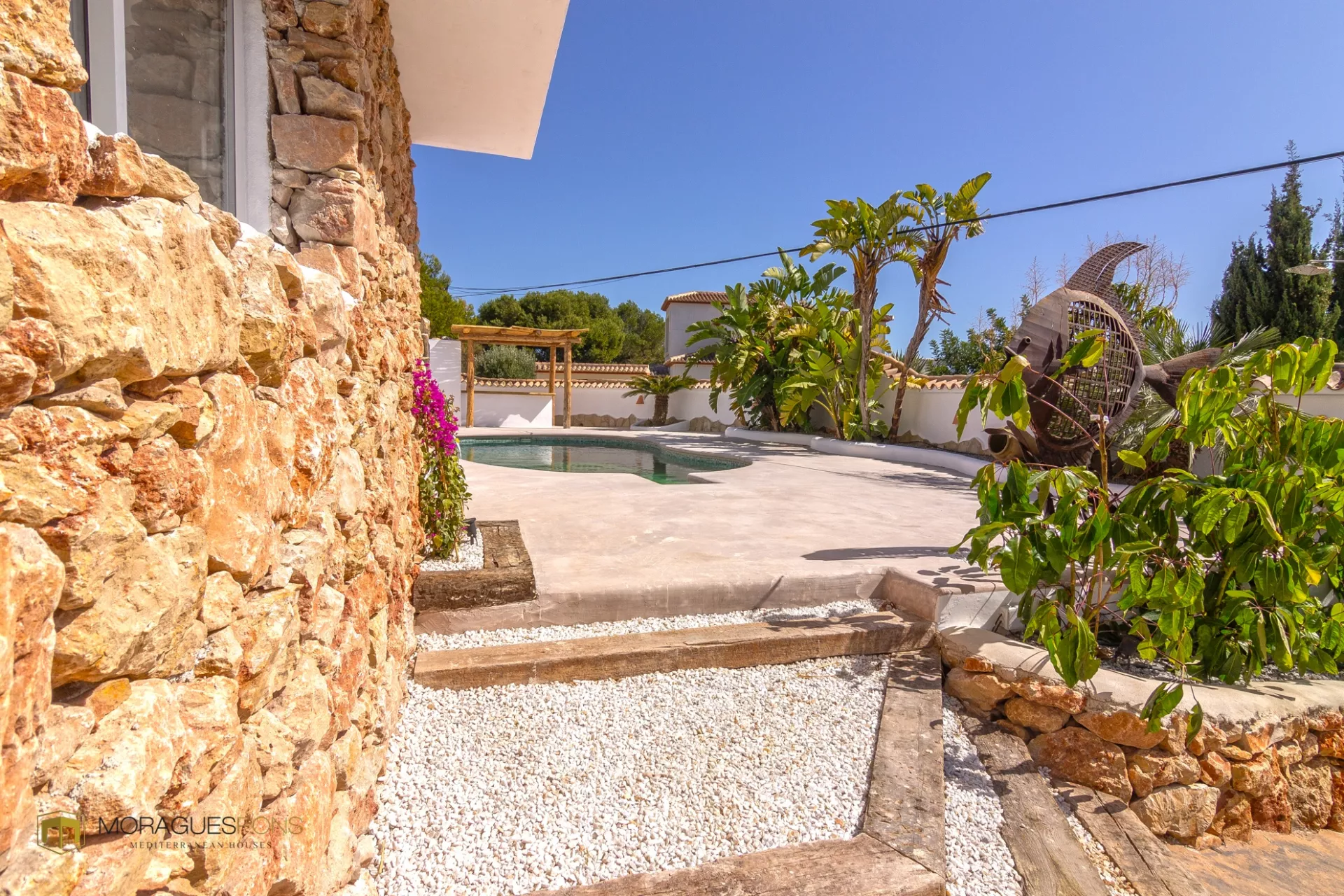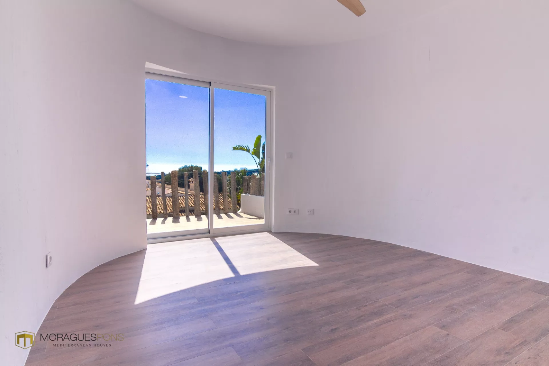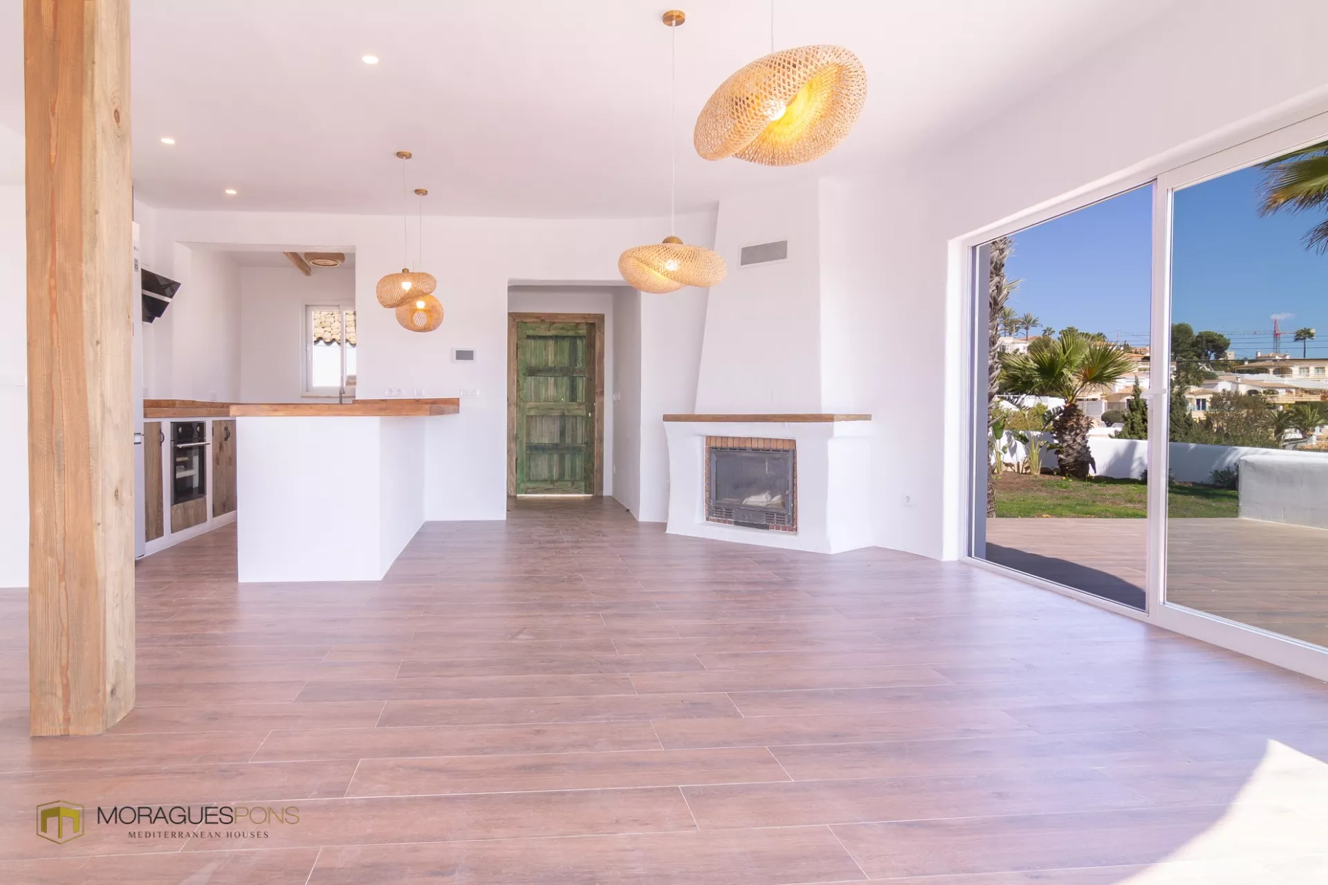 Plongez dans le charme méditerranéen de cette spectaculaire villa de style Ibiza à Moraira. Bénéficiant d'une vue imprenable sur la mer et récemment rénovée, cette propriété allie la tranquillité de la côte au luxe moderne. Le jardin luxuriant de bougainvilliers entoure la maison, où vous pourrez profiter d'une piscine étincelante, de pergolas en bois et en roseaux, d'un barbecue pour les soirées d'été, de pelouses luxuriantes et de nombreux espaces pour s'asseoir.