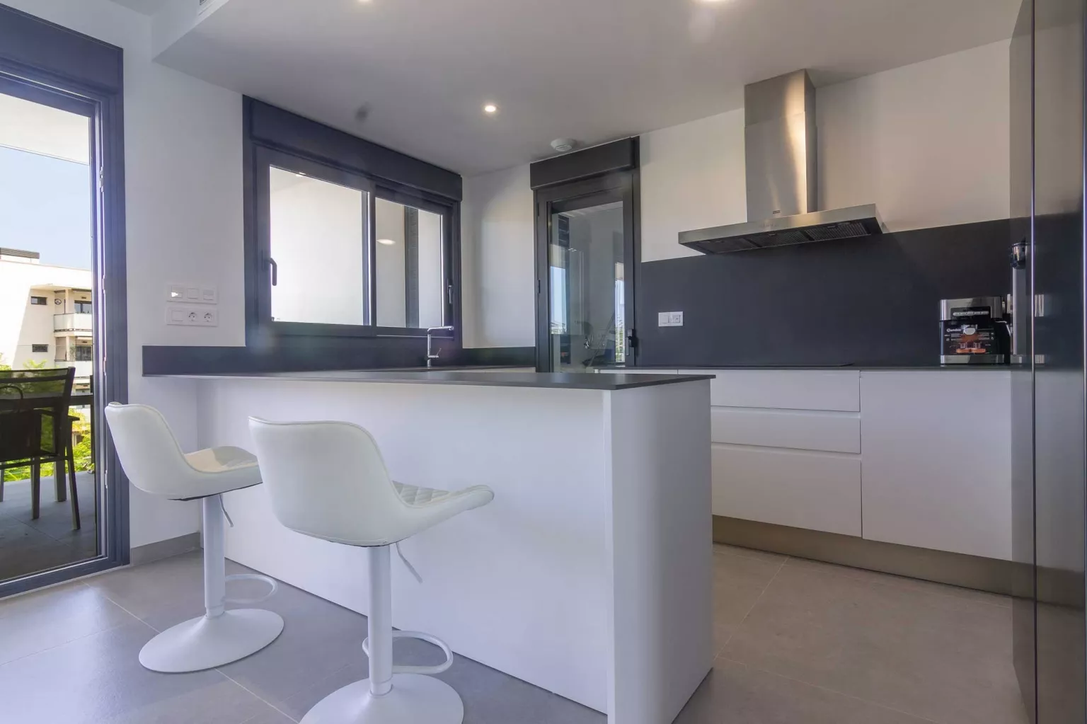 Met een moderne en warme stijl beschikt het over drie slaapkamers, een elegante keuken met een aangebouwde bar, en een ruime en lichte woonkamer met directe toegang tot een groot terras. Vanaf daar, tussen het groen van de bomen en de rust van de buurt, zie je een vleugje blauw – een stille hint naar de nabijheid van de zee.