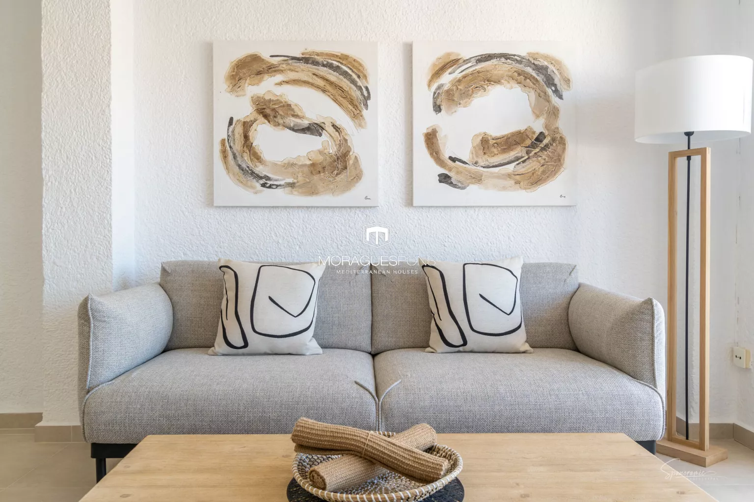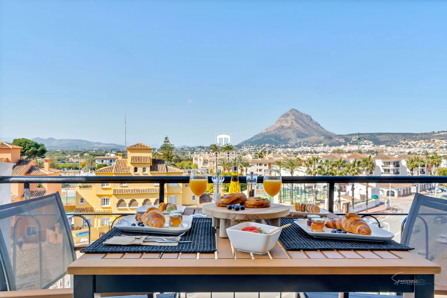 De woonkamer in moderne mediterrane stijl opent naar het balkon, waar de Montgó centraal staat — perfect voor ontbijt in de zon of ontspannen avonden.