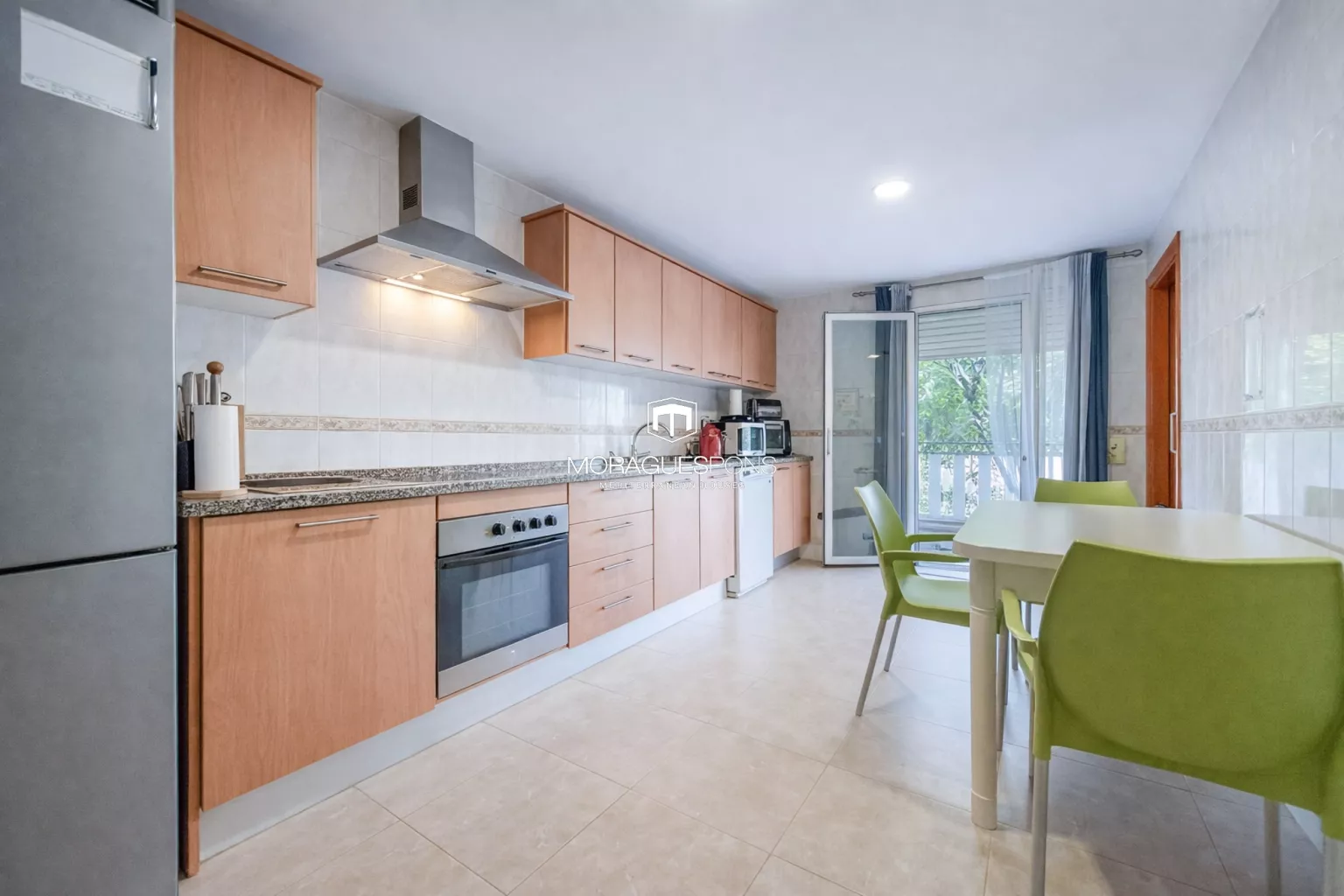 De woon-eetkamer heeft toegang tot een balkon met uitzicht op een park, wat zorgt voor een aangename en open leefruimte, perfect om van buiten te genieten met behoud van privacy. Een comfortabele ruimte die het hele jaar door prettig is.
