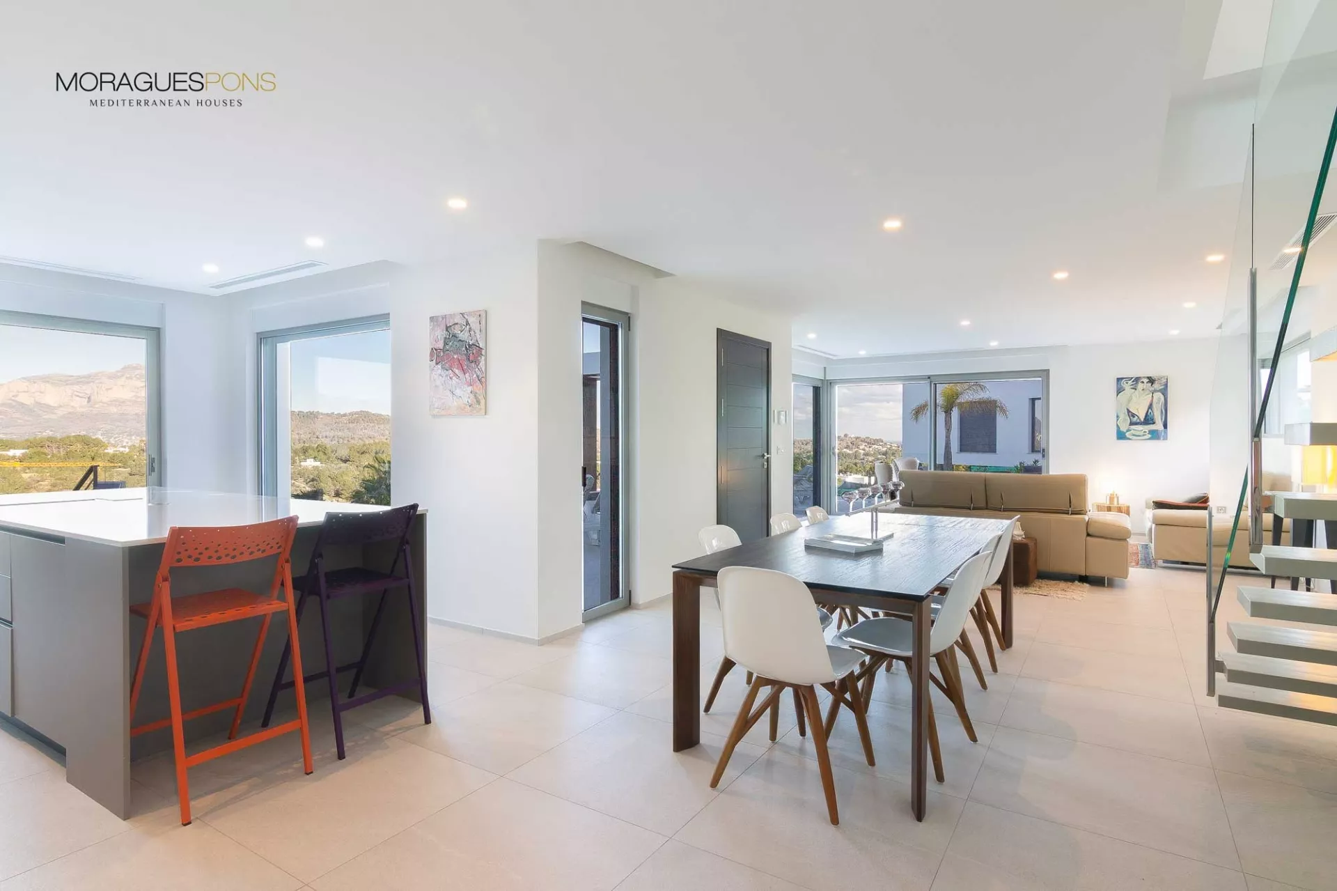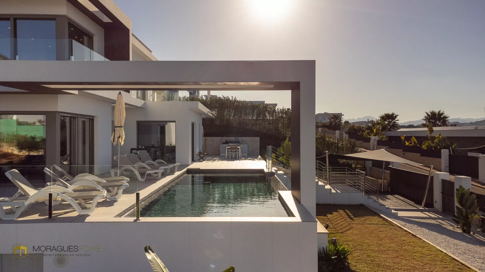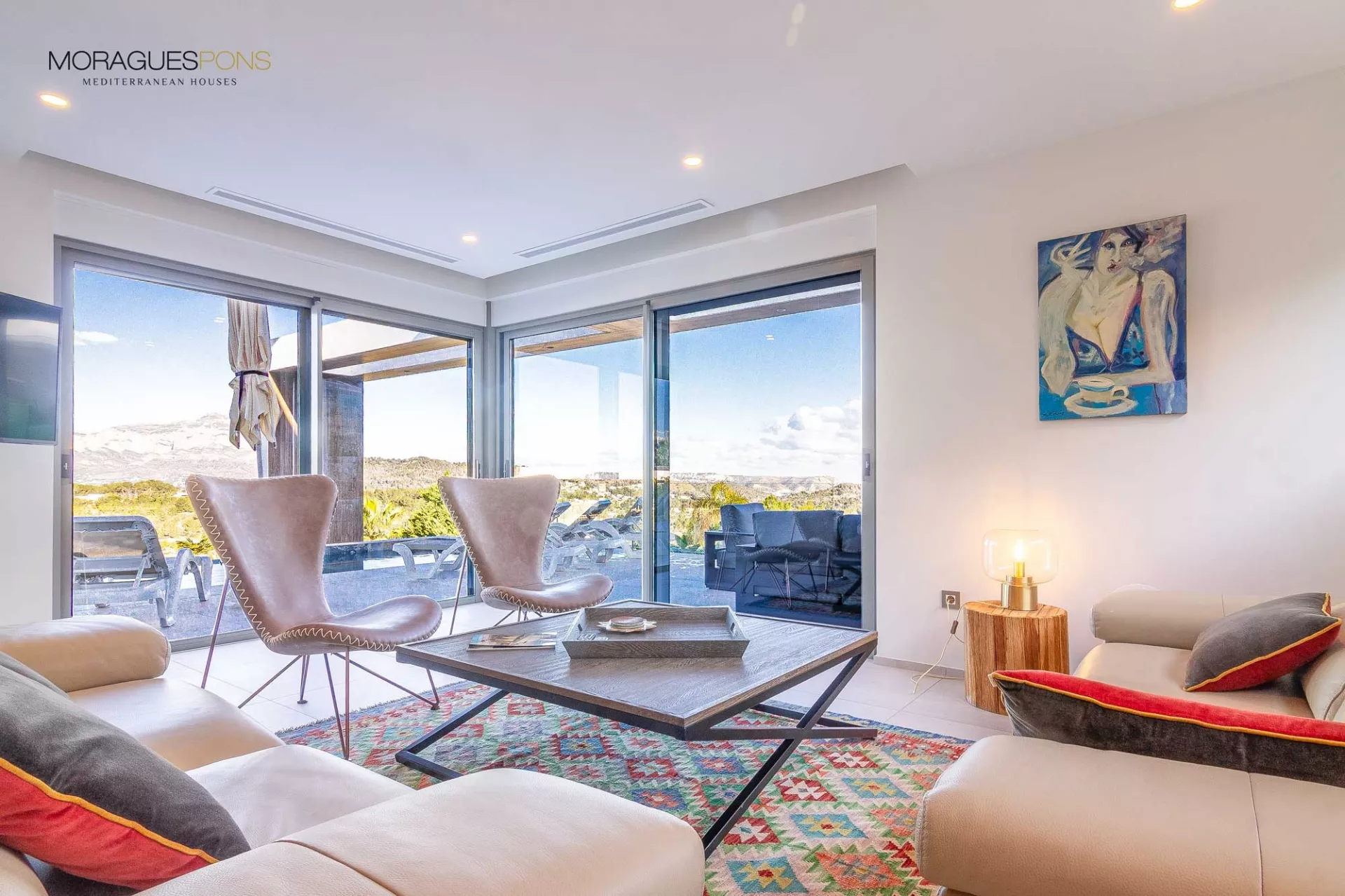 Dit moderne huis ligt in het wooncomplex Villes al Vent, in Jávea. Het huis is gebouwd in 2023 door een bekende bouwer, heeft 225 m² en ligt op een perceel van 1022 m².
