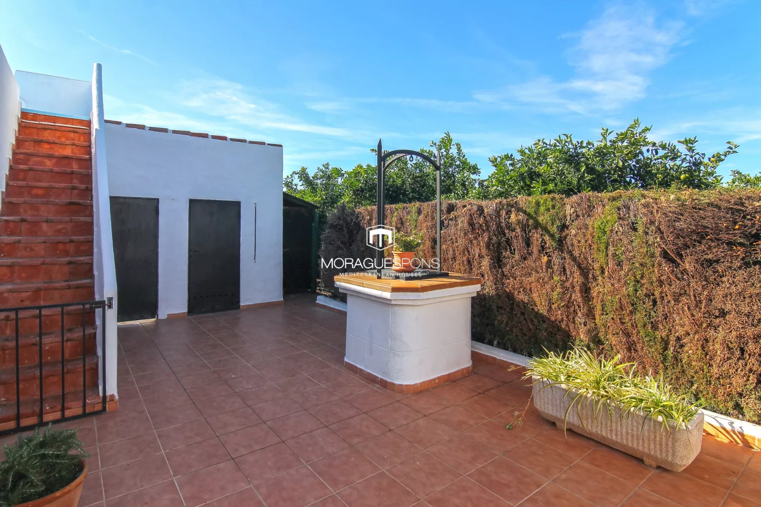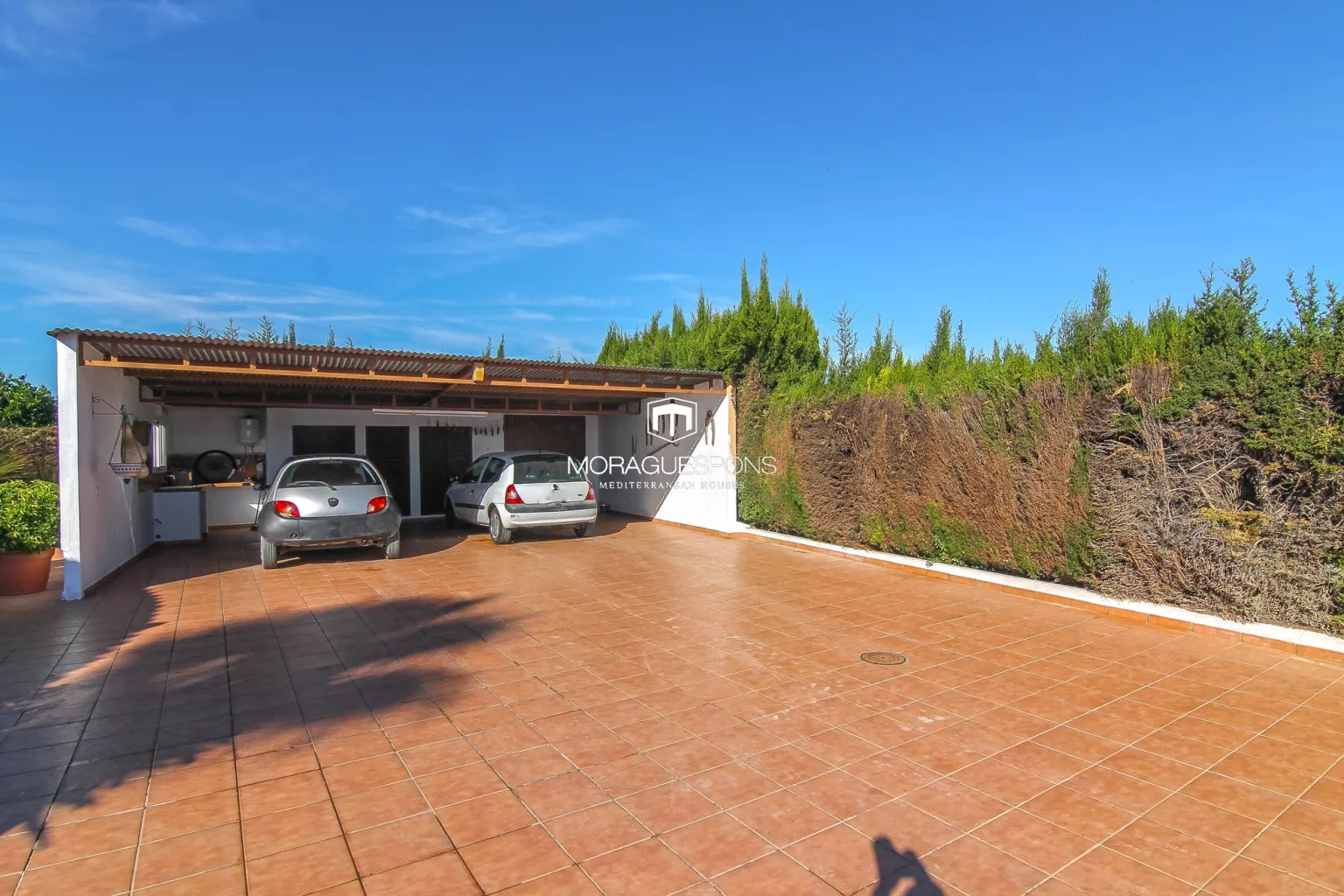 Verder beschikt het huis over een wasruimte, een overdekte parkeerplaats voor drie auto’s en een natuurlijk pareltje: een kleine sinaasappelboomgaard die de lucht vult met geur en ruimte biedt om eventueel een zwembad aan te leggen.