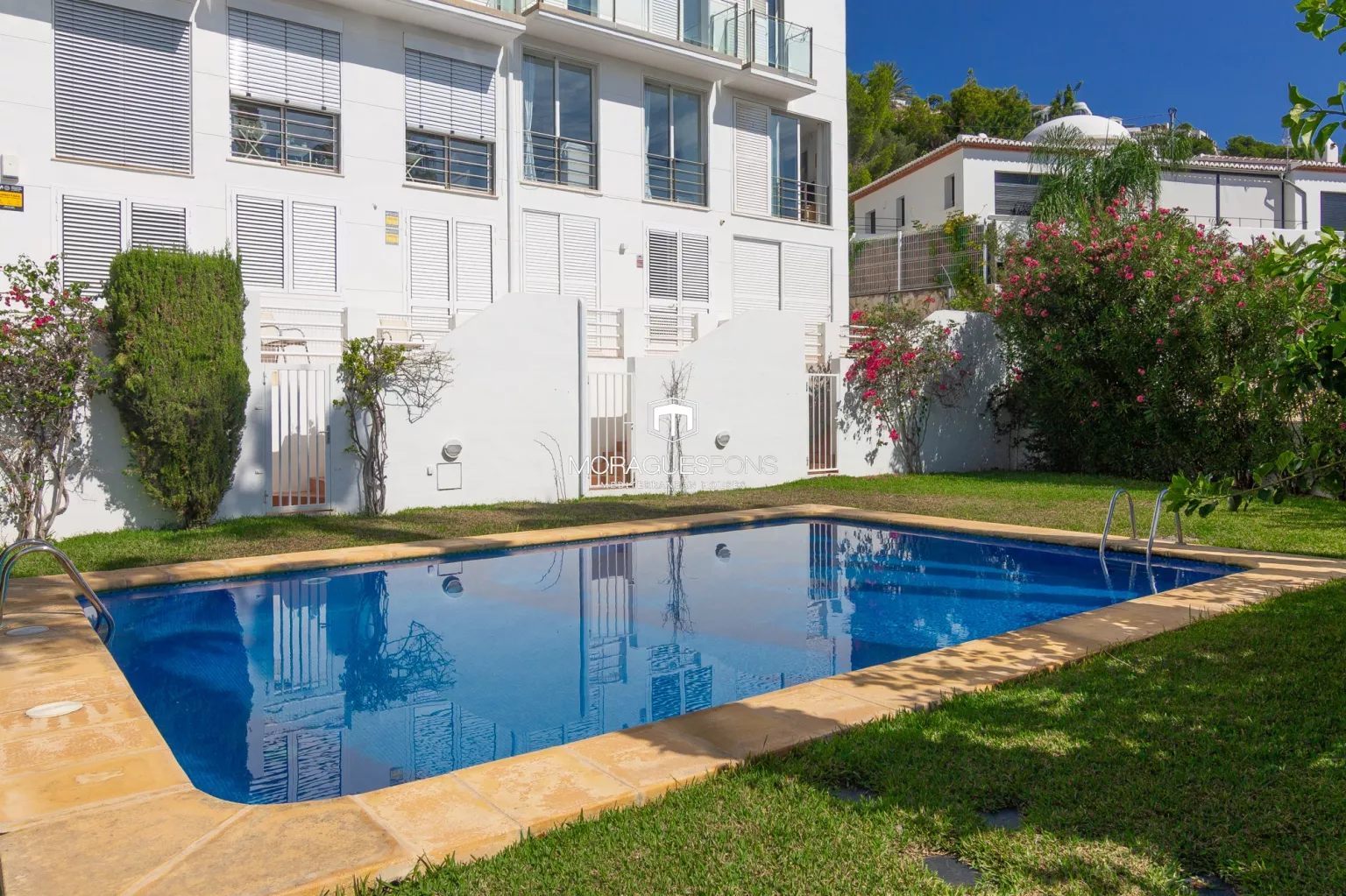 Este adosado destaca por su excelente ubicación, a tan solo 2 minutos andando del puerto de Jávea, en una urbanización consolidada al inicio de la cuesta de San Antonio.
