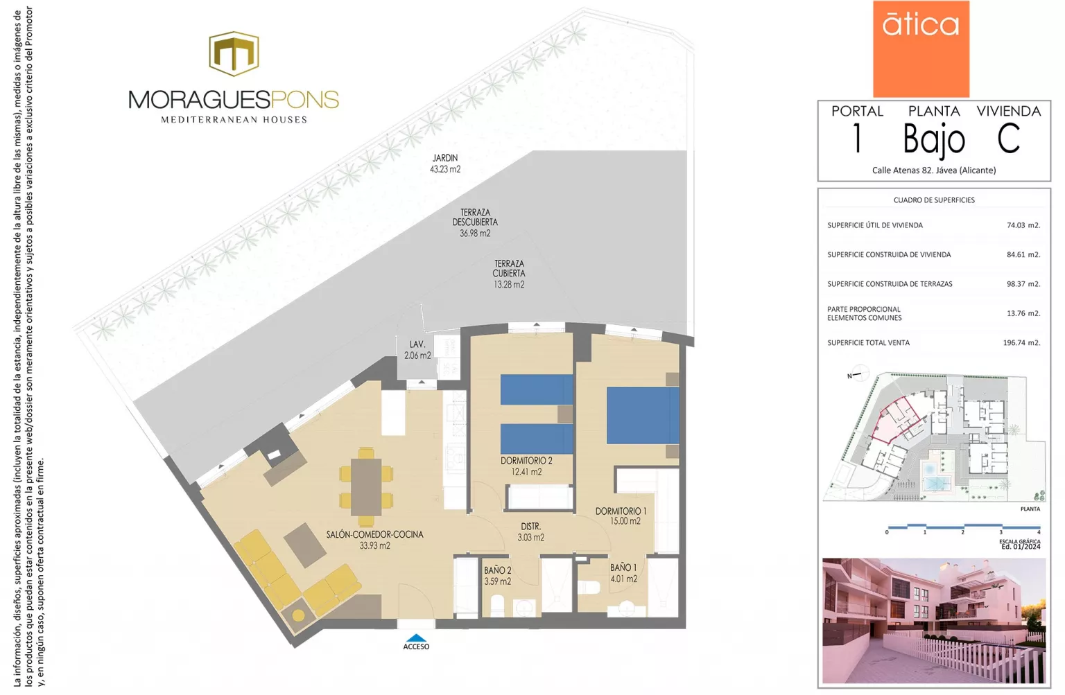 Atenas 82, se encuentra a dos minutos andando a la orilla del Mar Mediterráneo. El Residencial consta de dos bloques de viviendas de tres alturas distribuidas en planta baja, primera planta y una planta ático dúplex donde disfrutar del sol peninsular durante todo el año. Cuenta con 17 viviendas de 2, 3 y 4 dormitorios con terrazas, garaje, trastero, zona común y piscina. Consulta disponibilidad y memoria de calidades.