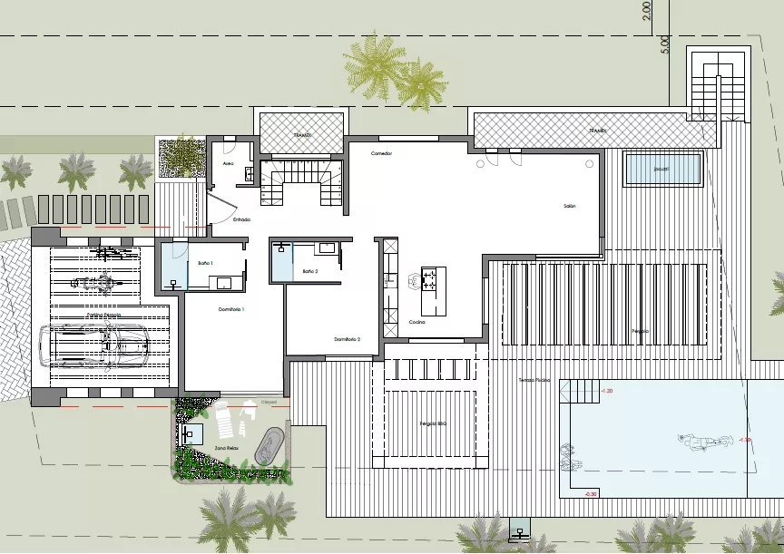 Olivos centenarios, árboles frutales, plantas aromáticas para cocinar con lo que recoges del jardín, una zona de césped natural y un estudio del espacio pensado para asegurar privacidad real.
