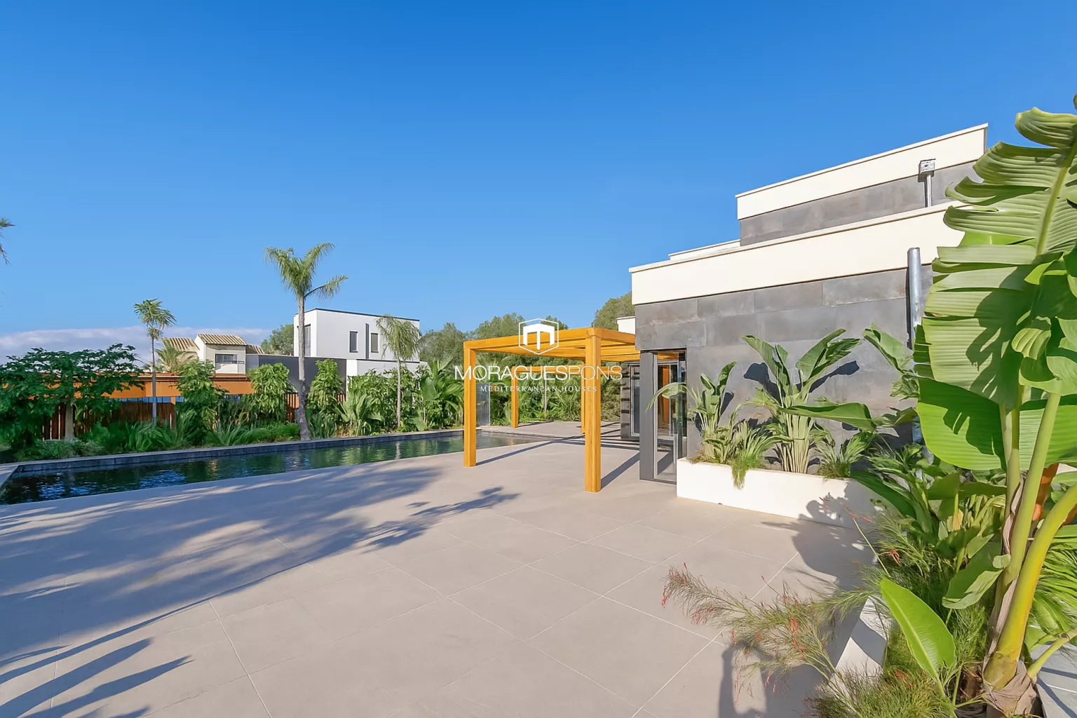 Las dos pérgolas de madera iroko —el alma del nombre de la casa— aportan carácter, calidez y un sello muy personal.