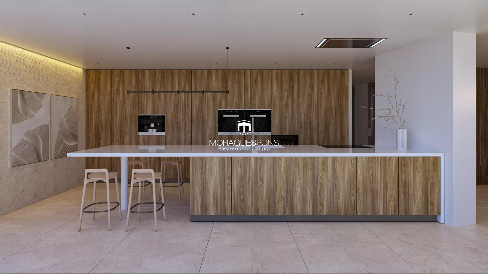 El diseño interior de la villa destaca por su elegancia y modernidad, con suelos radiantes para una temperatura ideal en todo momento y aire acondicionado por aerotermia, una solución ecológica y eficiente que proporciona un ambiente cómodo durante todo el año.