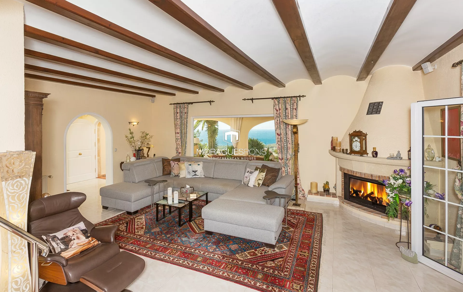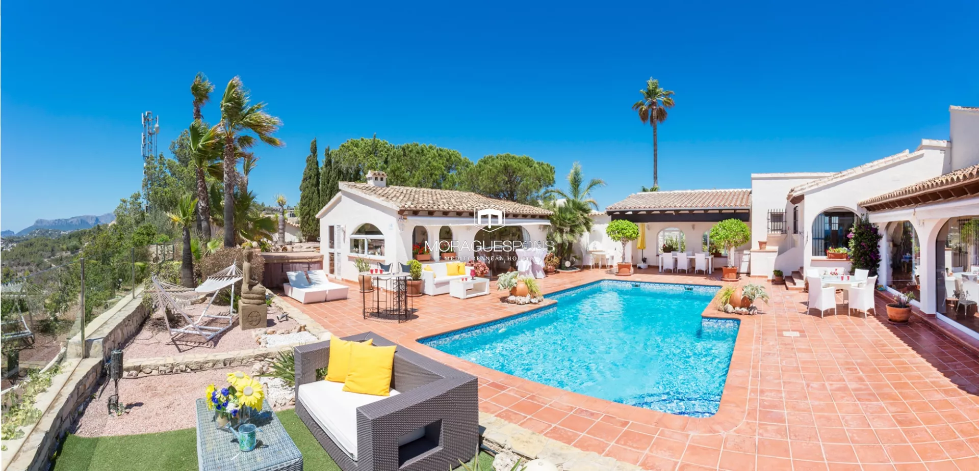 La casa ofrece varios dormitorios para invitados, todos diseñados con estilo y confort, junto a diferentes rincones pensados para el descanso y la vida relajada que caracteriza a Moraira. En el exterior, la terraza principal con bar y cocina de verano se convierte en el centro social de la vivienda, ideal para reuniones familiares, comidas al aire libre o simplemente disfrutar de las largas tardes bajo el sol.