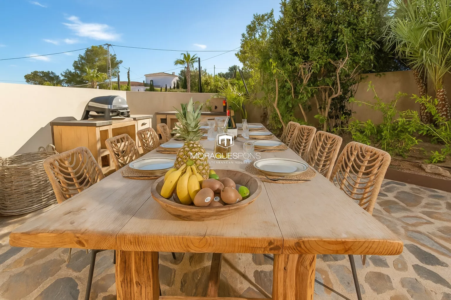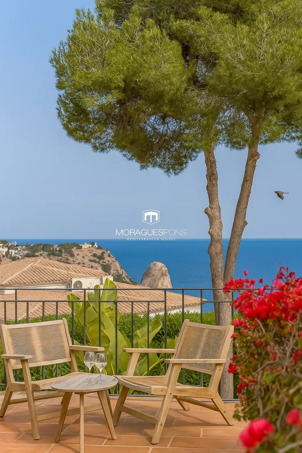 Su interior es elegante y cálido La villa sorprende por su armoniosa mezcla de estilos mediterráneos y detalles personalizados. La cocina abierta fluye hacia el salón con zona de comedor, creando un ambiente único y acogedor. Las columnas de balaustre y los arcos en las terrazas exteriores enmarcan espectaculares vistas panorámicas al mar y la montaña.