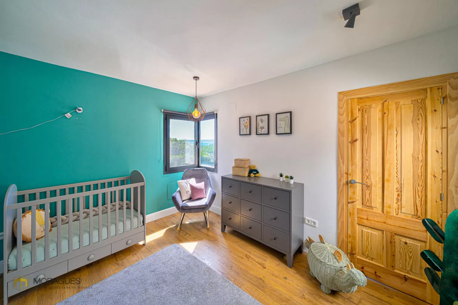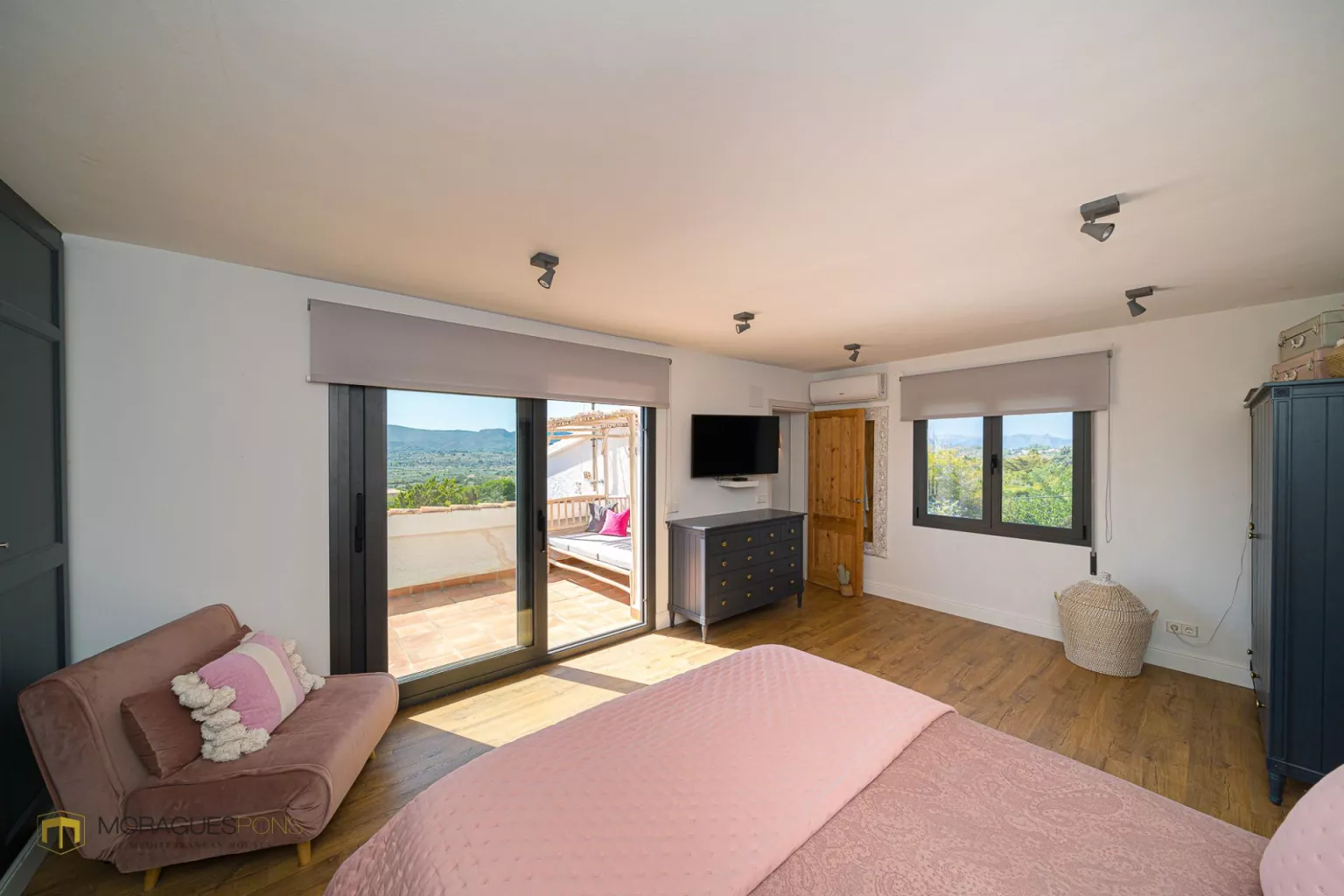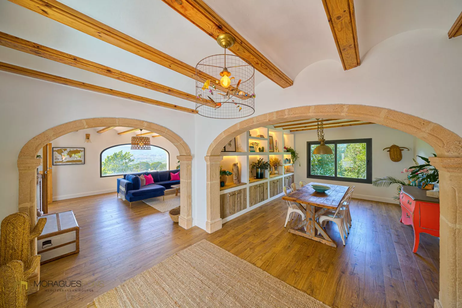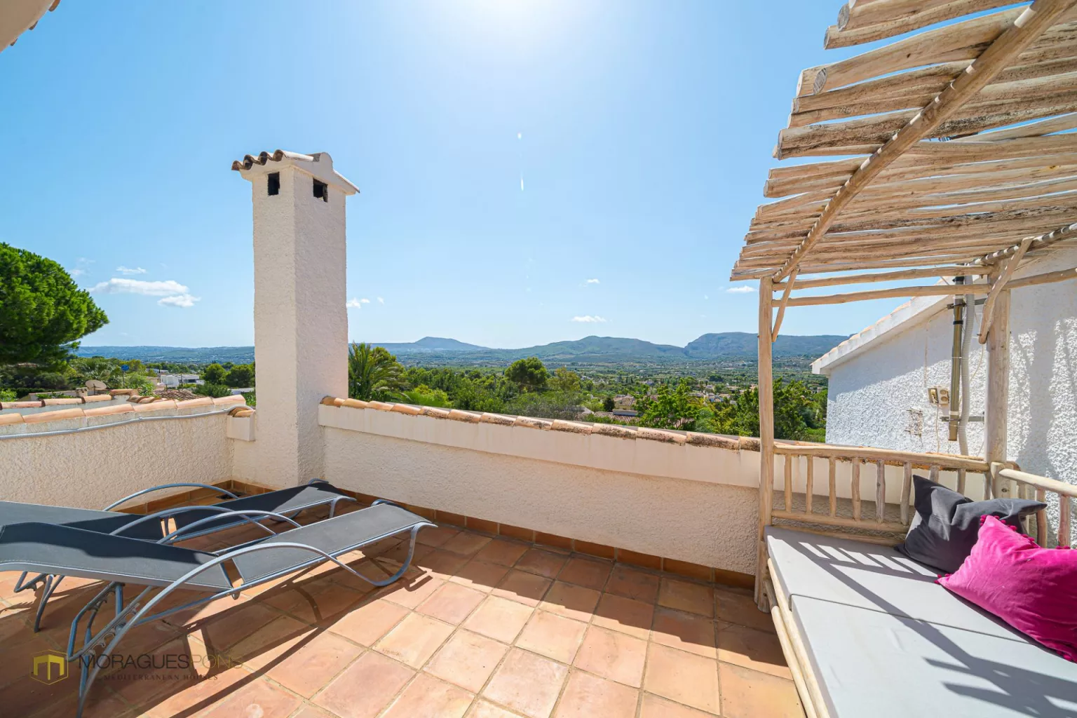 En su interior, tenemos una vivienda principal de dos alturas desde la cual se accede por un bonito porche. La planta inferior con dos habitaciones, baño, patio, zona de juegos para los mas pequeños, oficina con vistas al valle, salón y cocina abierta al comedor, así como un lavadero. En la planta superior con acceso desde el salón, tenemos la habitacion principal con baño en suite y terraza con chillout y sus vistas al macizo del Montgó.